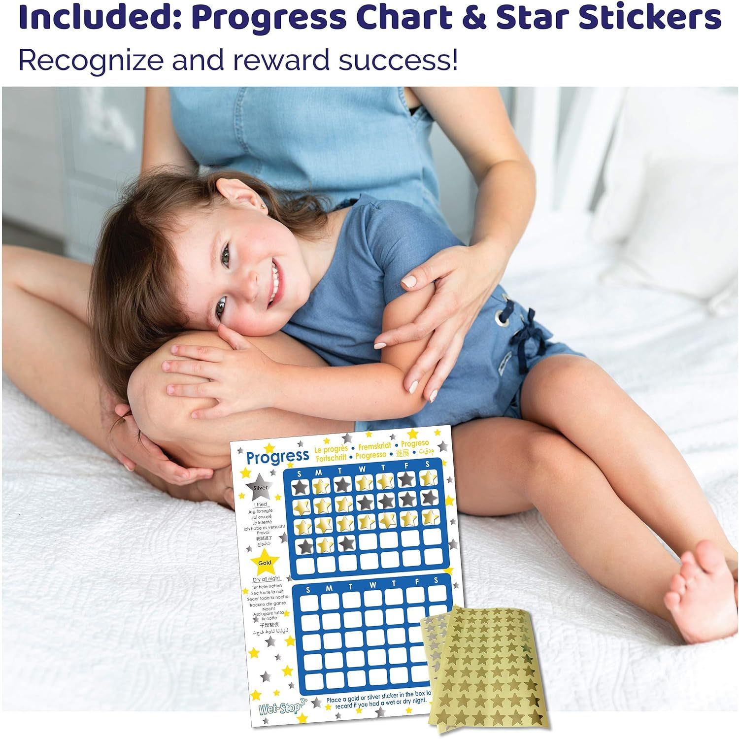 The Wet-Stop 3+ bedwetting alarm also comes with a progress chart and star stickers to fully engage your child in the training process! When your child has a dry night, celebrate their success with a gold star in the morning! An almost-dry night earns a silver star. We also include The Complete Bedwetting Book free digital download for parents.