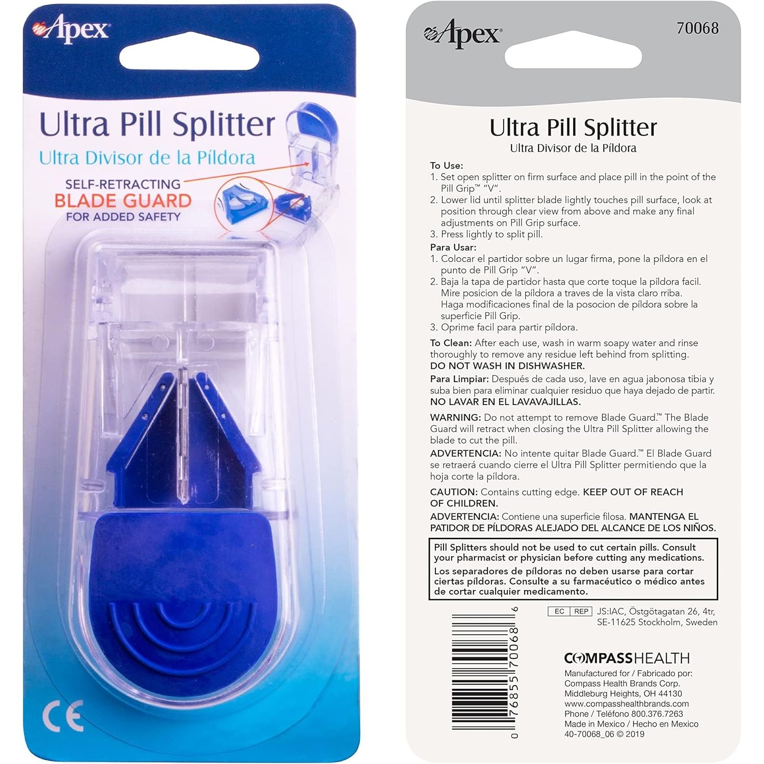 - Contains (1) Apex Ultra Pill Splitter. Made from Optical grade polycarbonate with a flexible V-shape holder to grip any size pill for accurate cutting. The contoured design has an overmold for comfort. Includes retracting blade guard for added cutting safety.