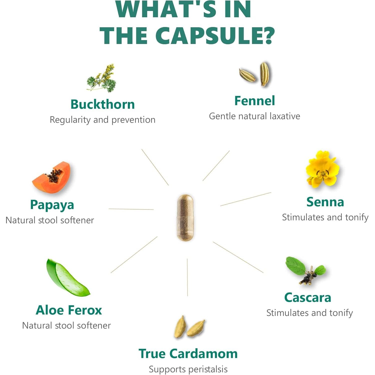 - 100% NATURAL INGREDIENTS : Carica Papaya, Aloe Ferox, Cassia Angustifolia, Rhamnus Frangula, Rhamnus Purshiana (Cascara sagrada), Elettaria Cardamome, Foeniculum Vulgare. All-natural herbal formula to ease digestion, regulate metabolism, relieve the symptoms of constipation, and most importantly help strengthen and support the digestive system.