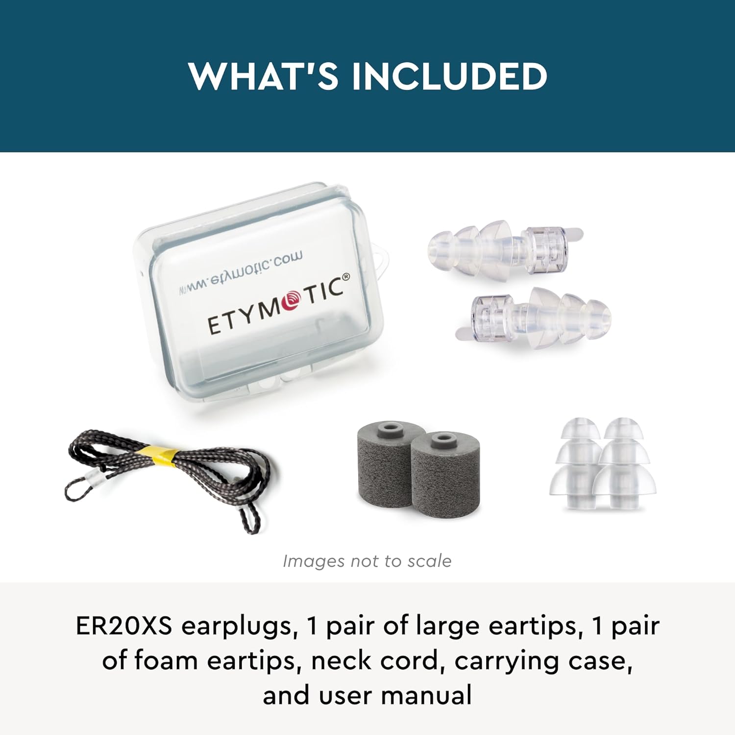 - IN THE BOX - Includes one pair of reusable ER20XS earplugs, one pair of large eartips, one pair of foam eartips, a small, flexible pull tab for easy removal, an easy-to-install neck cord, and a carrying case