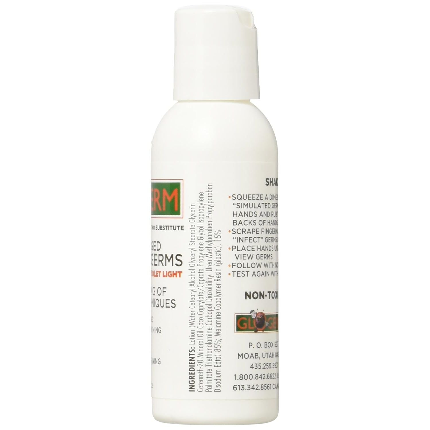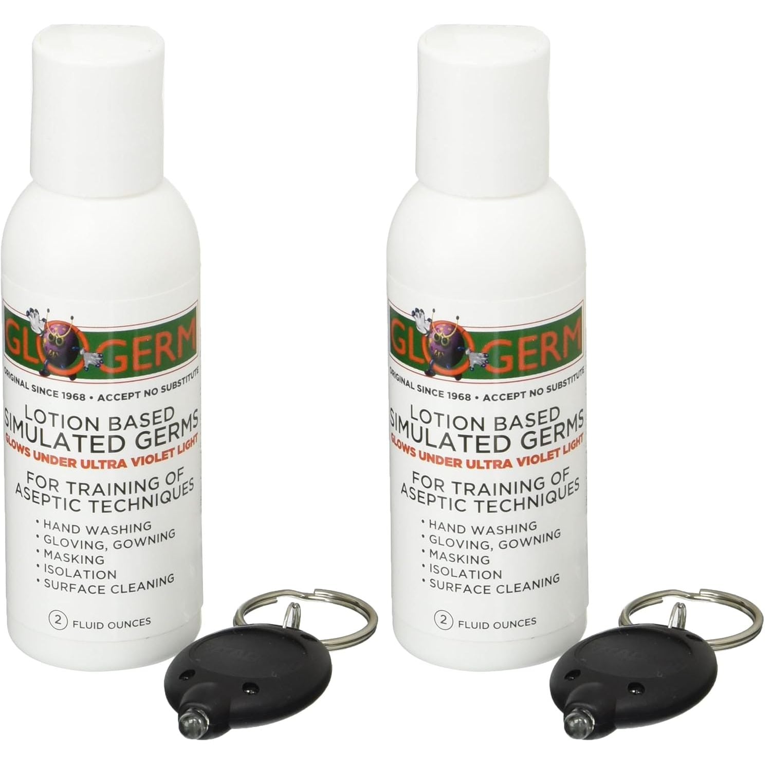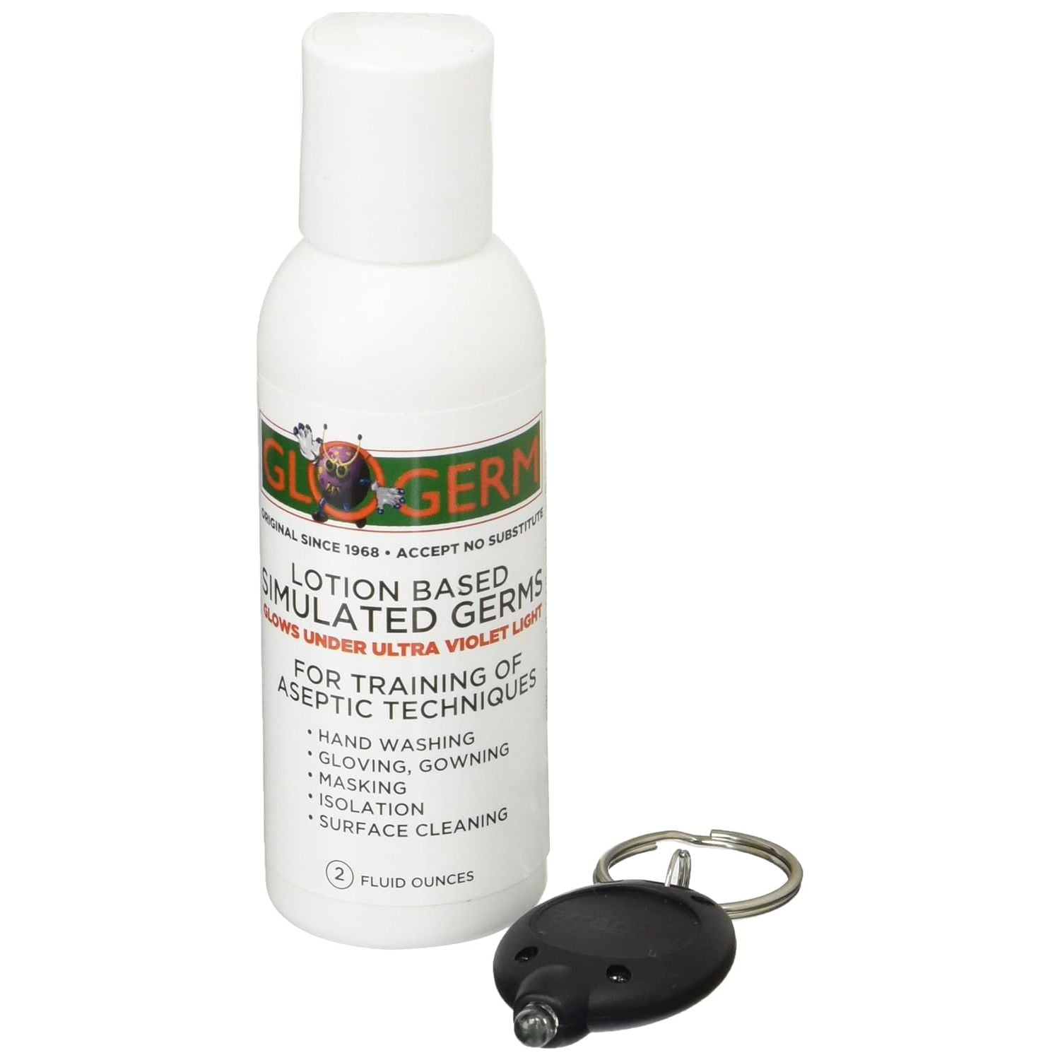 Glo Germ Mini Kit Introducing the new Mini Glo Germ kit. The mini kit is a disposable kit designed to teach up to 25 people proper handwashing. Great idea for teaching smaller groups or a onetime training. The mini kit contains 1 - 2oz bottle of gel a ultra-violet Keychain Light OR ultra-violet Pen Light informative Trainers Manual. In order to use the Keychain light, just squeeze the purple center in one hand. While bracing the silver part against your other hand, slide the purple part forward until it locks in place. Light will stay on as long as it is locked in place. The Glo Germ products demonstrate germ communication, cross-contamination, effectiveness of sanitary practices, and more! Illuminate the weaknesses in your techniques with Glo Germ and protect yourself, your customers, and your bottom line! In this age of concern over infectious diseases, security, and liability, Glo Germ is an effective tool to demonstrate handwashing, surface cleaning, hygiene, and containment techniques. It is a big mistake to assume that your employees understand the critical nature of these simple processes. You have to teach them! Not enough can be said about the importance of cleanliness, proper handwashing and infection control. Since 1968, Glo Germ has provided customers with a fun and safe product that casts a revealing glow when exposed to Glo Germ’s U.V. light, turning the invisible into germs you can see!
