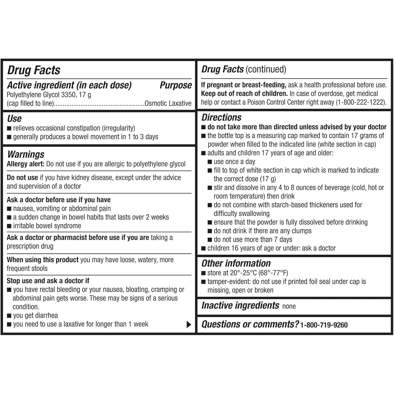 Compare to the active ingredient in MiraLAX. GoodSense Polyethylene Glycol 3350 Powder for Solution is used to relieve occasional constipation or irregularity. An osmotic laxative, it works by holding water in the stool to soften the stool and increases the frequency of bowel movements. Generally produces a bowel movement in 1 to 3 days. Unflavored grit free powder dissolves in any beverage. A gluten-free and sugar free laxative available without a prescription. For adults and children 17 years of age and older. Keep on hand so you can be ready for those times when constipation or irregularity demand your attention.