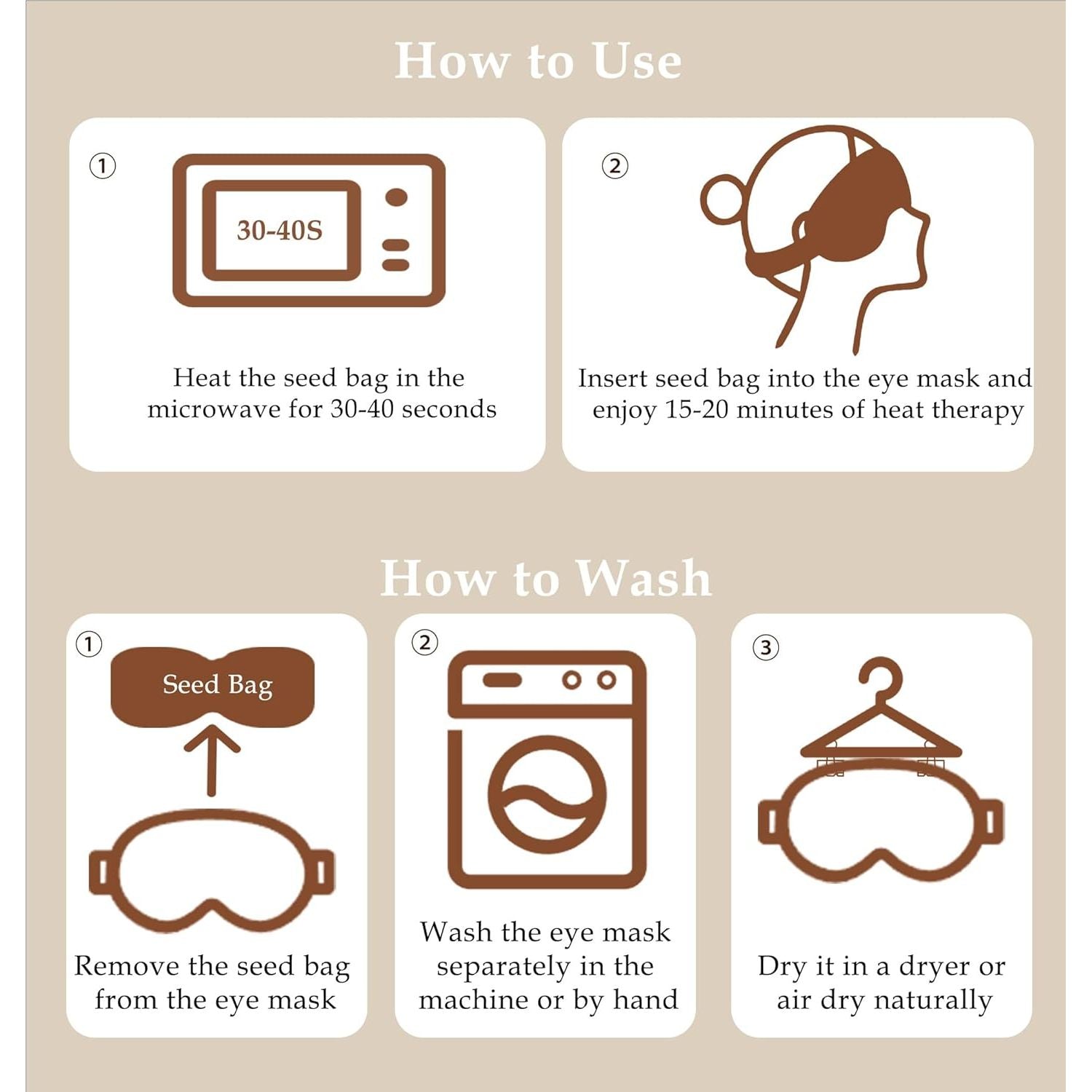 - Reusable & Washable: Microwave Warm Eye Compress internal seed pouch can be reheated separately (30-40 seconds in the microwave) — do not heat the entire mask. The outer eye mask is washable for easy care. This sustainable design provides long-term relief with soothing warmth for your eyes