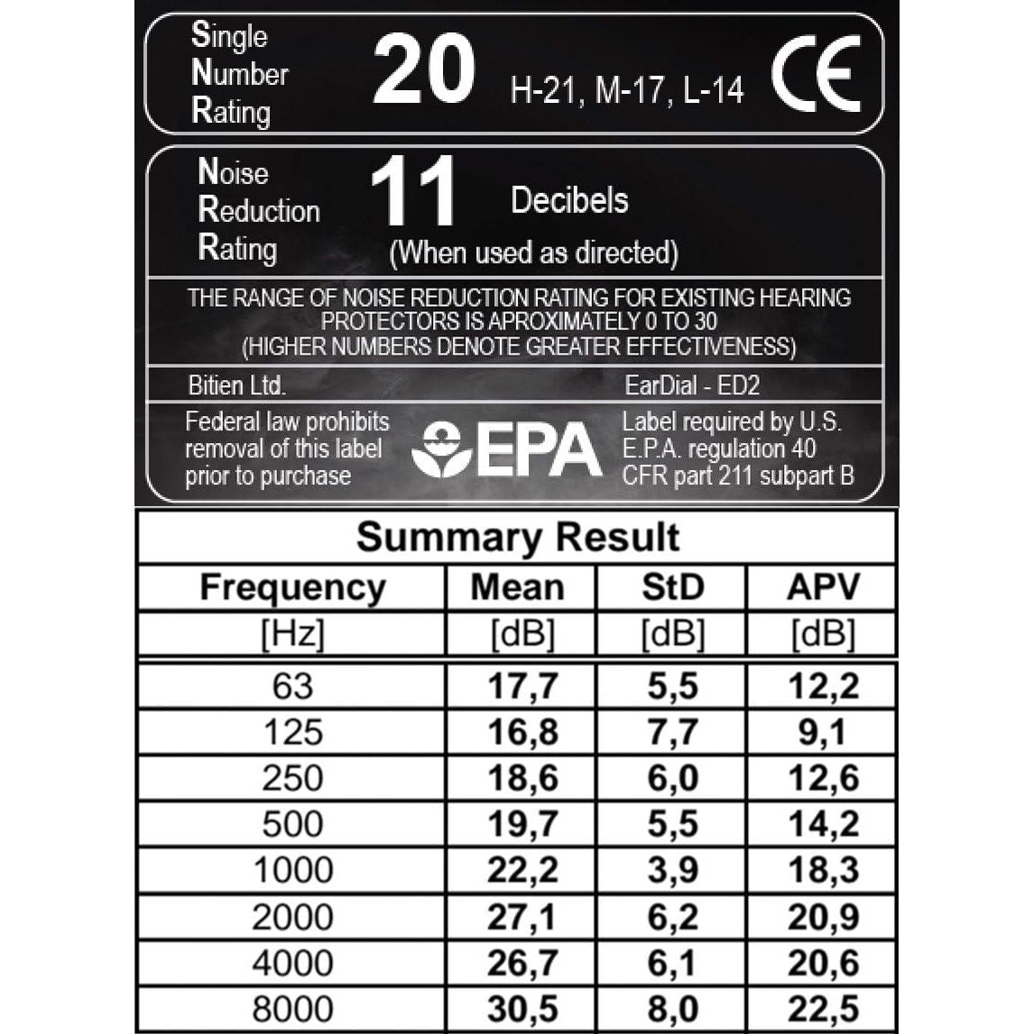 EarDial was tested by one of the best laboratories in the world, located in Germany, under the EN and ANSI standards. It provides a flat attenuation that doesn't distort sound. These are the performance results: