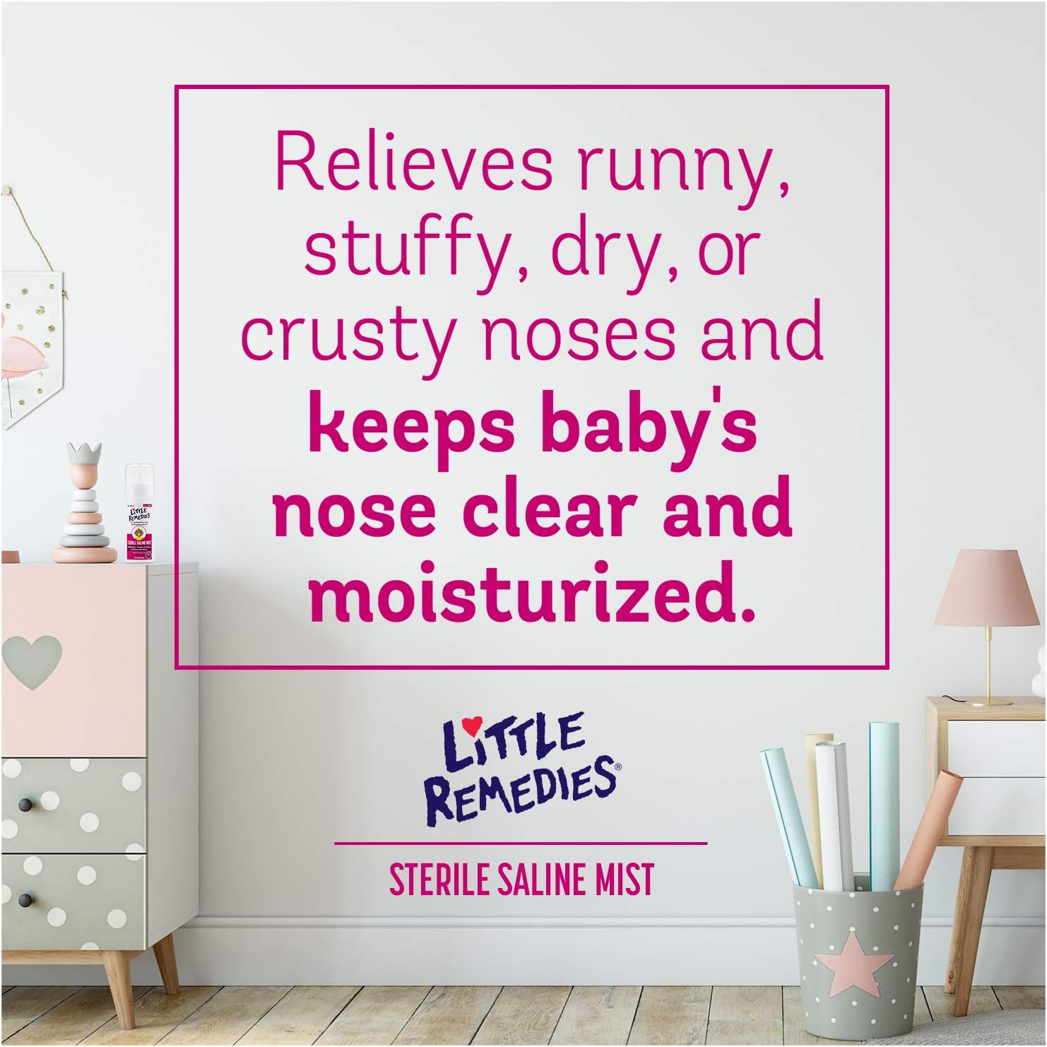 - Little Remedies Sterile Saline Nasal Spray temporarily relieves stuffy, dry, or crusty noses and keeps baby's nose clear and moisturized