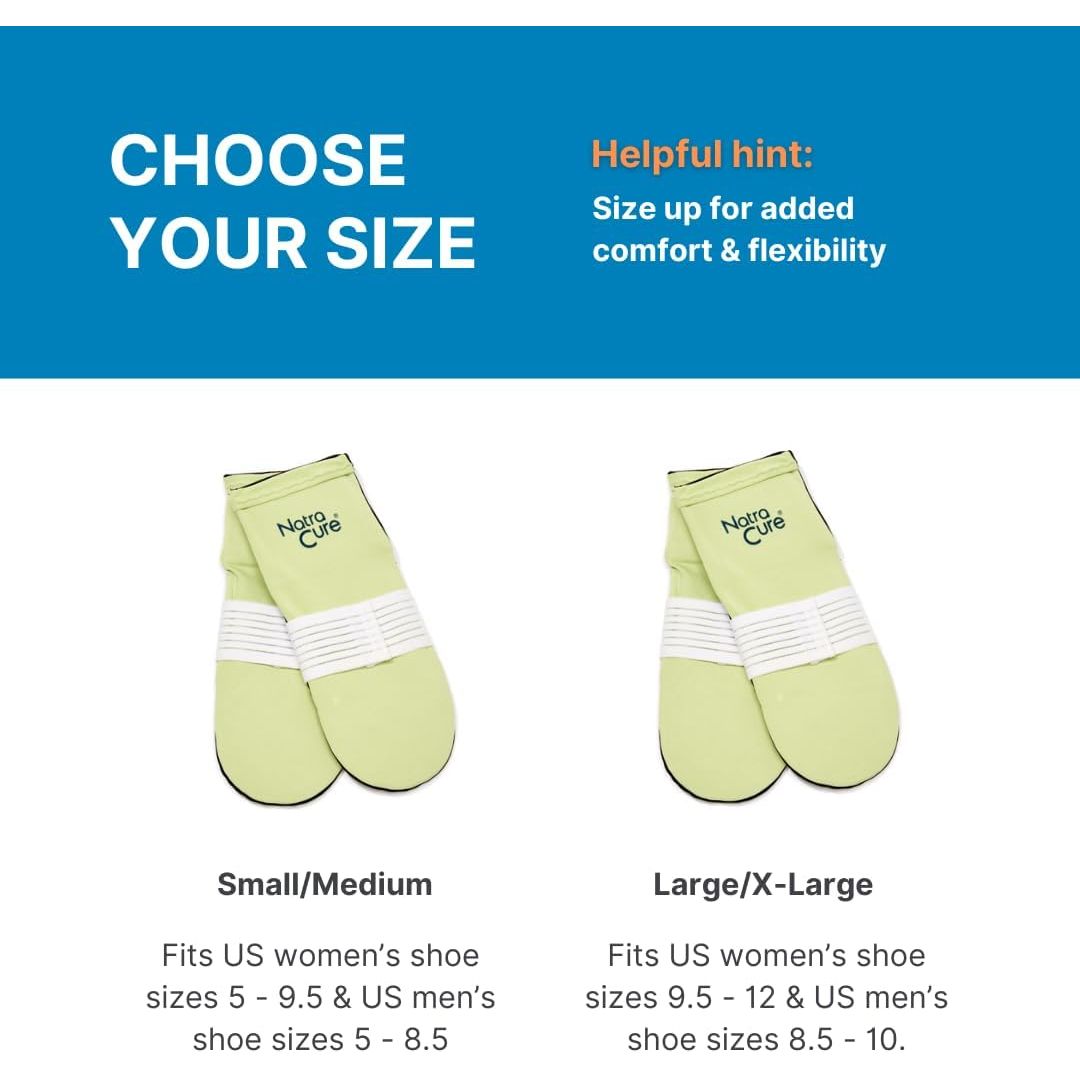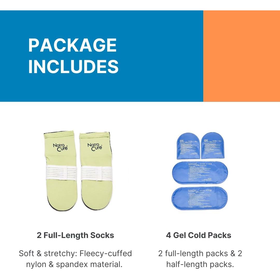 NatraCure Cold Therapy Compression Socks offer swift plantar fasciitis relief for both feet with a powerful combination of compression therapy and heat or cold therapy. Full Description Each sock has a hook-and-loop strap that gently pulls a‰ full-foot-sized gel pack into the arch of the foot for more direct and reliable contact with the fascia. Chill these cozy life-savers in the freezer or refrigerator for deep cold therapy to help reduce inflammation and pain, or heat in the microwave for penetrating heat therapy to help increase circulation. For those of us suffering from the discomfort of foot ailments, NatraCure Cold Therapy Compression Socks are a dream come true. Adjustable hook-and-loop compression strap Freeze for cold therapy Microwave for heat therapy Washable & reusable Extra gel packs available Includes:One (1) pair of socks. And each sock includes a full-length cold pack for under the foot and a half-size gel pack that can be used behind the heel. How to Use:Cold Therapy Socks are best-suited for end-of-day use. Walking in them could damage the gel packs. For work or play, try our Plantar Fasciitis Wrap. Helps With Plantar fasciitis Heel & arch pain Foot & forefoot pain Arthritis Sore muscles Swelling & inflammation Sprains & strains Sizing Men's Sizing Small/Medium: fits shoe sizes 5 to 9 Large: fits shoe sizes 8.5 & up Women's Sizing Small/Medium: fits shoe sizes 7 to 10 Large: fits shoe sizes 10 & up Watch Video