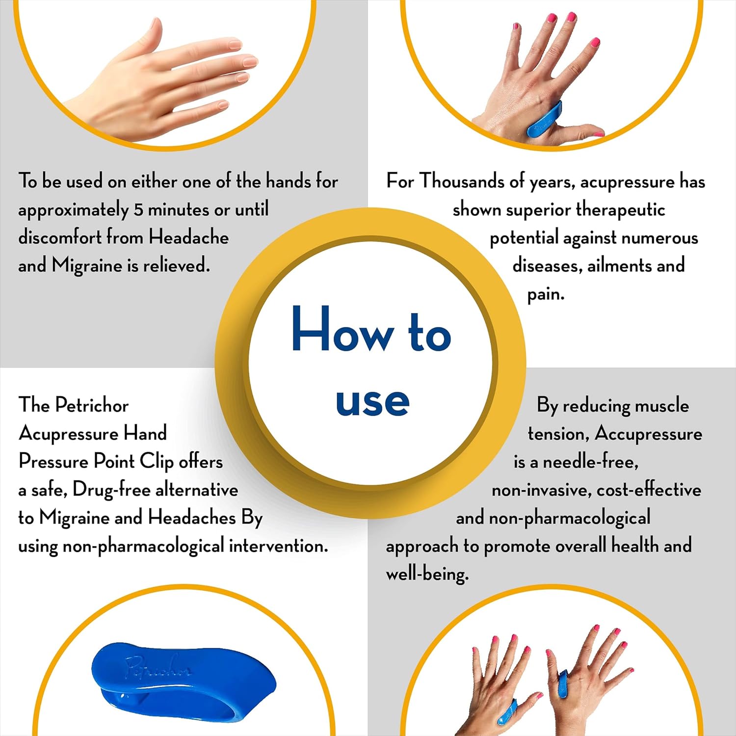 - DESIGNED BY A TEAM OF ACUPRESSURE SPECIALISTS: the Petrichor Acupressure Hand Pressure Point Clip was designed and developed using holistic knowledge from some of the best and most world-renowned Acupressure specialists alive today. This device offers proven headache and migraine pain relief.