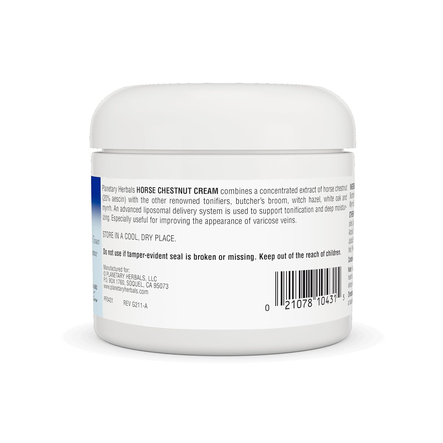 Planetary Herbals Horse Chestnut Cream may help support vein integrity, especially in the legs. It is suggest to gently massage into skin morning and night. For best results, use for at least 6 weeks.