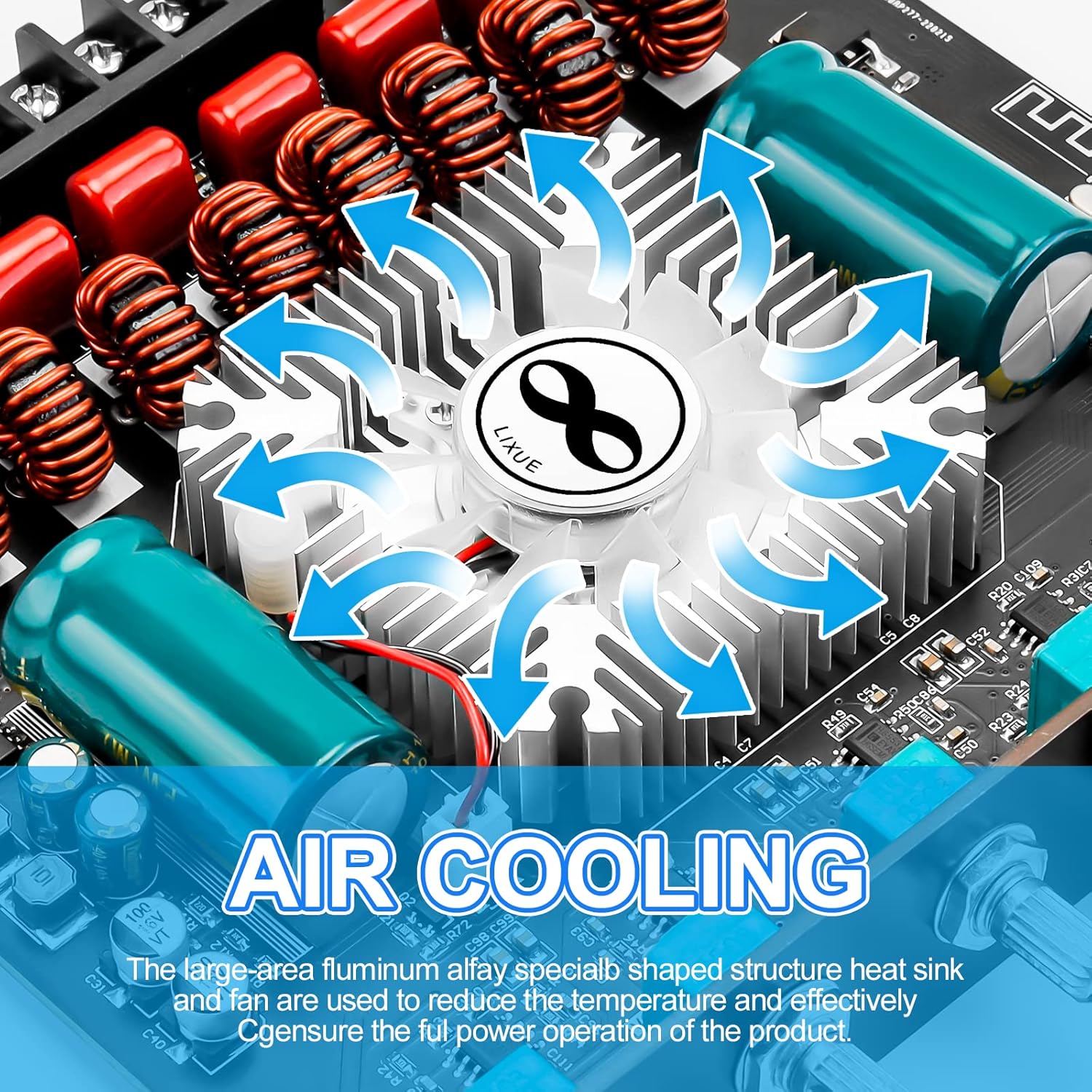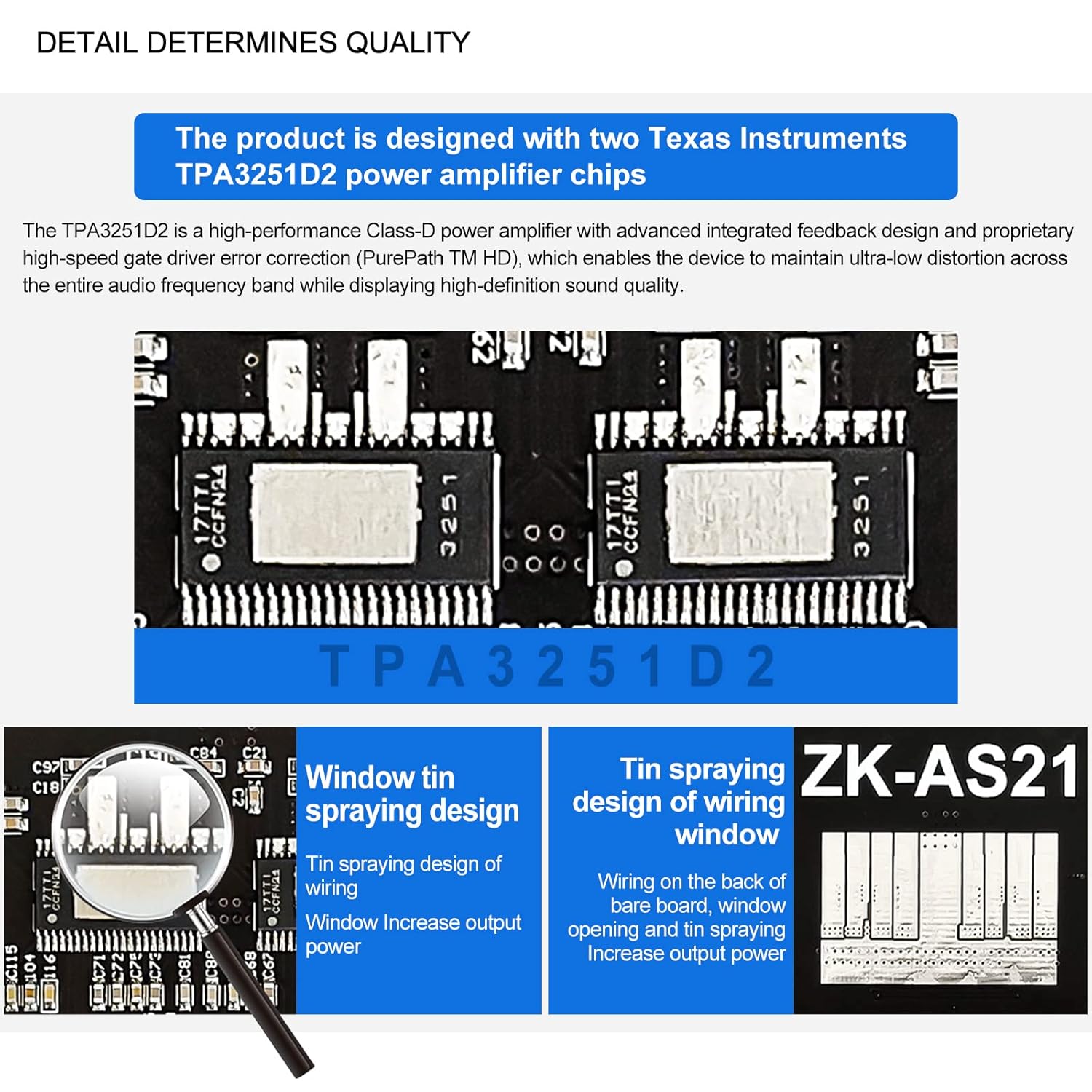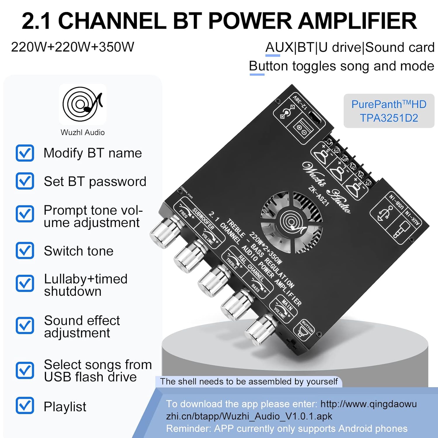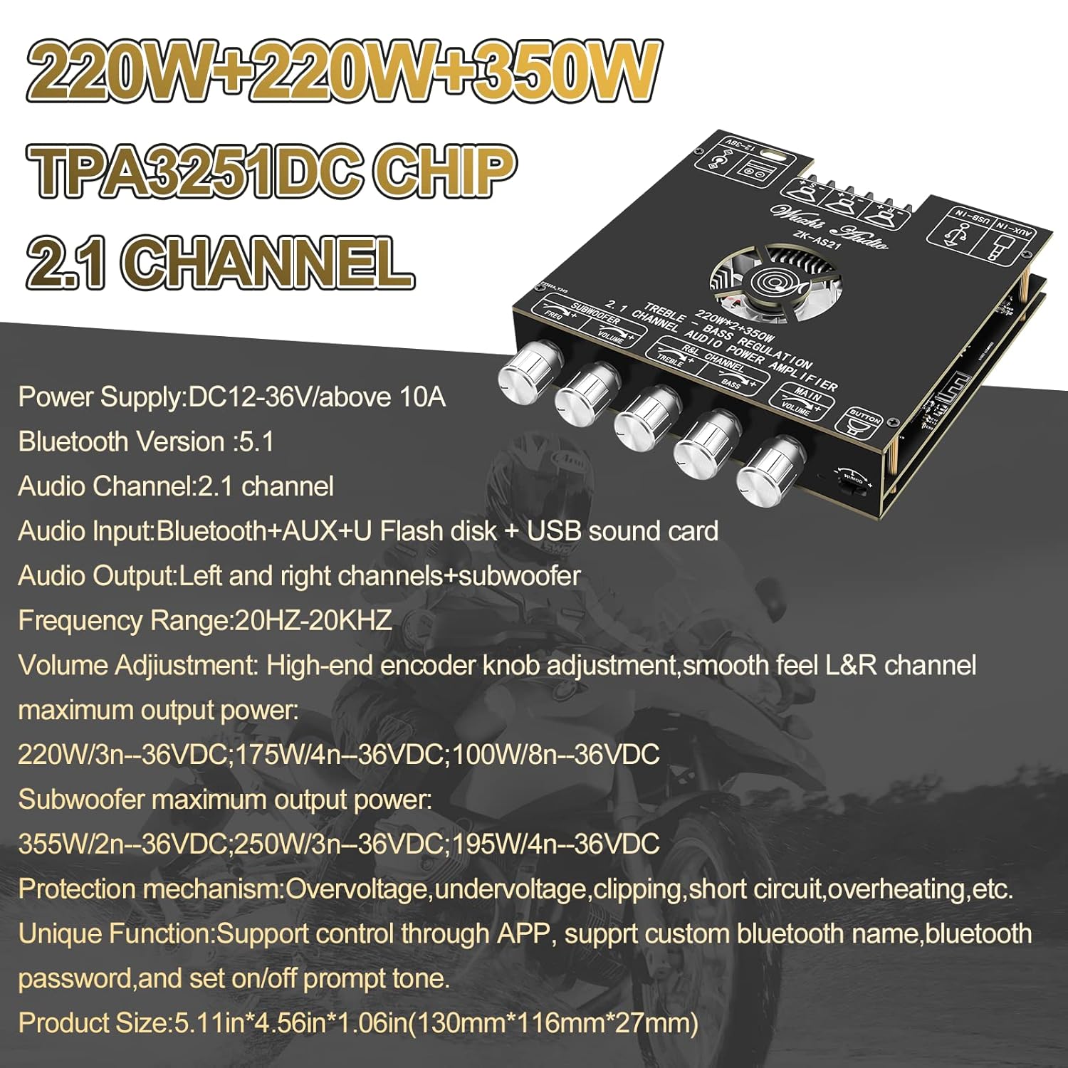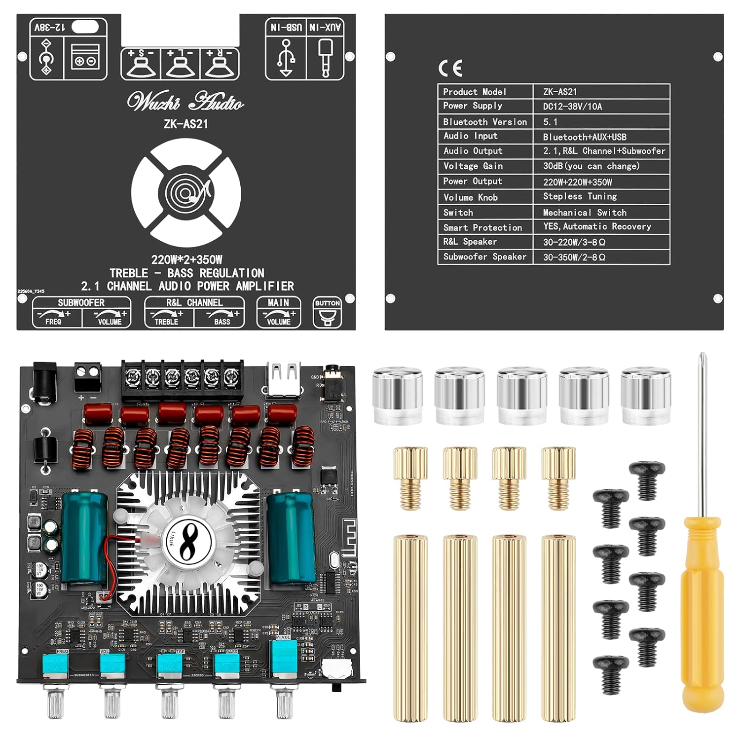 - Bluetooth Power Amplifier Board Stereo - HiFi 2.1 Channel 2X220W+350W Bluetooth 5.1 16-32V Digital Power Audio Amplifier Module Subwoofer Control with AUX/Bluetooth/USB Flash Drive (ZK-AS21)