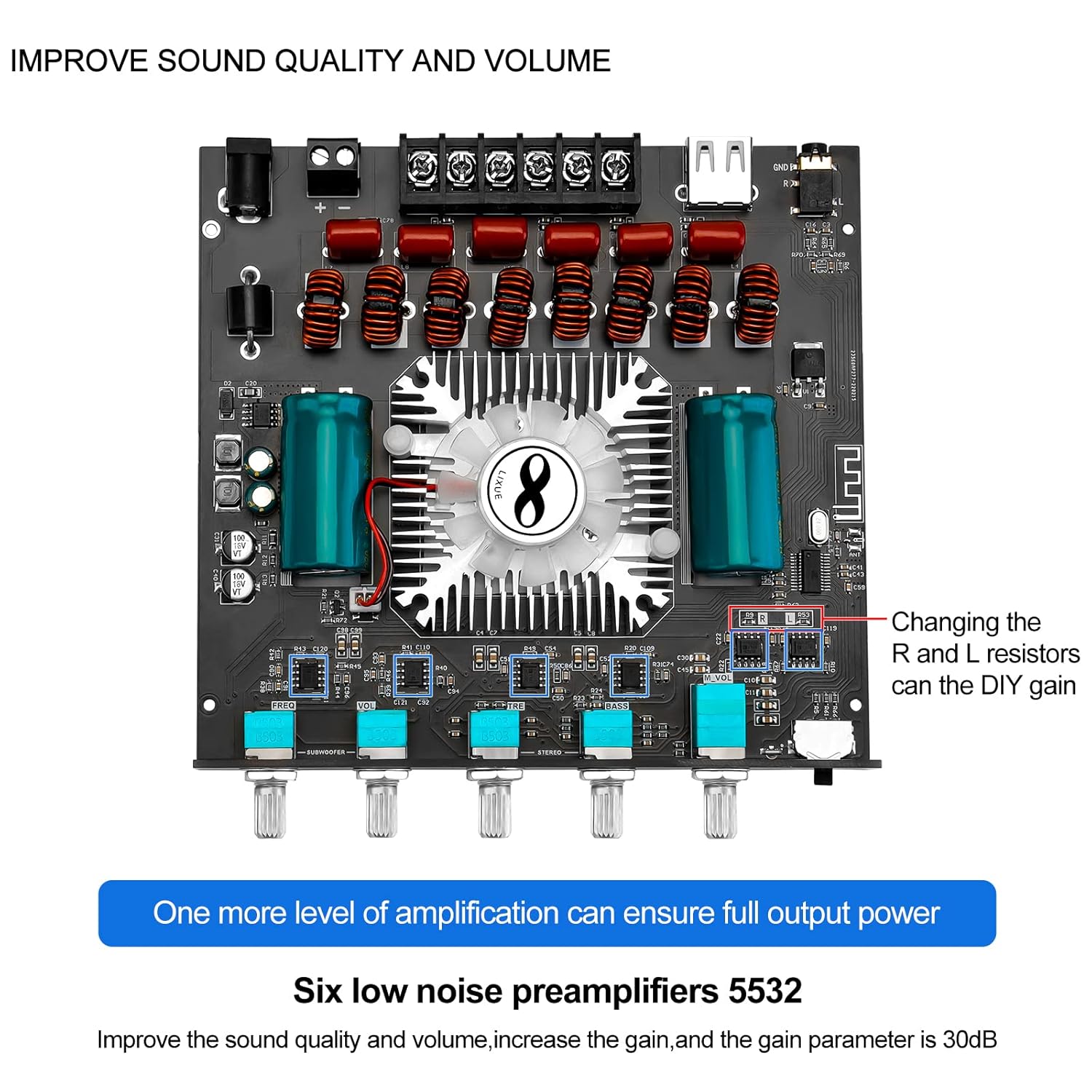 - 【HI-FI & Stereo】High quality 2.1 channel 220W+220W+350W Bluetooth 5.1 power amplifier board. With AUX, Bluetooth, U disk, USB sound card a variety of audio input methods. With two output modes of active and passive speakers, you can enjoy the music you want anytime, anywhere