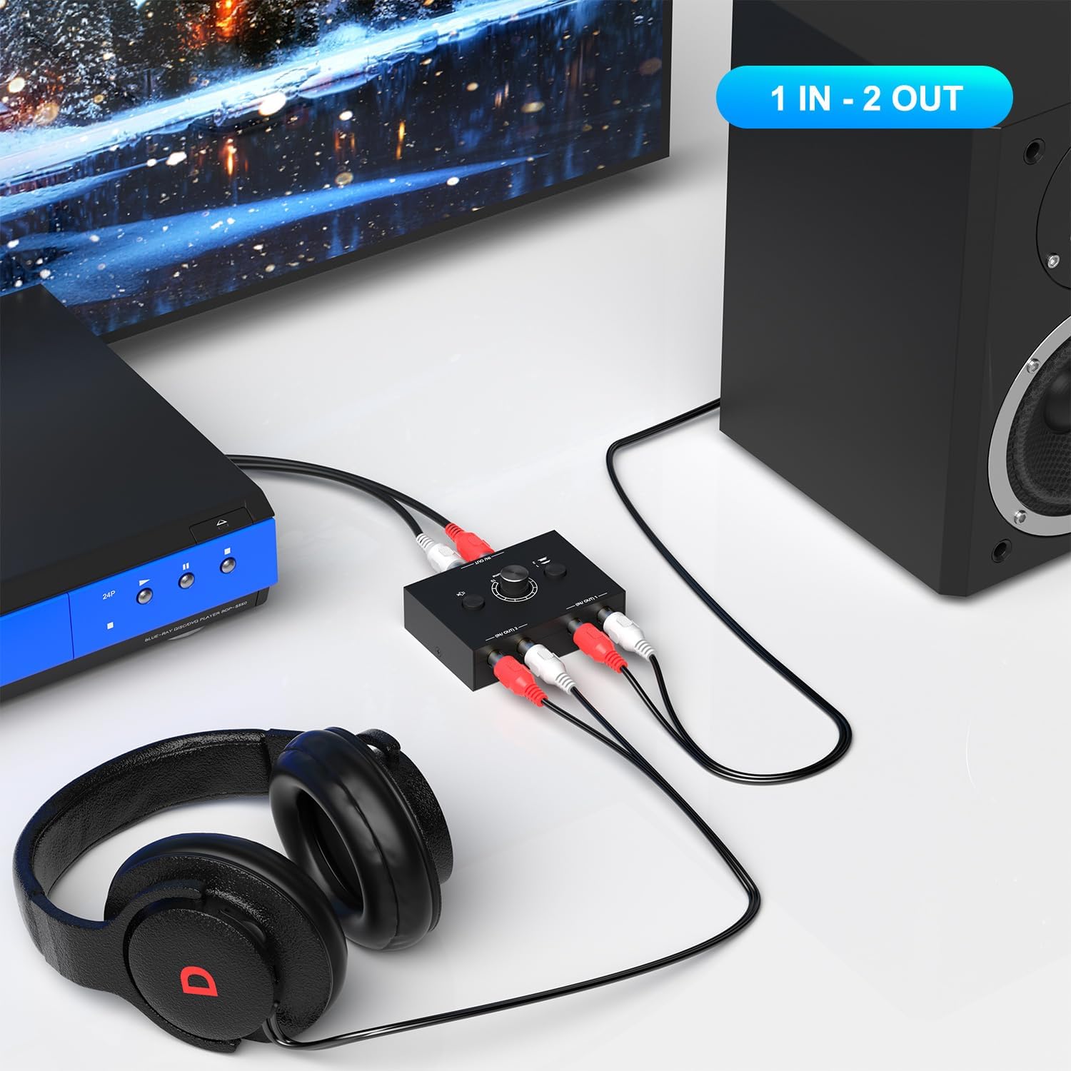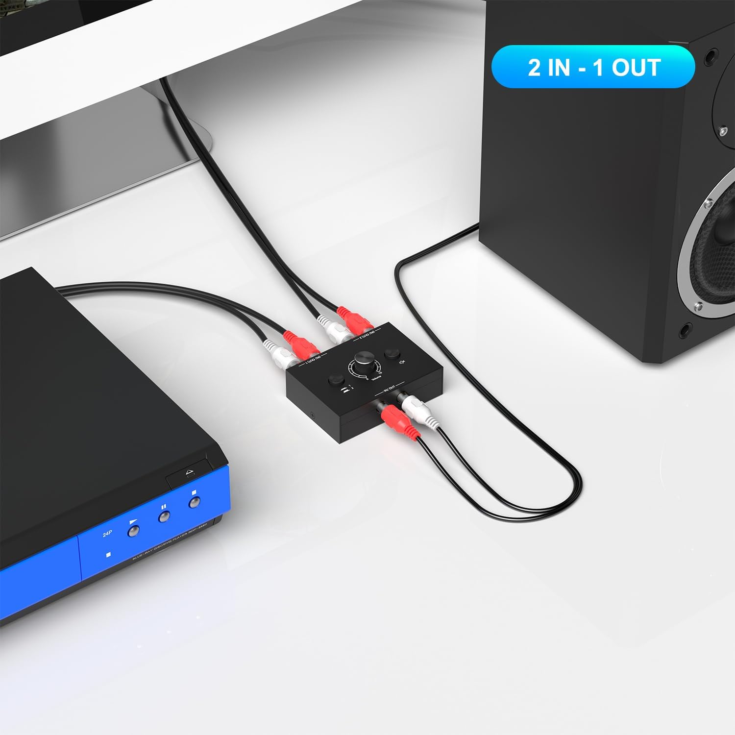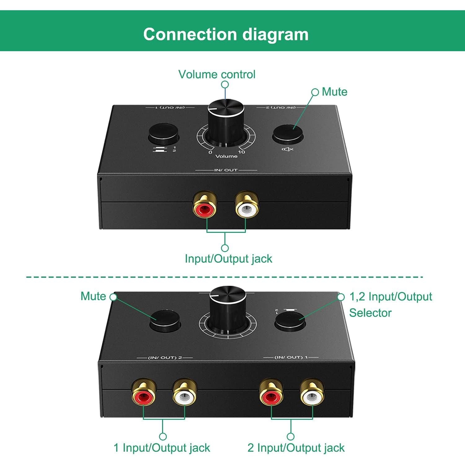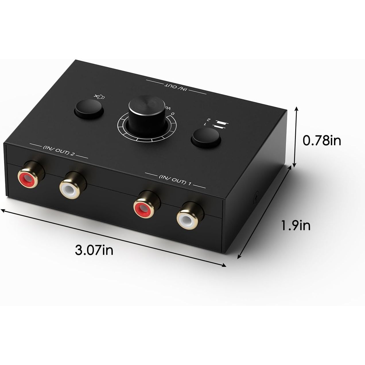 Dingsun Bi-Directional 2-Way RCA Stereo Audio Switch Do you often feel annoyed and inconvenient to replace multiple RCA cable audio equipment? Are you worried about damaging the device because you often plug in RCA cable audio? You must try Dingsun 2-Way RCA stereo audio switcher/ Selector can help you easily solve these problems, and enjoy the perfect sound quality. It is a simple and effective method for RCA wiring ※ Will not increase the sound or make the sound not fade. Simply allow you to switch between RCA cabler without getting in the way. ※Supporting Bi-Directional Audio Switcher (2 Input-1 Output /1 Input-2 Output) ※ The passive RCA switch has a sturdy construction, all metal, beautiful appearance and reasonable design. ※ Simple operation, Plug and play, easy to use, no external power required. ※ Connect the RCA output cables of 2 different home audio type devices to the RCA input of our device, and easily switch by the switch button. RCA two-way audio switch is simple to use: ➊. Connect to any IN/OUT port of the product through the RCA stereo cable (red and white left and right channel cables). According to your needs, choose 1 input 2 output or 2 input 1 output, the product supports two-way use. ➋. Use the switcher button (1/2) to select your input or output port.. NOTE: 📢The product does not support simultaneous output of 2 audio sources, only one audio output can be selected at a time. Please use a high-quality RCA stereo audio cable. Colour: Black Size: 3*2.2*0.86 inches Weight: 4 ounces Material: all metal Note: RCA stereo cable is not included in the package, you need to configure it yourself. Support friendly customer service and warranty.