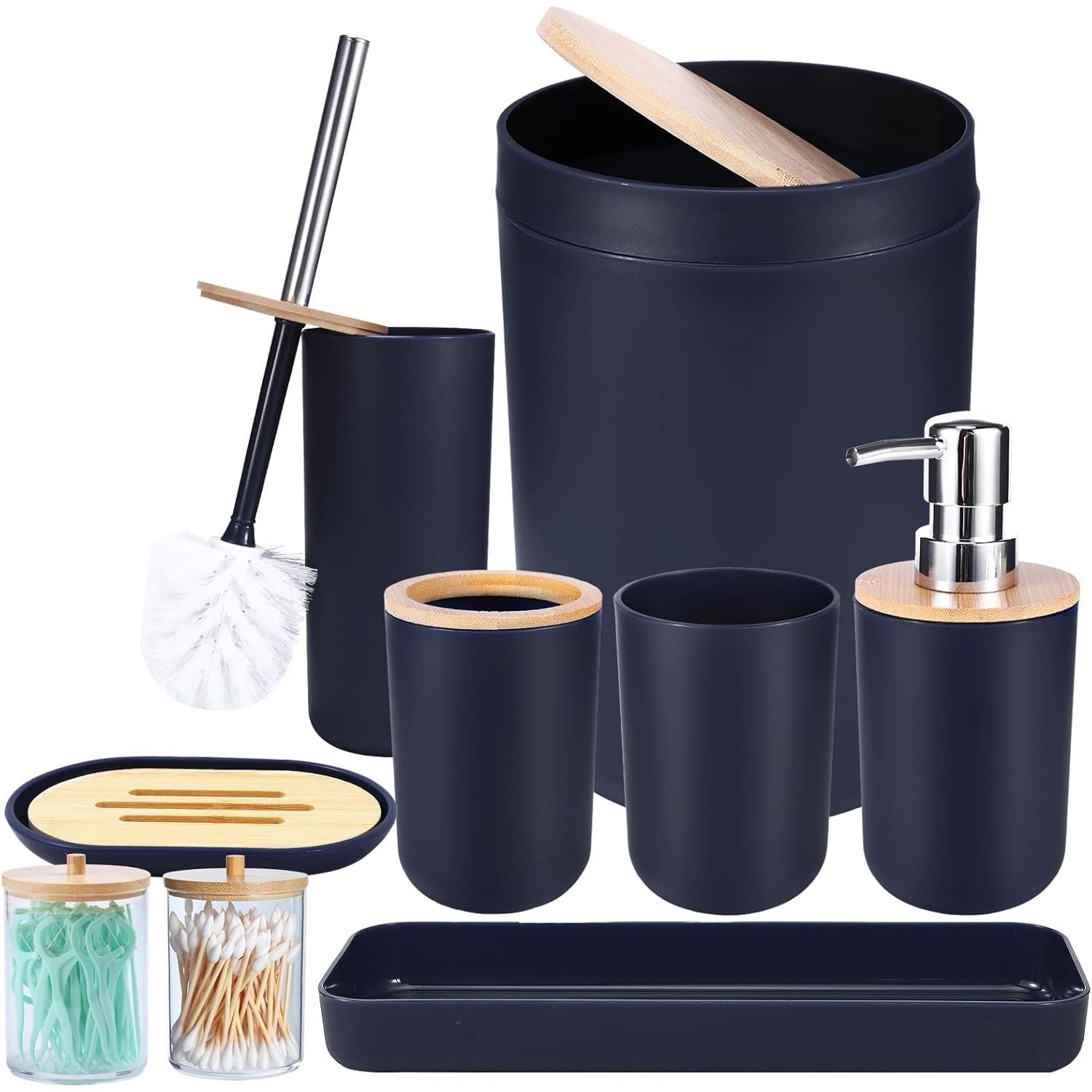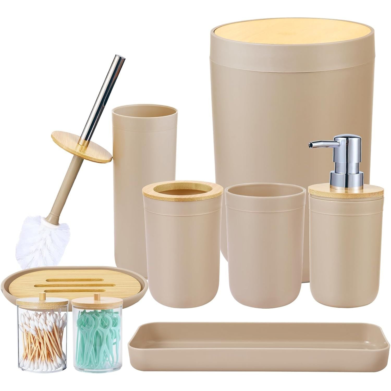 - MULTIFUNCTIONAL BATHROOM ACCESSORY SET: 8 pieces bathroom accessories set complete, including 1*toothbrush holder, 1*toothbrush cup, 1*soap dispenser, 1*soap dish, 1*toilet brush holder, 1*trash can, 2*Qtip holder. Makes the bathroom both well organized and adds a simple textured style.