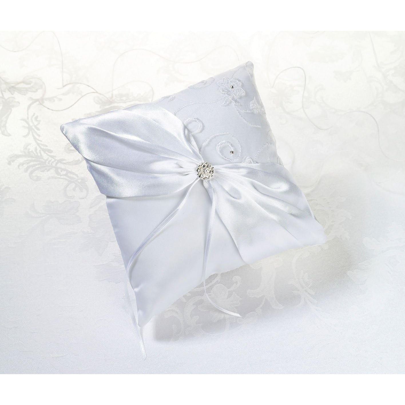 Lillian Rose 7. 5" White Lace Ring Pillow. Measuring 7. 5", this stylish ring pillow is covered in white satin. The top right corner of the pillow's front is covered in white lace accented by rhinestones. A white sash is buckled with a silver rhinestone ornament and white ribbon.