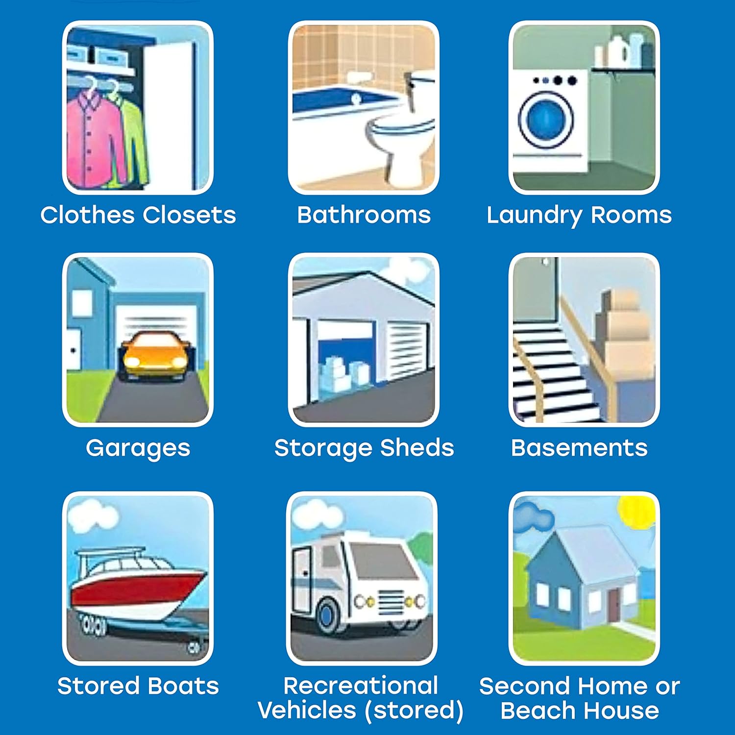 - PERFECT FOR CLOSETS, bathrooms, laundry rooms, pantries, storage, basements, garages, stored boats and RVs.