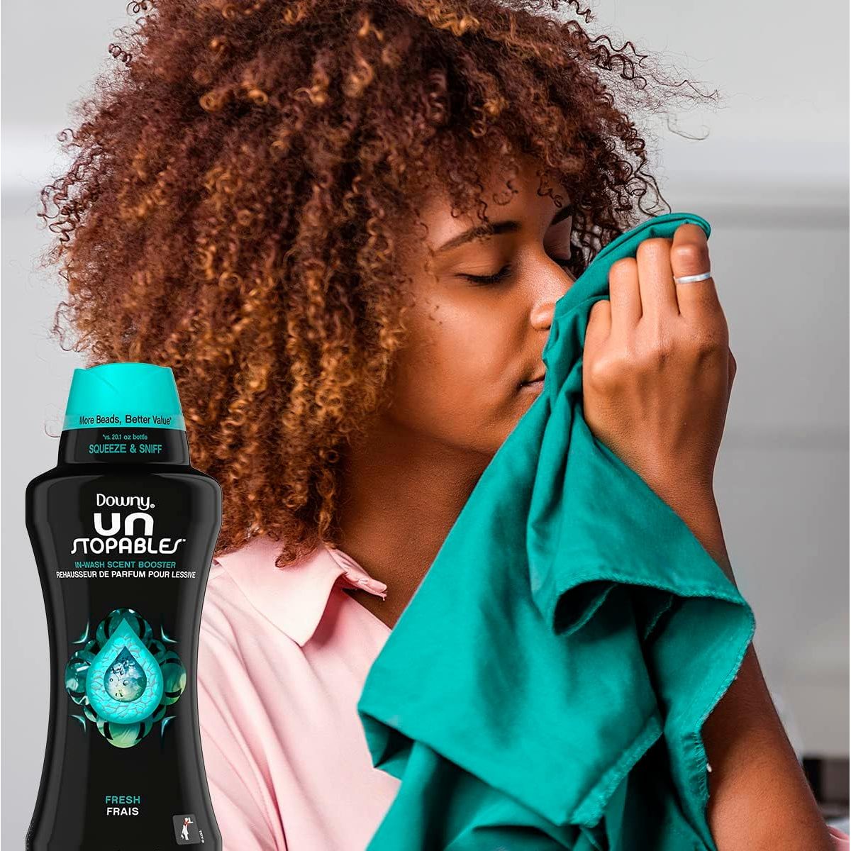 Downy Unstopables FRESH In-Wash Scent Booster beads are small laundry scent beads that work inside your washing machine, giving your laundry up to 12 weeks of freshness.* Before adding clothes, simply shake as many Downy Unstopables scent beads as desired into the cap, and then toss into the washer drum. Use scent booster beads along with your laundry detergent and fabric softener for long-lasting freshness. Add to each load of laundry for fresh, delightful-smelling clothes, sheets, and towels. It’s a fresh too feisty to quit.