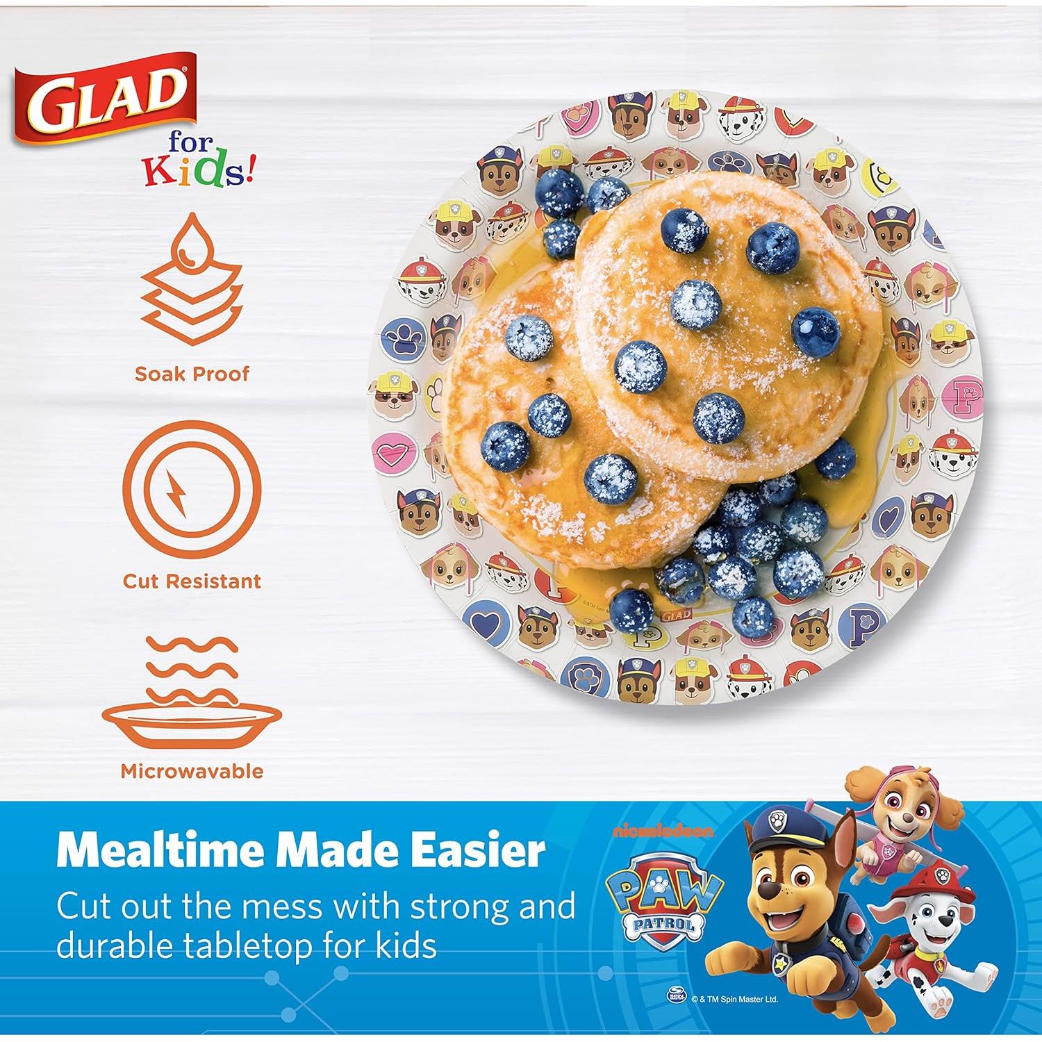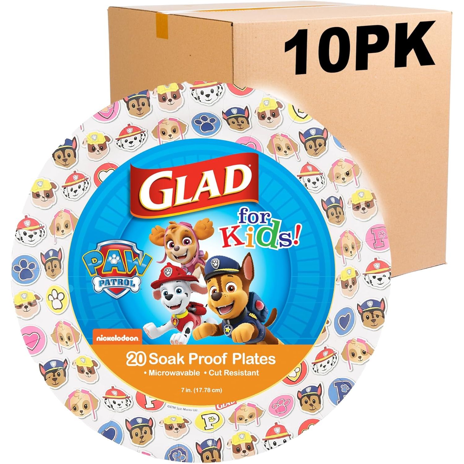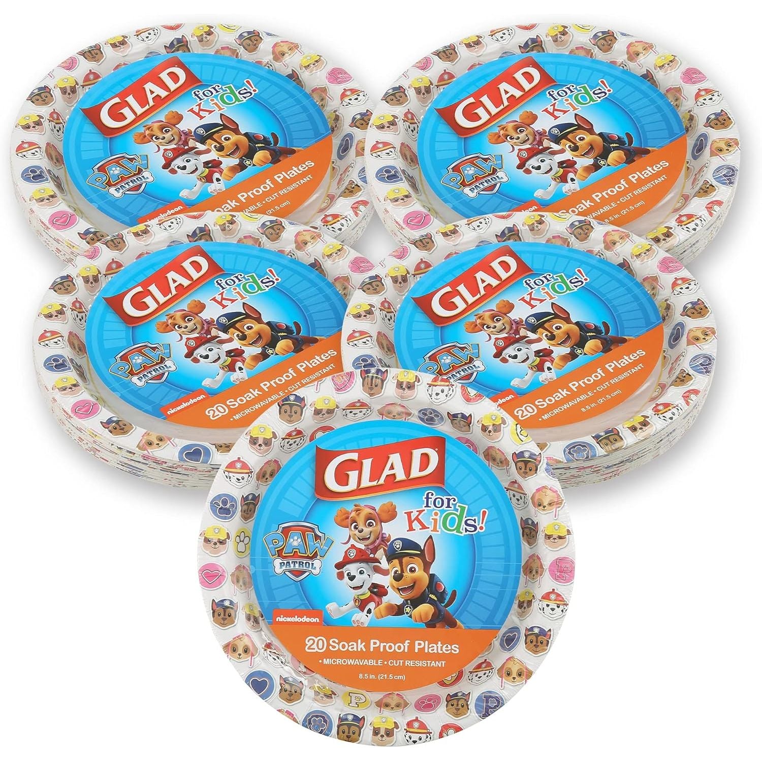 - KID FRIENDLY PAW PATROL PAPER PLATES – The adorable emoji Paw Patrol print on these kid-friendly white Glad for Kids Paper Plates are designed to make mealtime fun for everyone. Your toddler won't mind digging into veggies with the Paw Patrol at his or her side