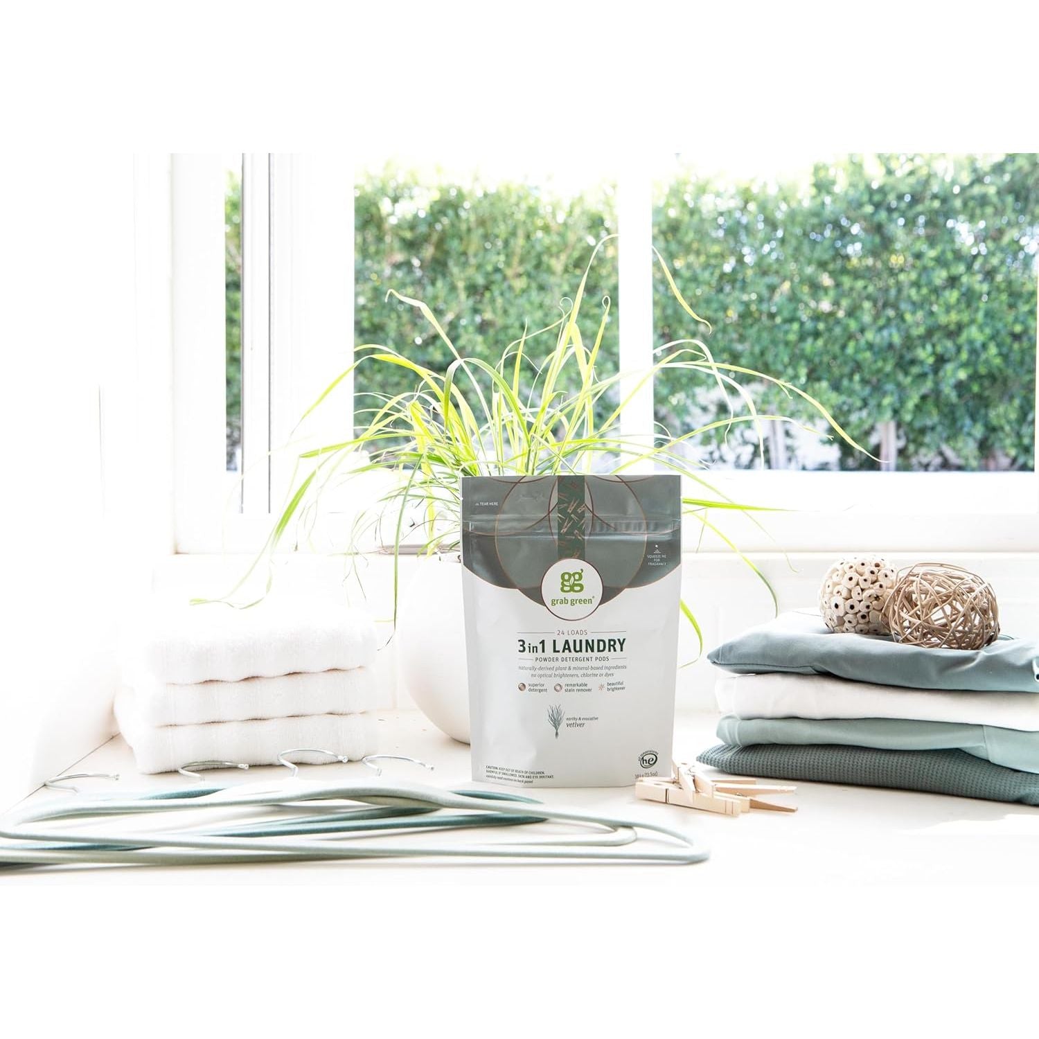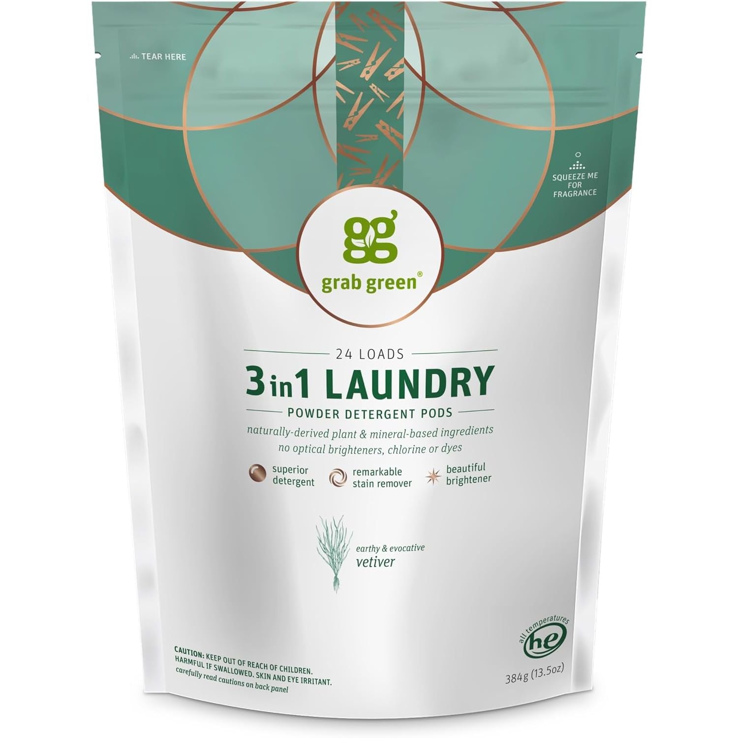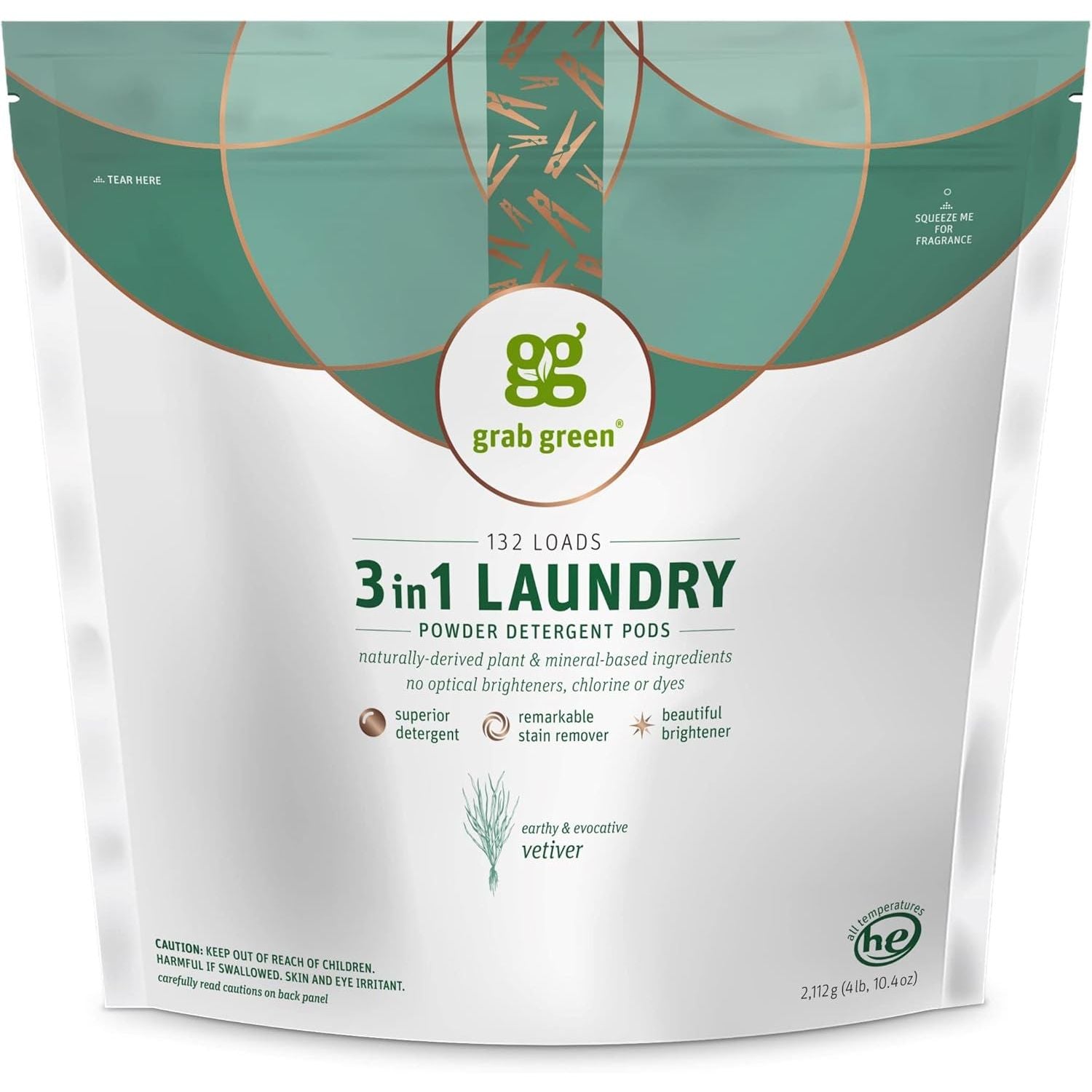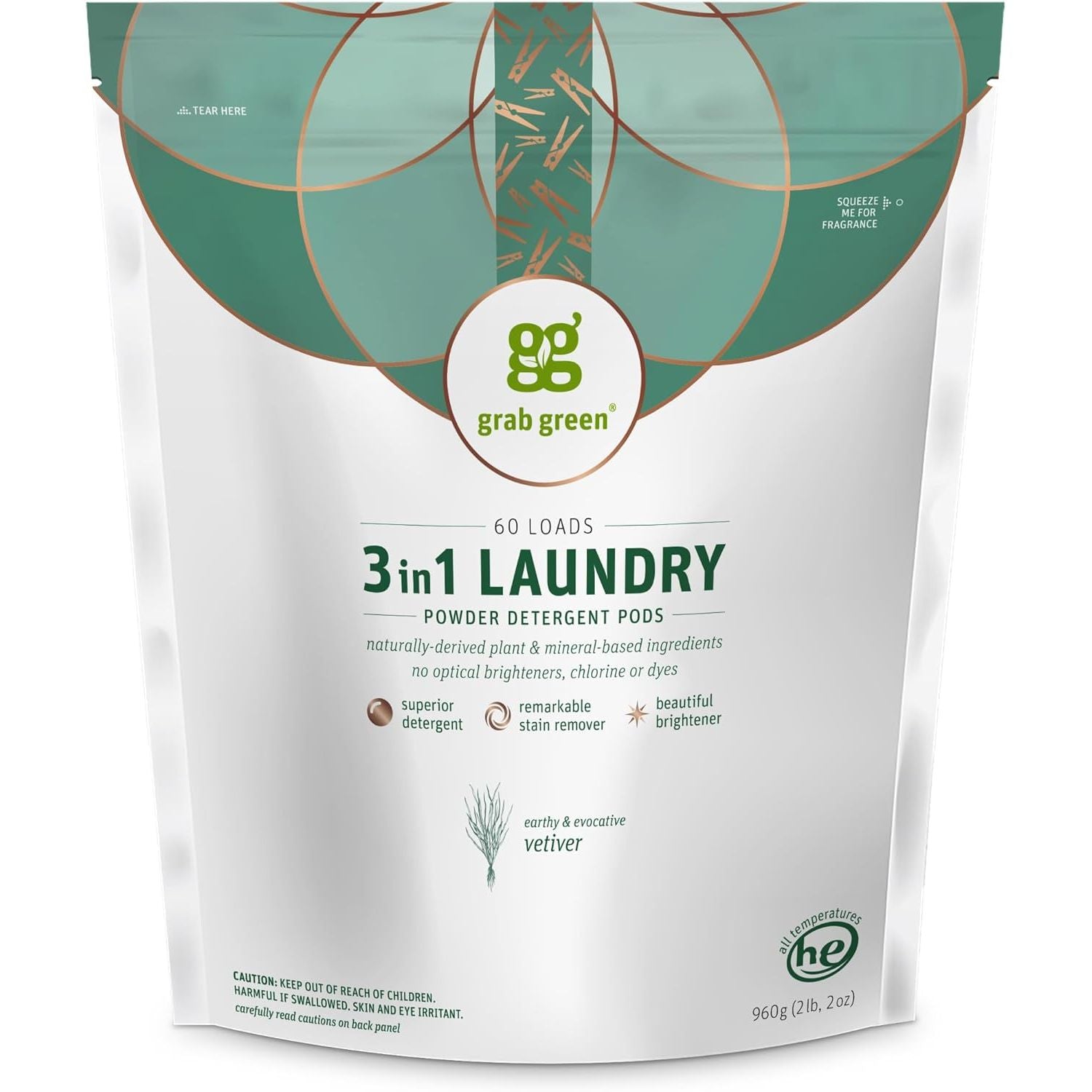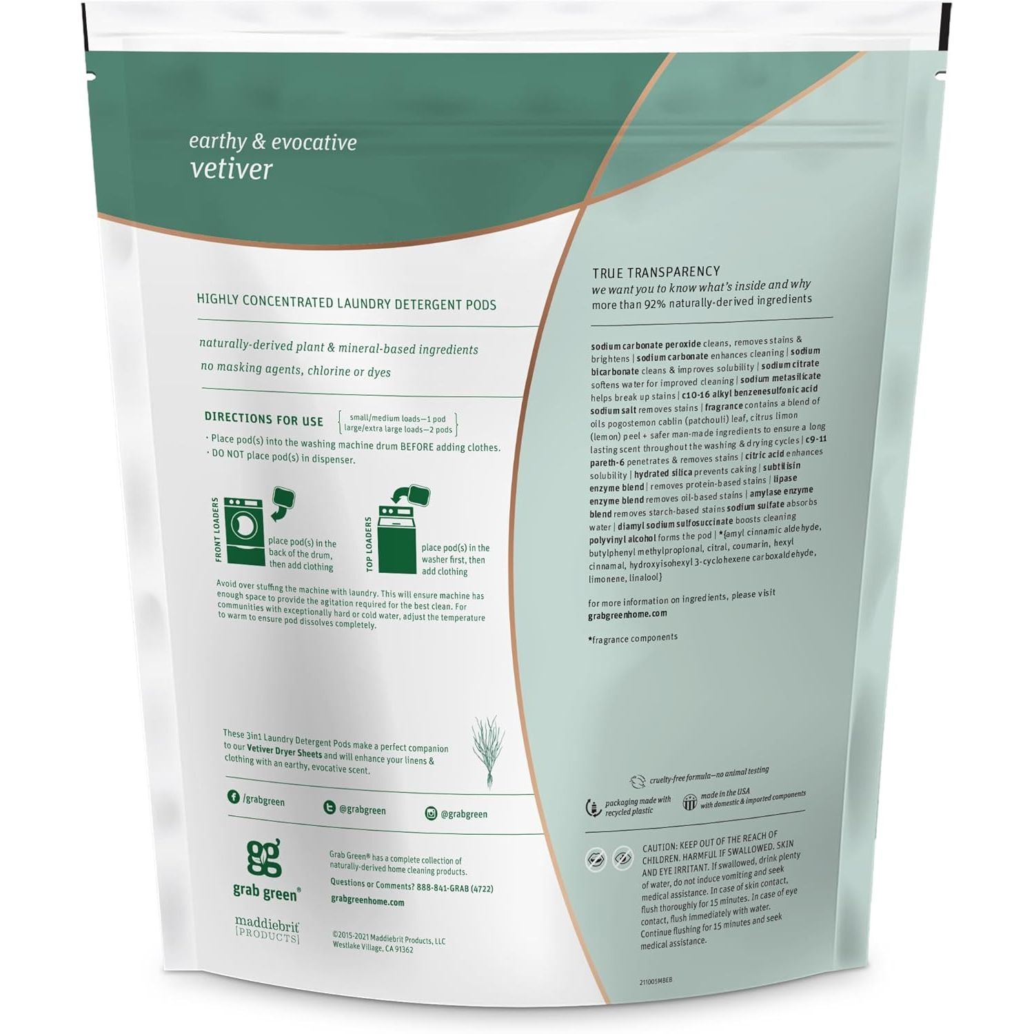 - Contains: 1- 60 Pod Bag of Grab Green Natural Vetiver 3in1 Laundry Detergent Pods. Our velcro closure bags are convenient and easy to use, no hassling with frustrating zip closures