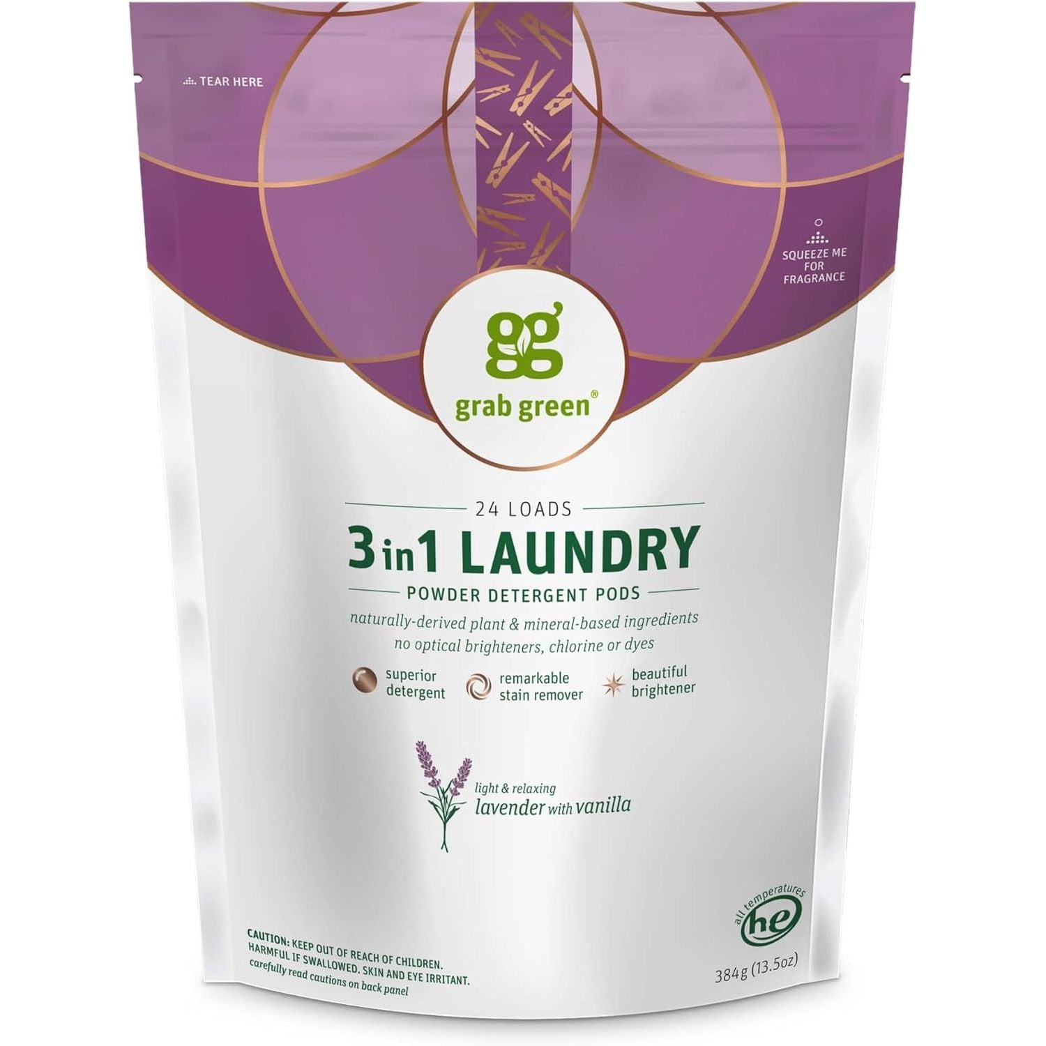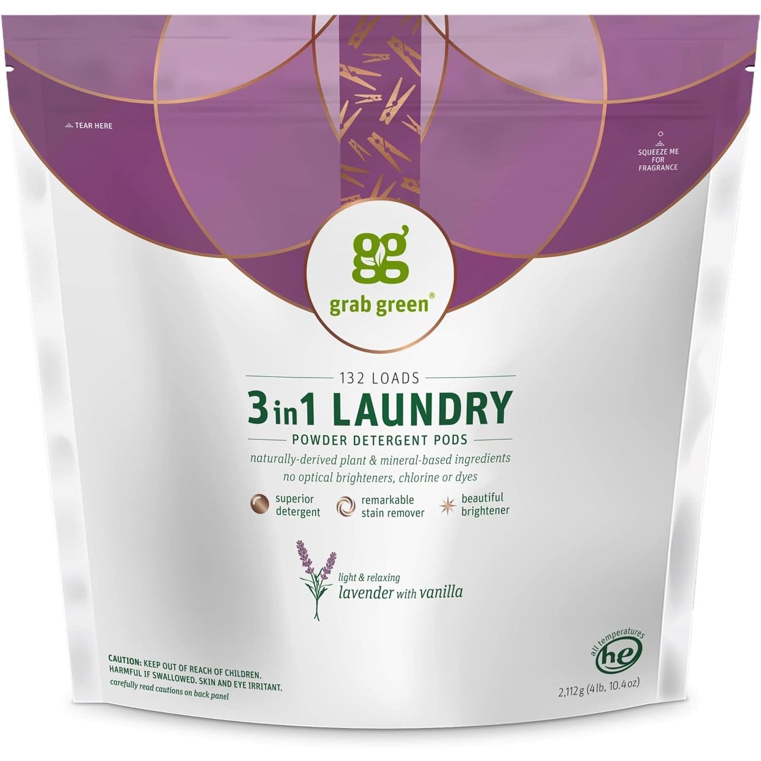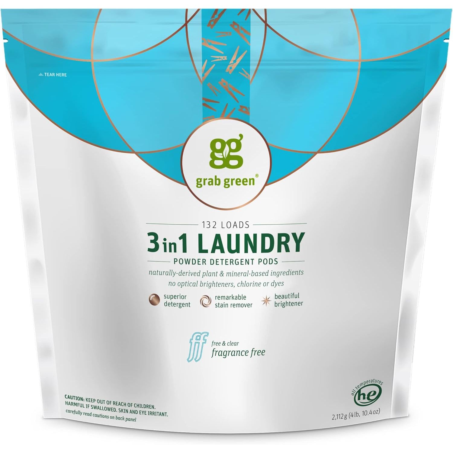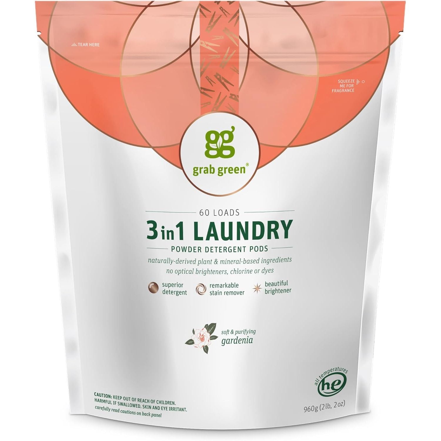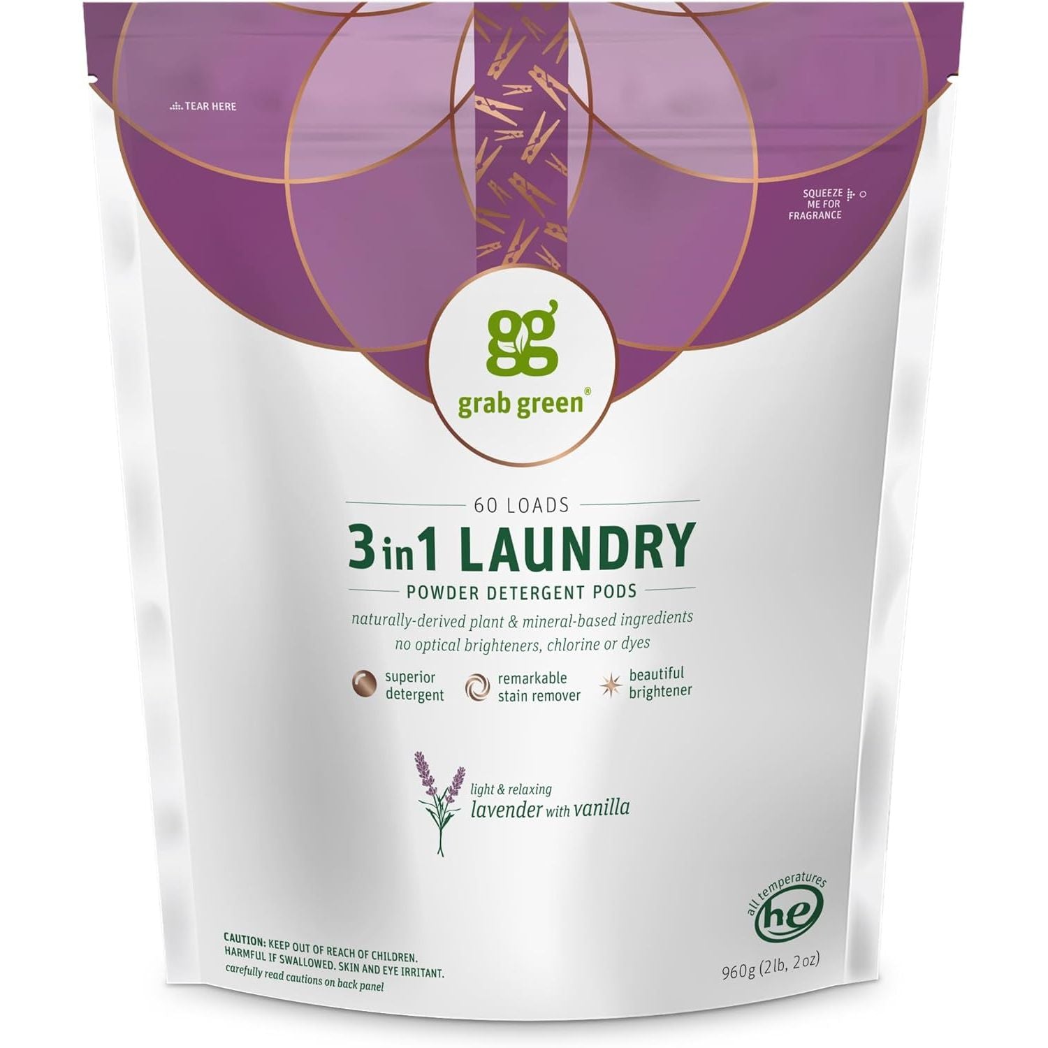 - Contains: 1- 60 Pod Bag of Grab Green Natural Vetiver 3in1 Laundry Detergent Pods. Our velcro closure bags are convenient and easy to use, no hassling with frustrating zip closures