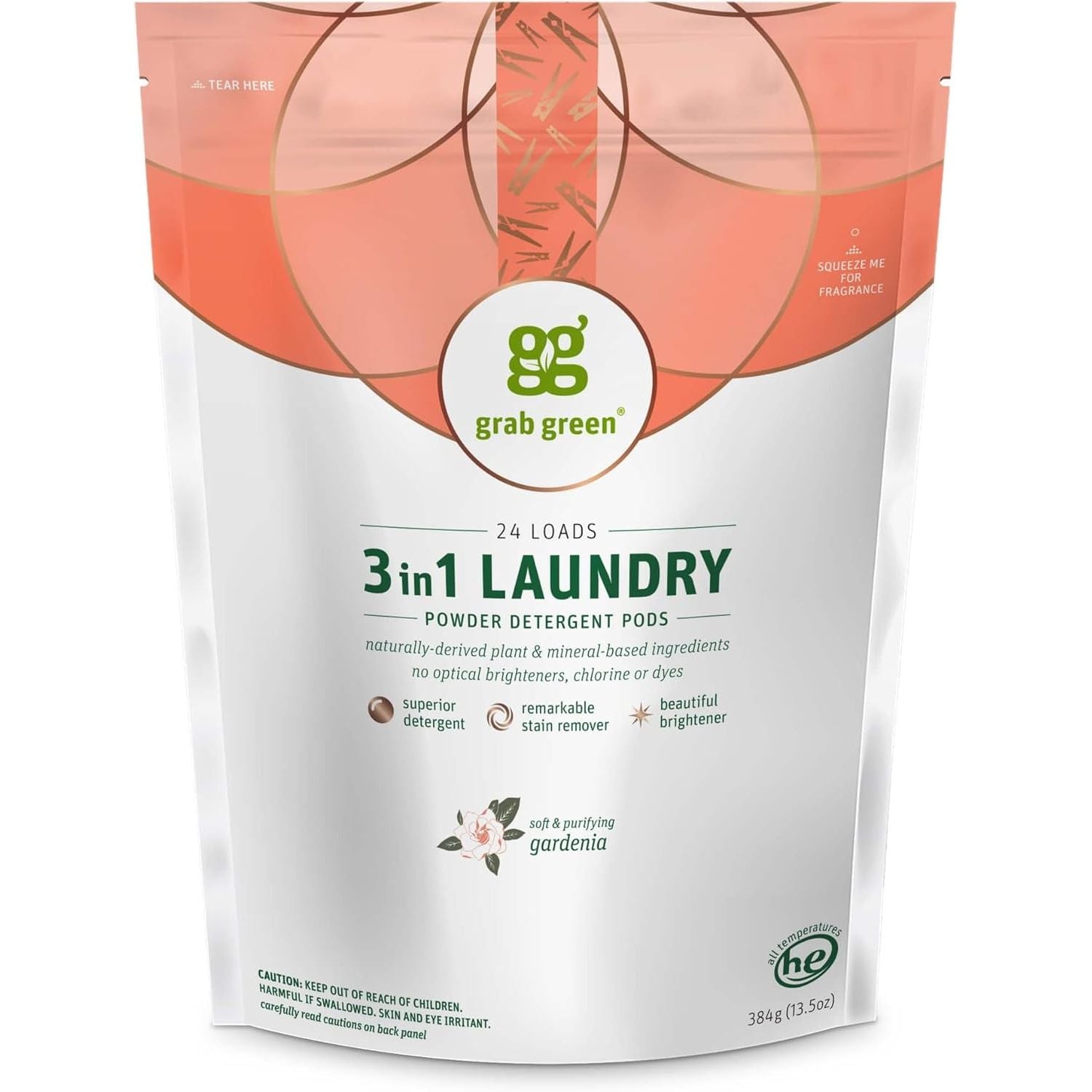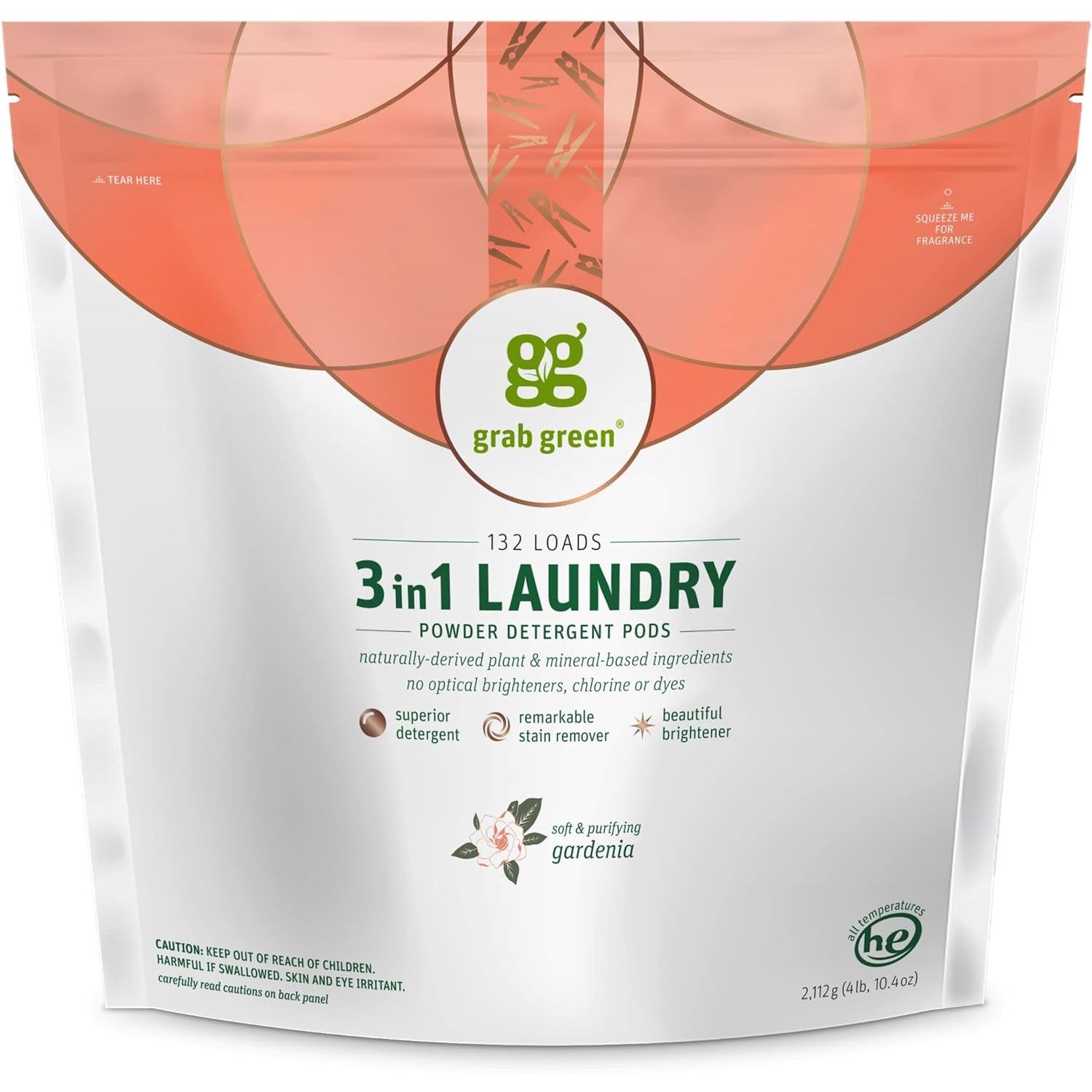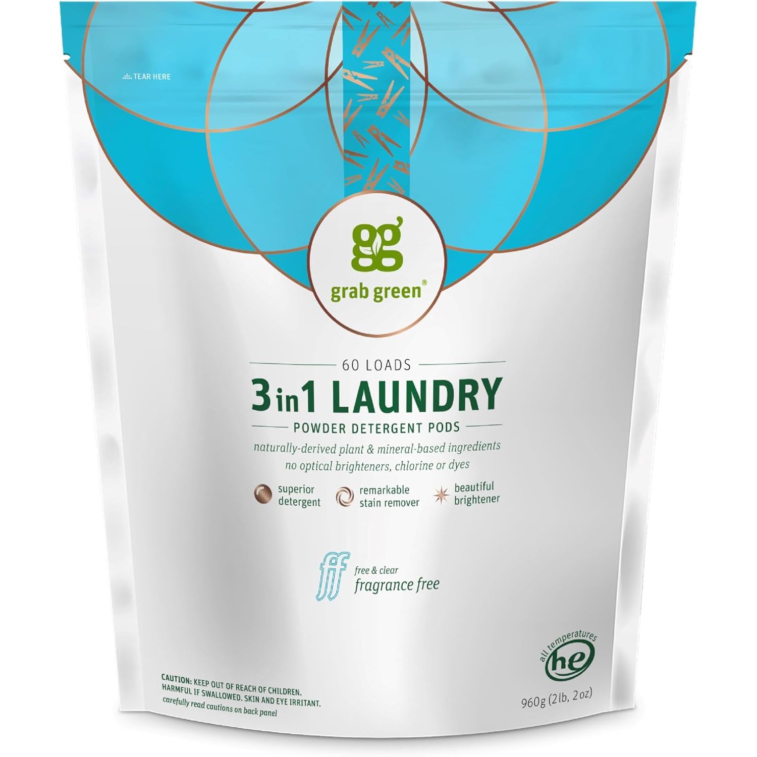 Save time and money with Grab Green 3 in 1 Laundry Detergent Pods. These concentrated pods feature a superior detergent, remarkable stain remover and beautiful brightener, all in one convenient pre-measured powder pod. Tackle your most difficult laundry challenges, without harmful toxins or carcinogens. Our unique, earthy vetiver fragrance is made with patchouli and black currant essential oils. Our thoughtful packaging includes a convenient, easy to use velcro closure and clear use instructions. We believe in full ingredient disclosure—what we call True Transparency—which is why we list every ingredient and the purpose for each ingredient on every package. To protect your family, we developed our powder pods to contain multiple layers of safety: simple, white powder pods don't look like irresistible colorful candy. They are difficult to swallow. Grab Green is a female and mother owned and operated company that provides naturally derived and non-toxic laundry, home cleaning, and personal care products 100% made in the USA. Our products are eco-responsible and ensure safe and effective cleaning power for a healthy, happy home.
