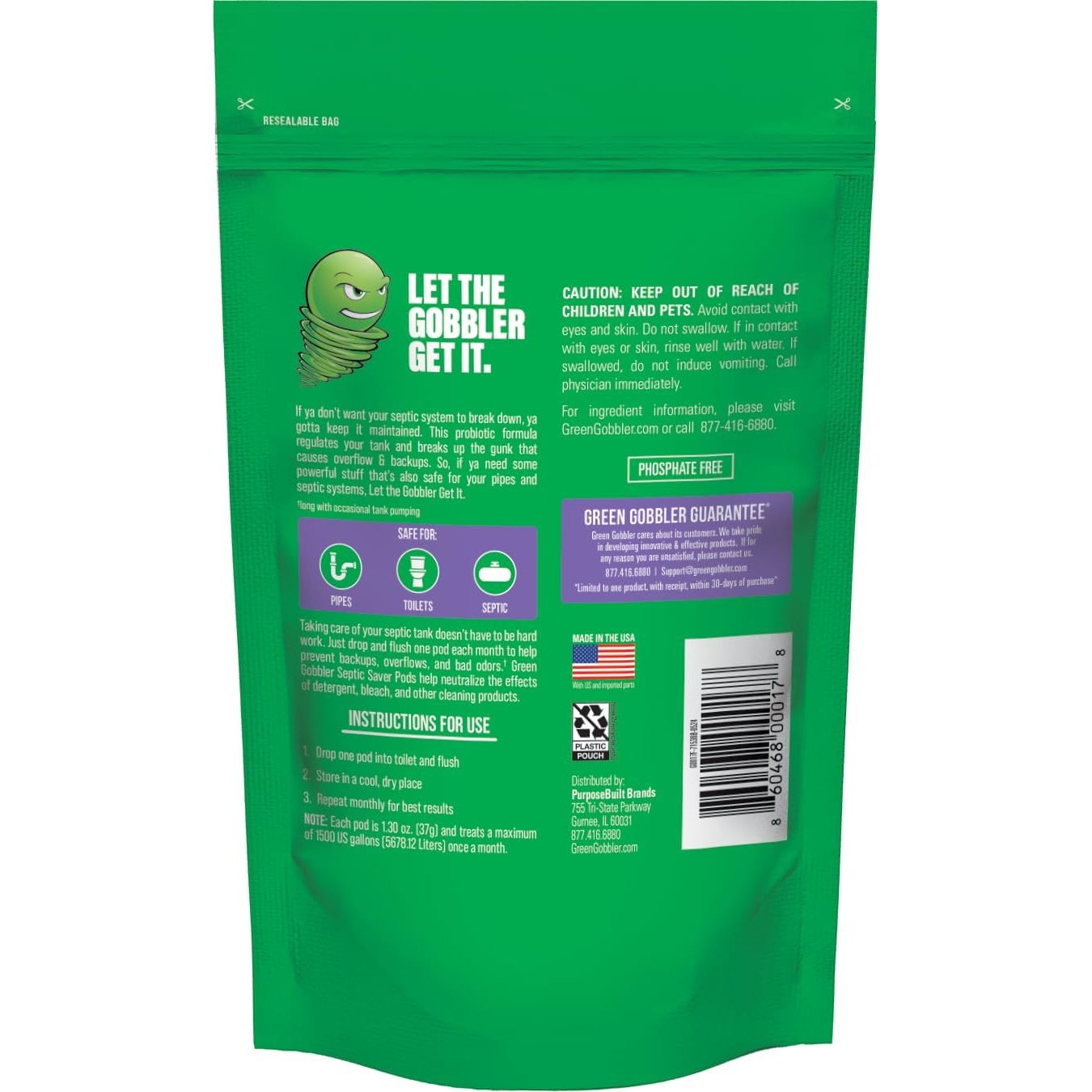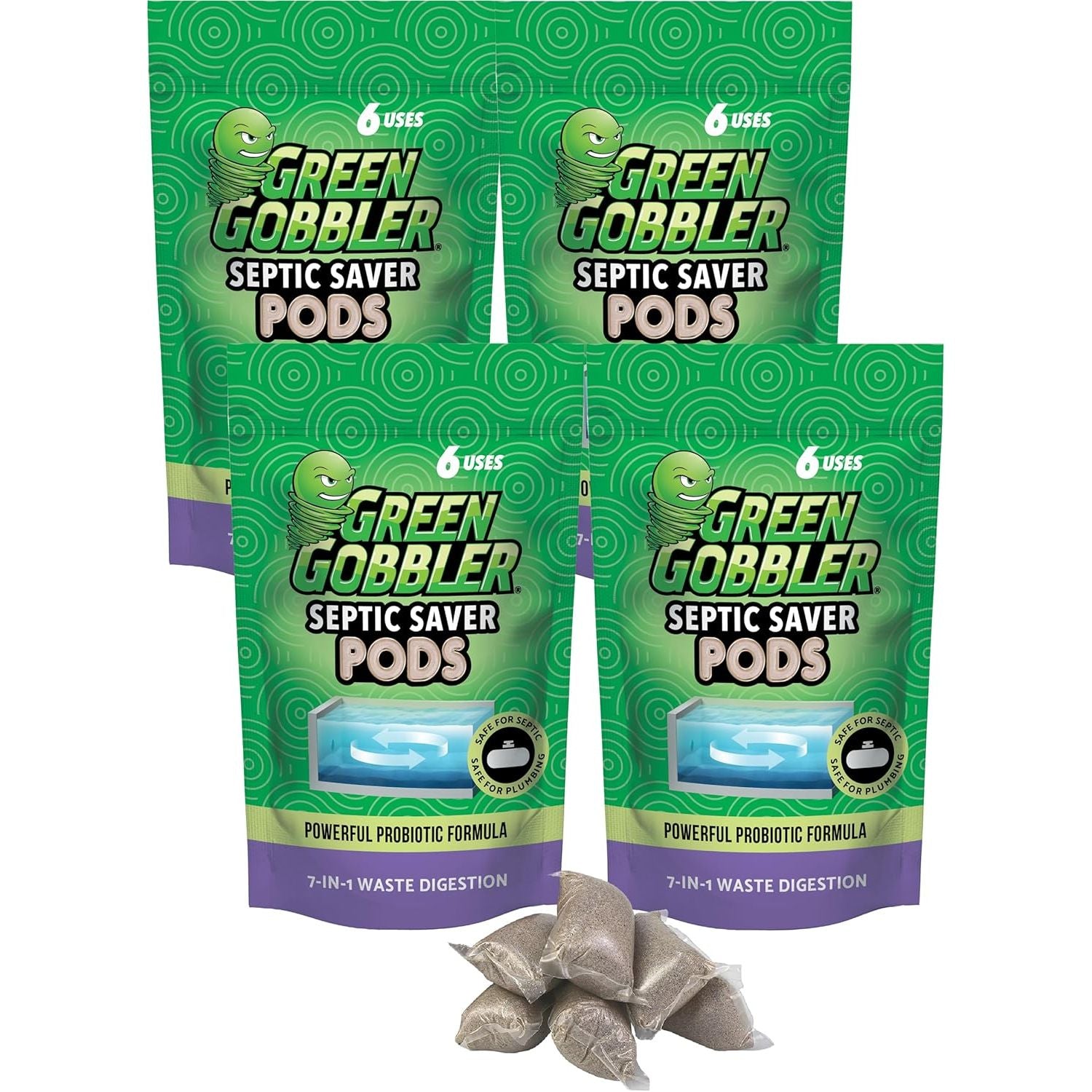 - 7-IN-1 SEPTIC WASTE DIGESTION: Green Gobbler Septic Saver Pods use a powerful probiotic formula to break down the most common substances that create septic tank backups, overflows and foul odors including toilet paper, fats, oils, grease, proteins, sugars & starches. It can also be used to treat cesspools, RV & marine holding tanks and drain & leach fields.