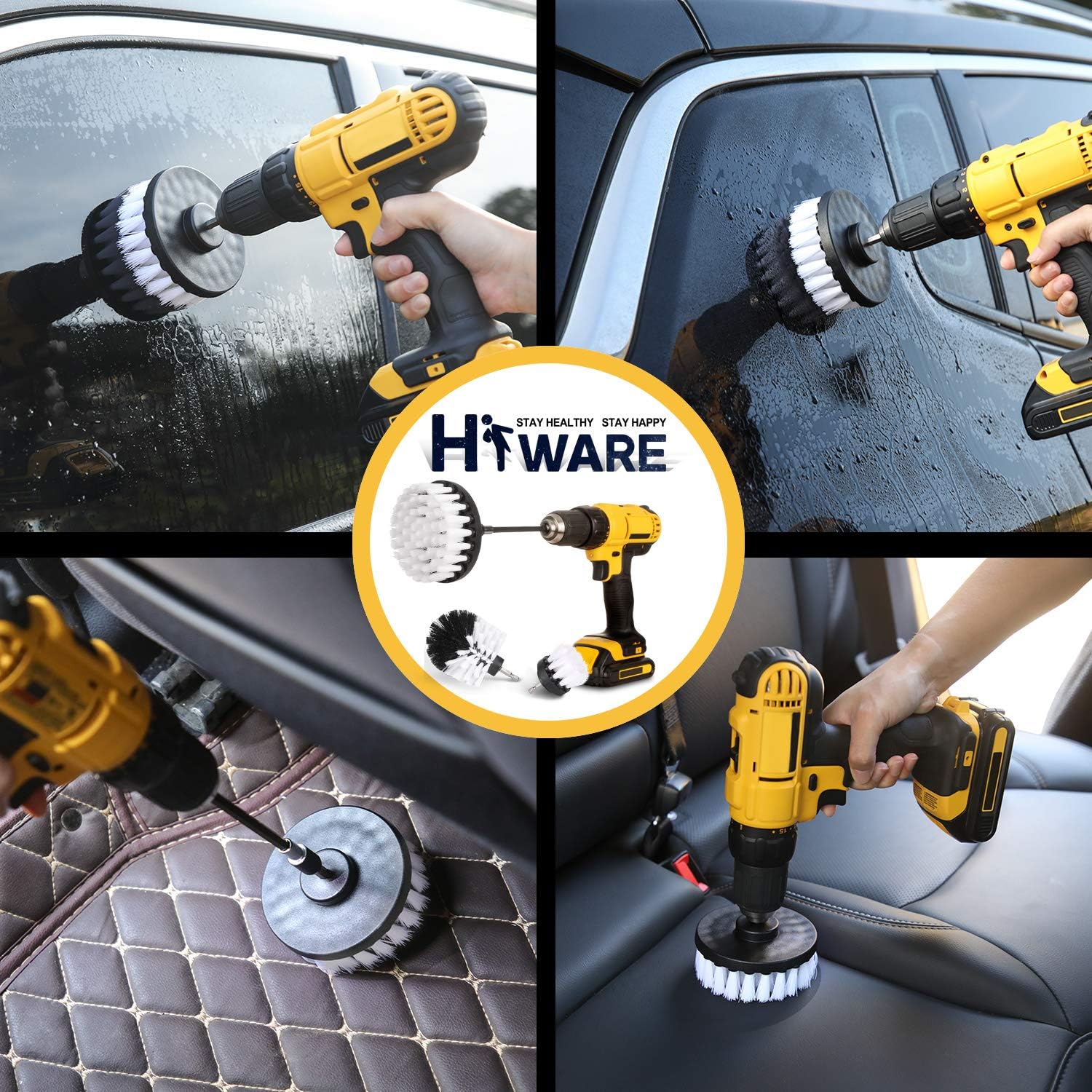 - Hiware 4 Pcs Drill Brush Car Detailing Kit with Extend Attachment, Soft Bristle Power Scrubber Brush Set for Cleaning Car, Boat, Seat, Carpet, Upholstery and Shower Door - White