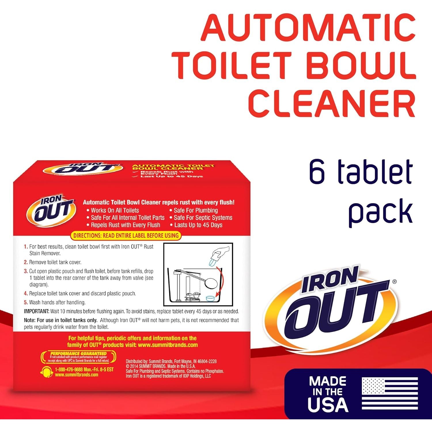 - Iron OUT Automatic Toilet Bowl Cleaner Tablets, Helps Remove and Prevent Rust Stains with Every Flush, Lasts up to 45 Days, Made in the USA, 6 Tablets