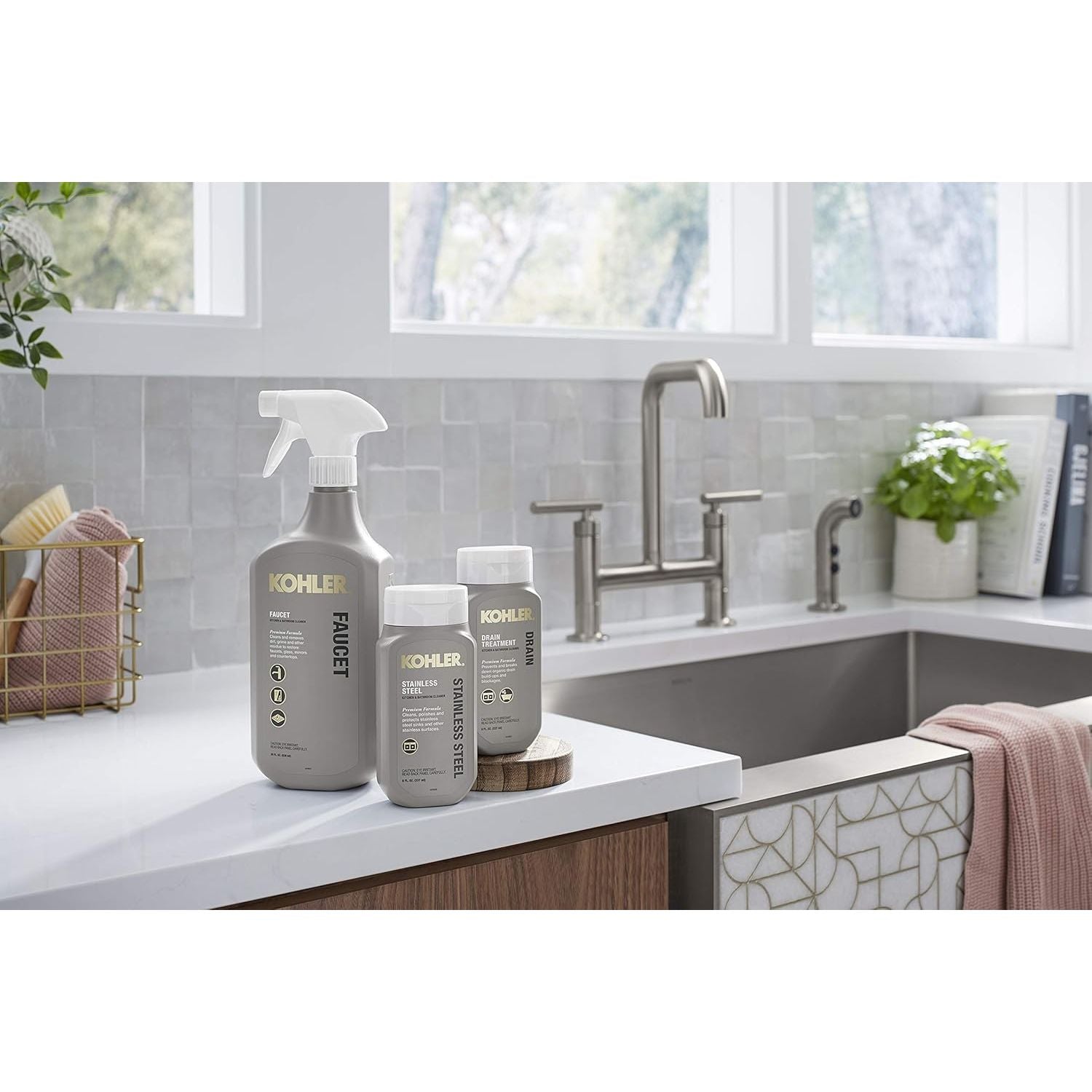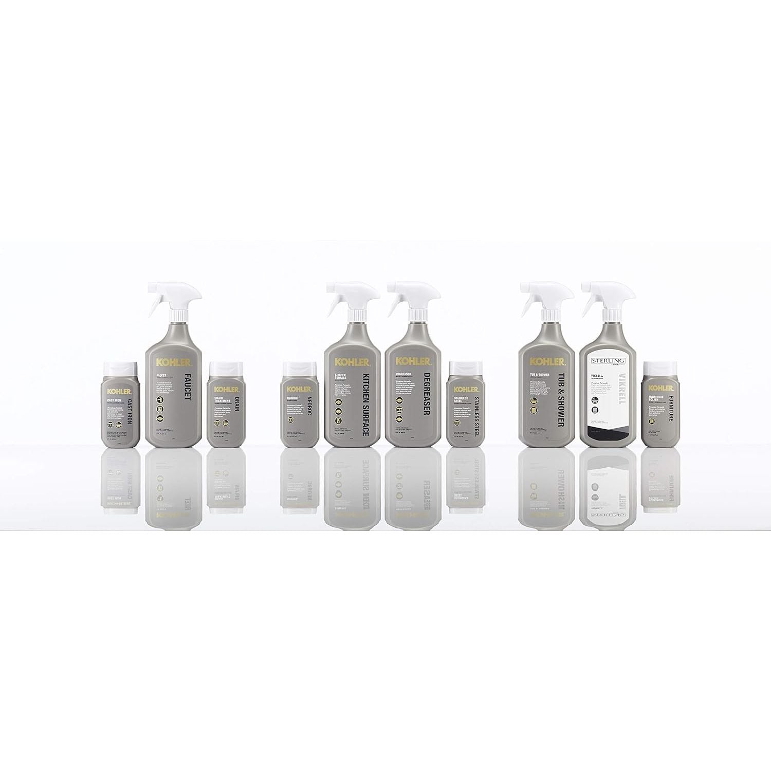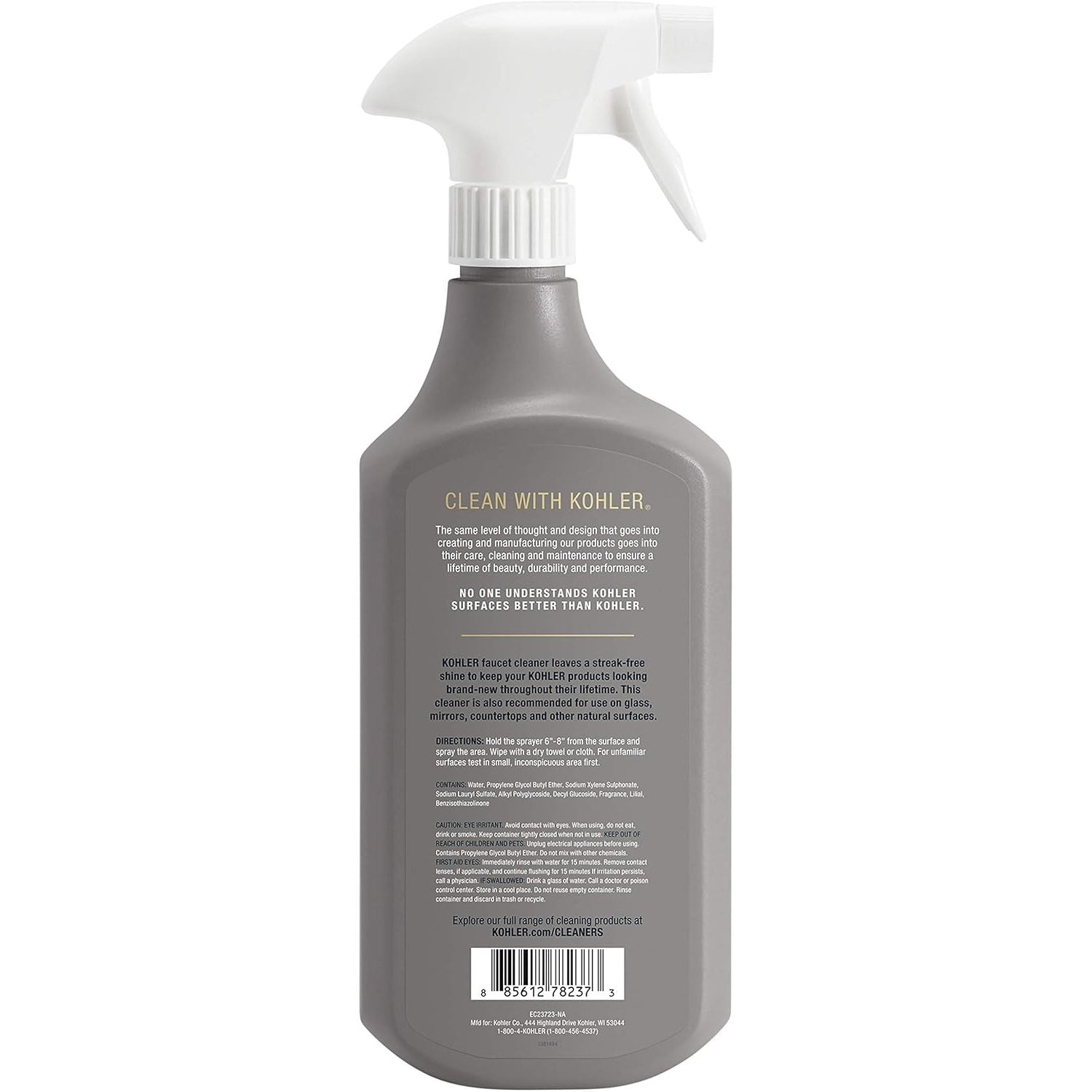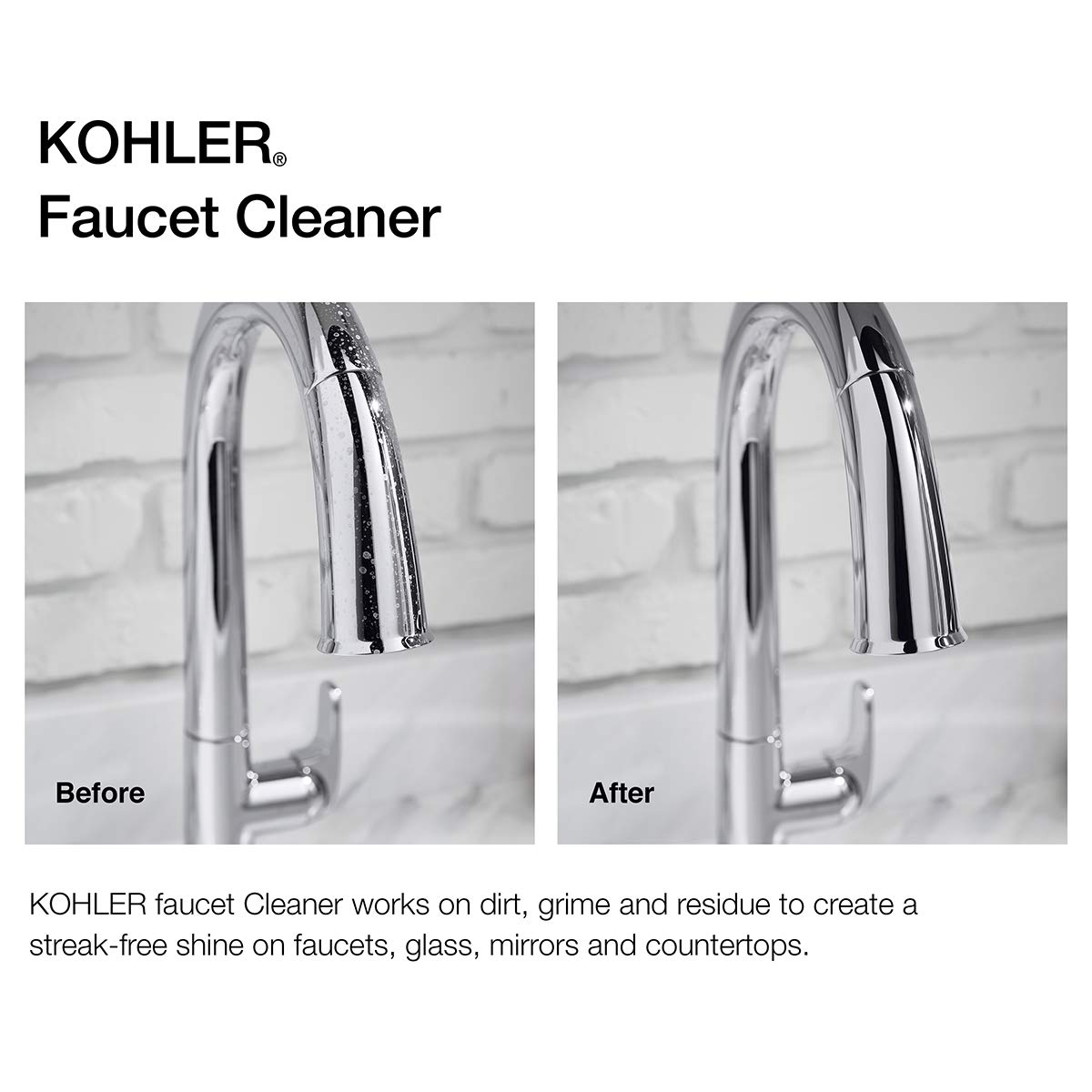 KOHLER premium faucet cleaner cleans and removes dirt, grime and other residue to restore faucets, glass, mirrors and countertops. Leaving a streak-free shine, this cleaner keeps your KOHLER products looking brand-new throughout their lifetime.