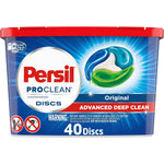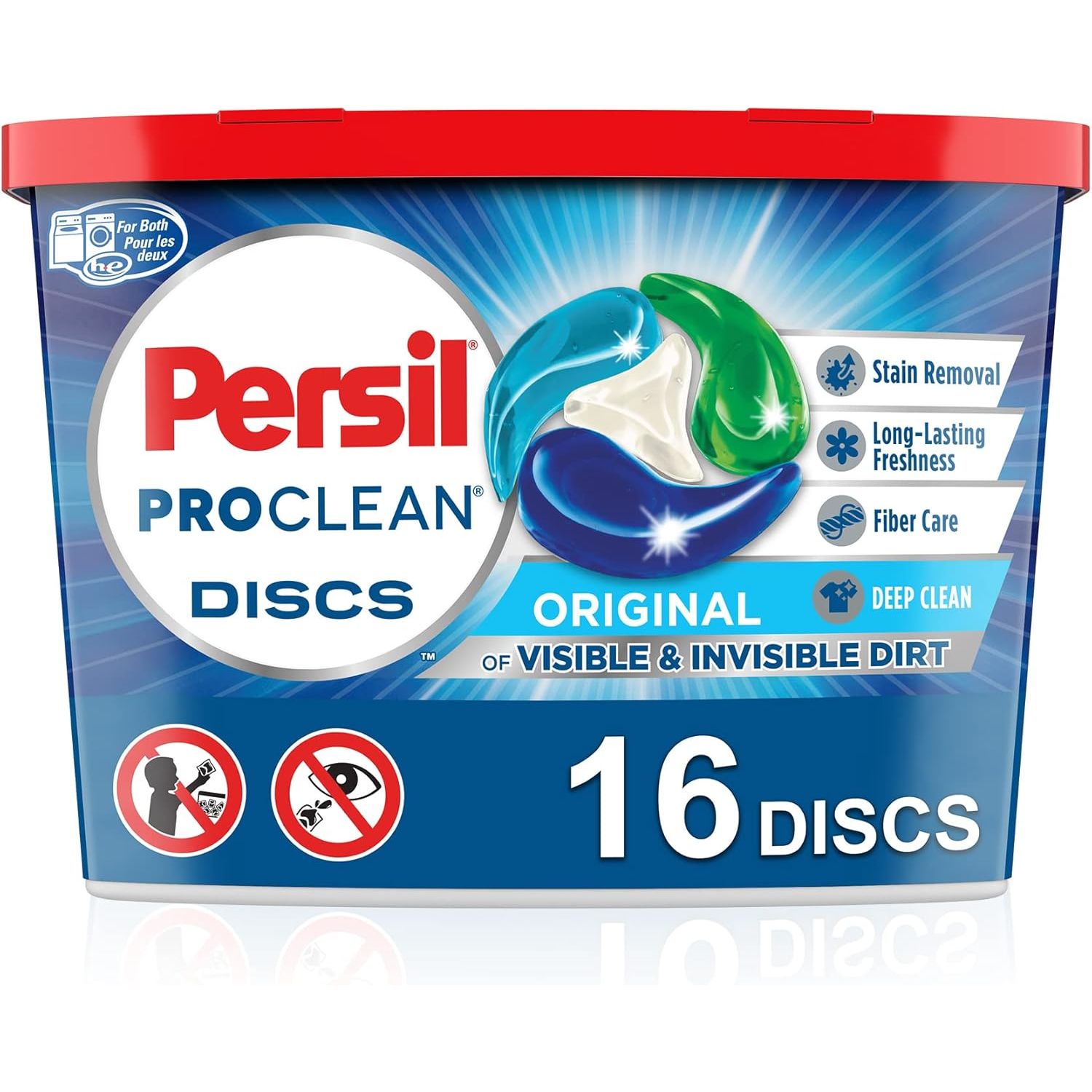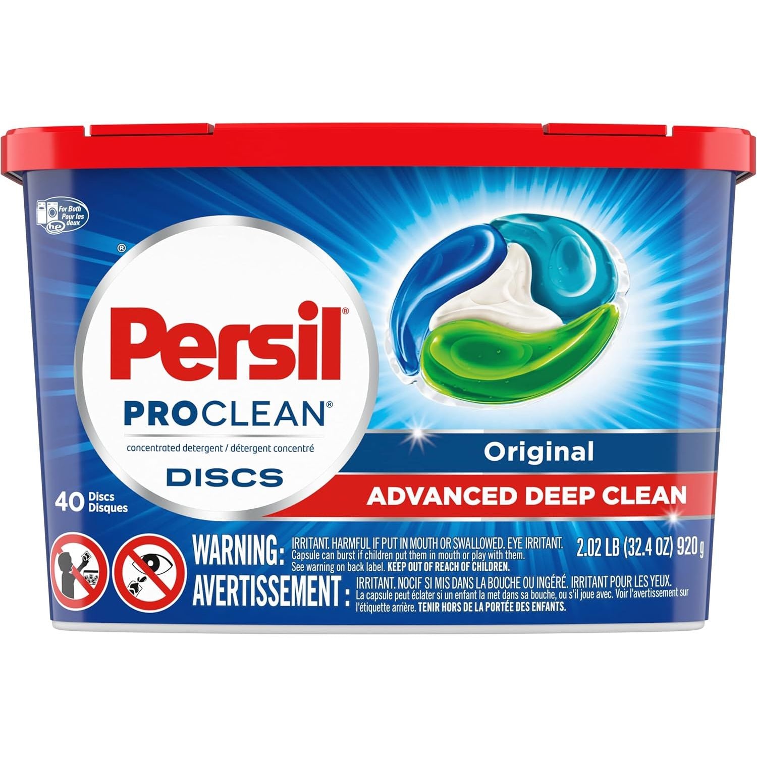 Persil ProClean DISCS laundry detergent pacs are designed with 4 powerful chambers. Each pre-measured DISC detergent capsule combines powerful stain removal, long-lasting freshness, fiber care, and the original deep clean detergent for a powerful cleaning combination. Persil DISCS are formulated to dissolve in all water temperatures, even cold water, and for use with whites or colors. Persil DISCS are easy to use, just place the laundry pacs into your empty washing machine drum before adding laundry. Simplify your laundry routine with easy-to-use DISCS detergent for a truly deep clean. It's more than clean, itâ s Persil ProClean! Persil DISCS are formulated to work in all washing machines, including high efficiency (HE) washers and are safe for septic systems. You get one tub of 40 Persil DISCS detergent packs, enough for 40 medium loads of laundry. detergente de lavanderÃa