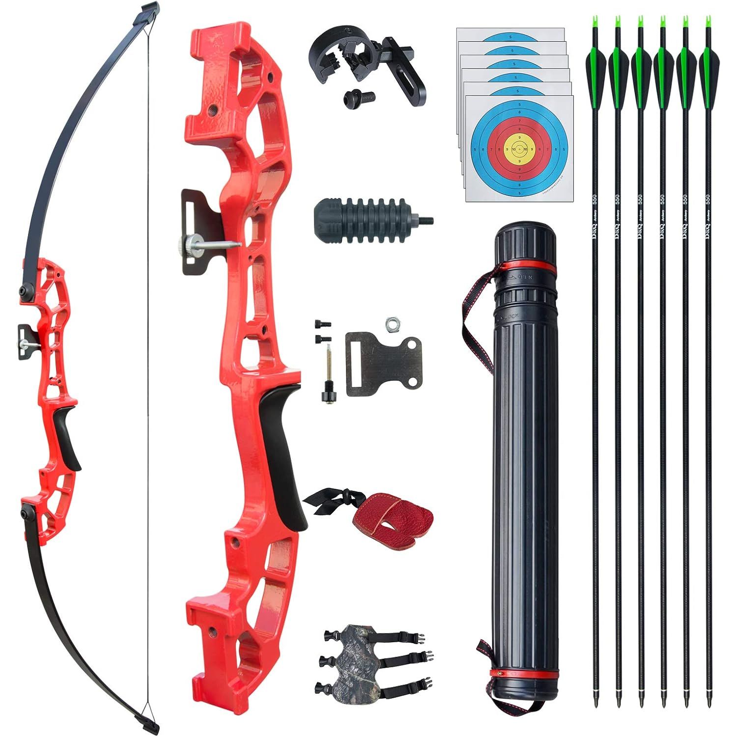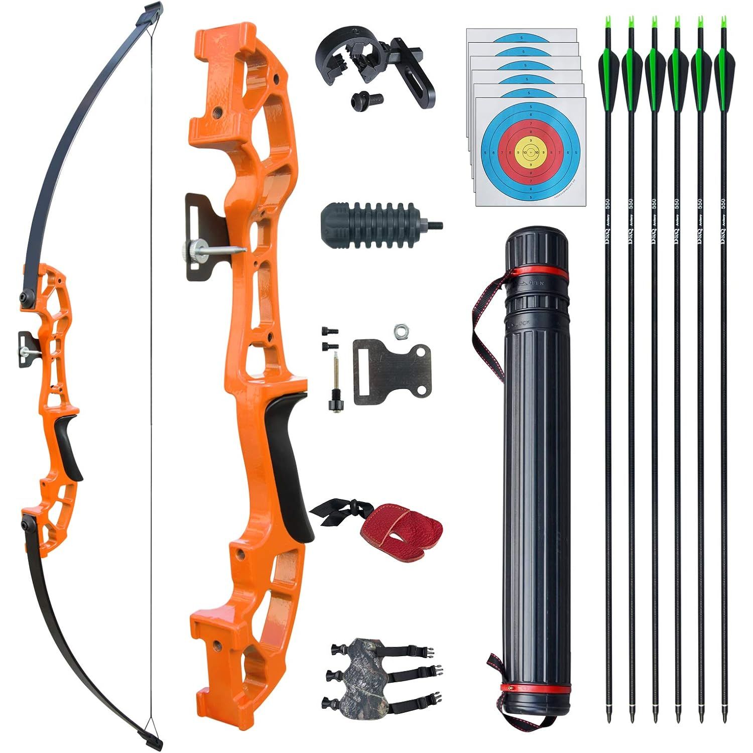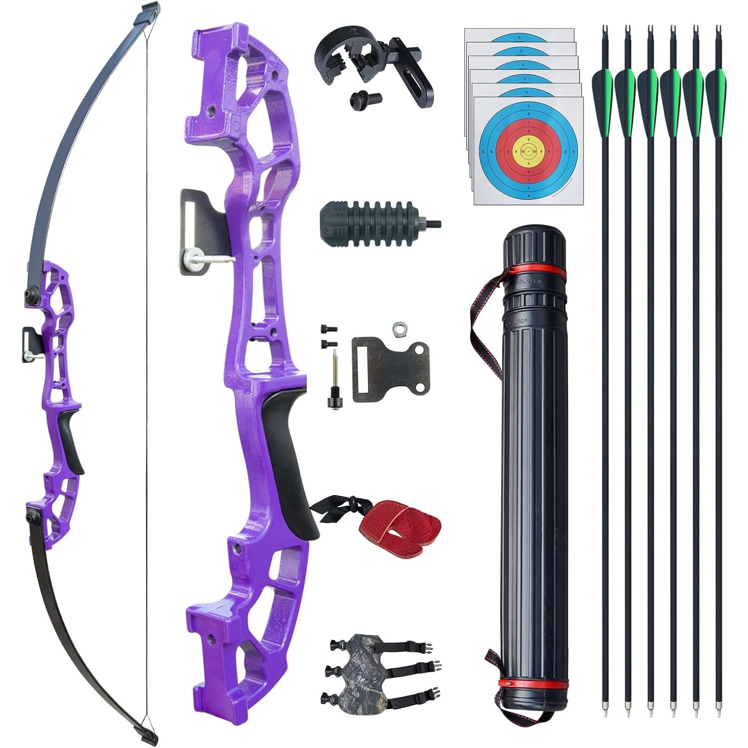 - PACKAGE: 1 x Bow, 6 x Fiberglass arrows, 6x Target face, 1 x Arm guard, 1 x Finger guard, 1 x Arrow rest, 1 x Bow sight, 1x Bow stabilizer, 1x Arrow tube.