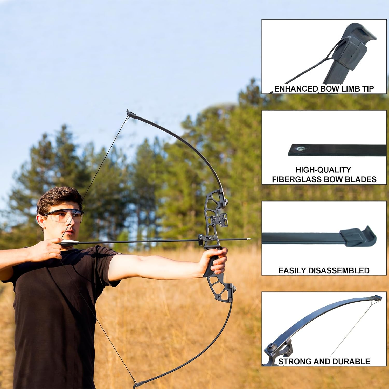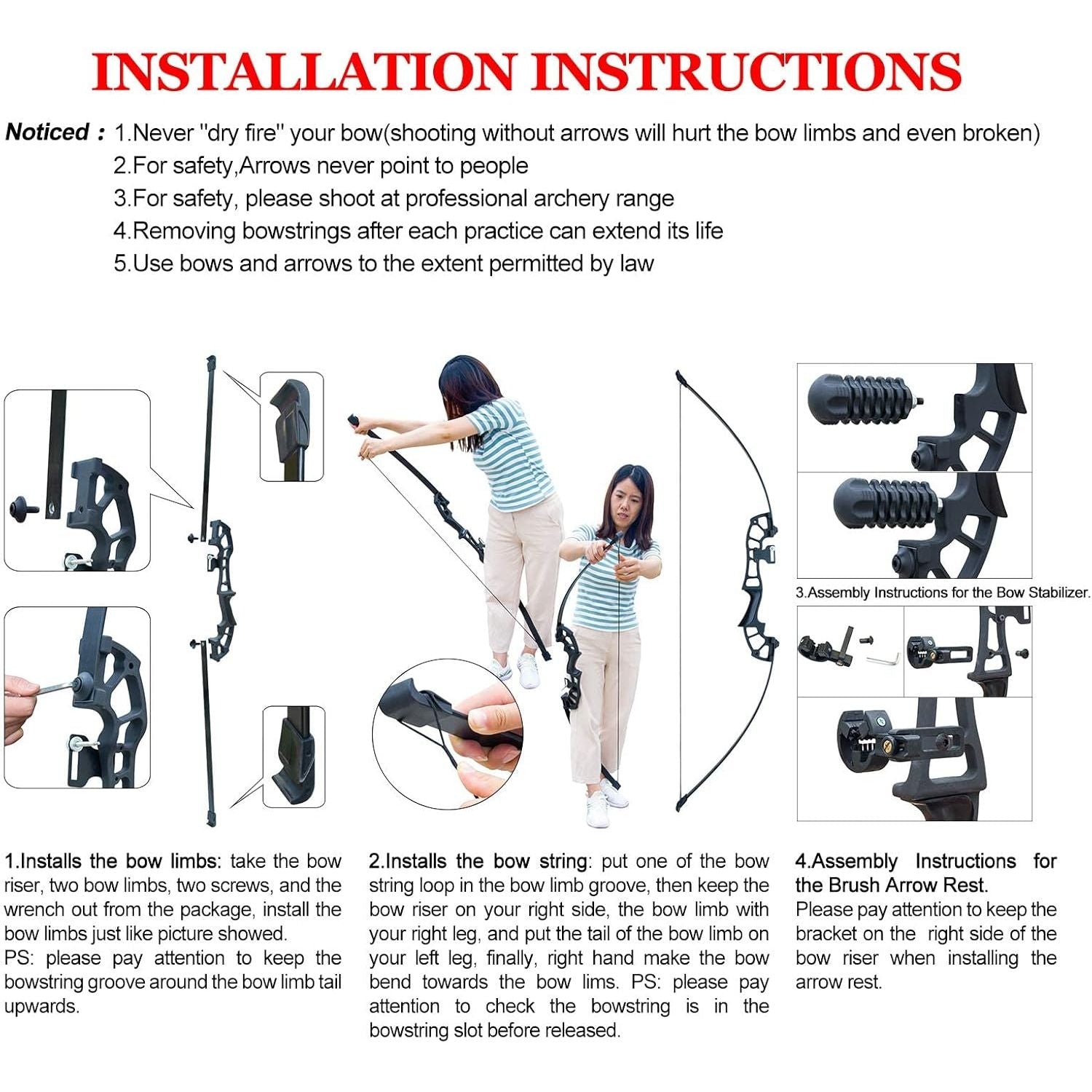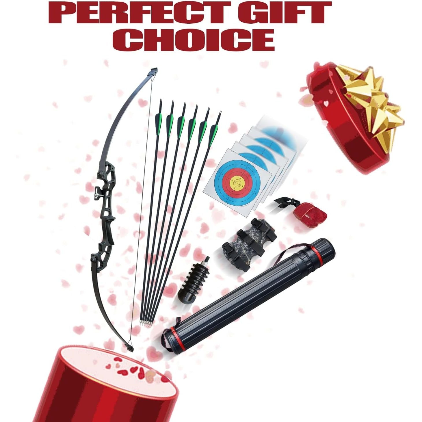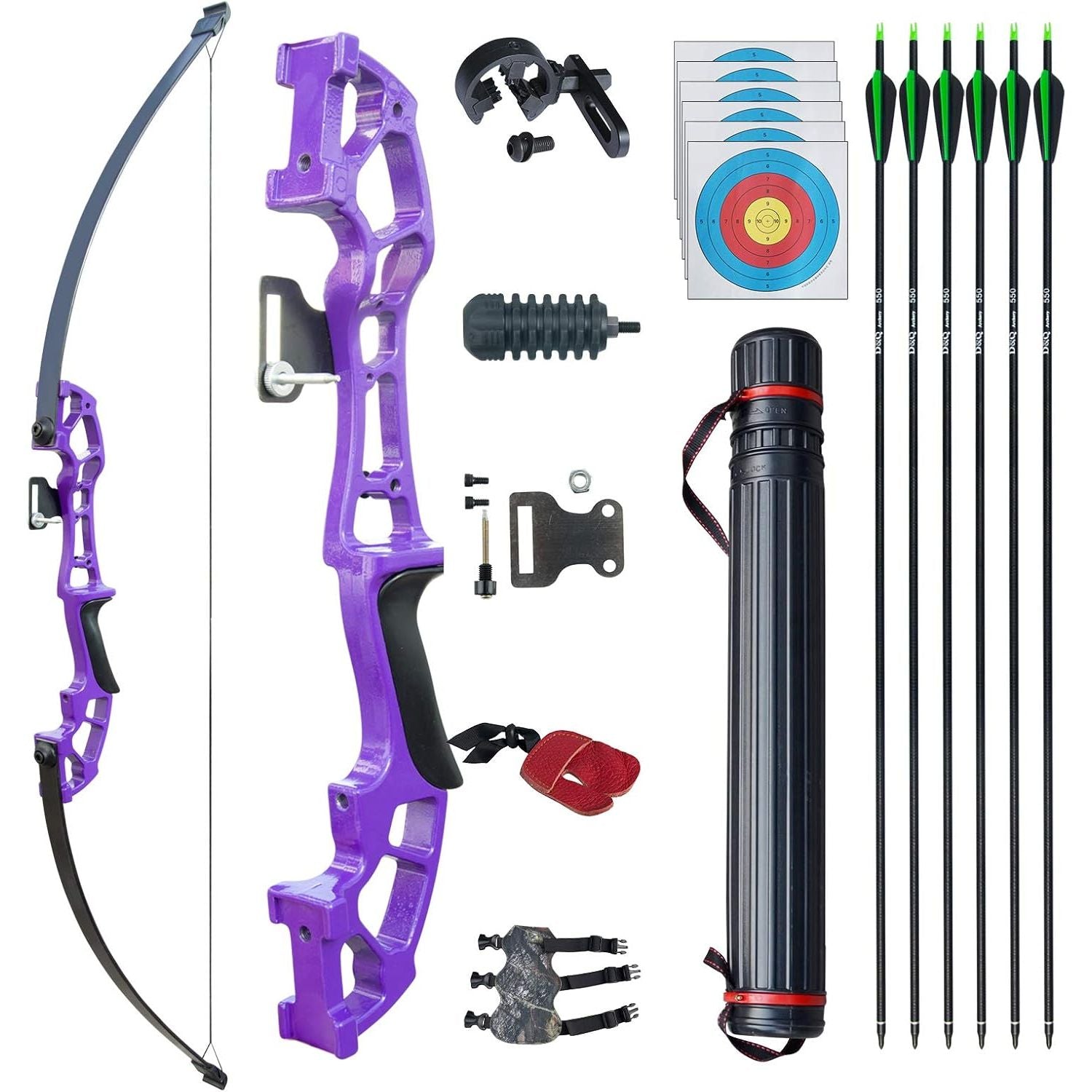 - PACKAGE: 1 x Bow, 6 x Fiberglass arrows, 6x Target face, 1 x Arm guard, 1 x Finger guard, 1 x Arrow rest, 1 x Bow sight, 1x Bow stabilizer, 1x Arrow tube.