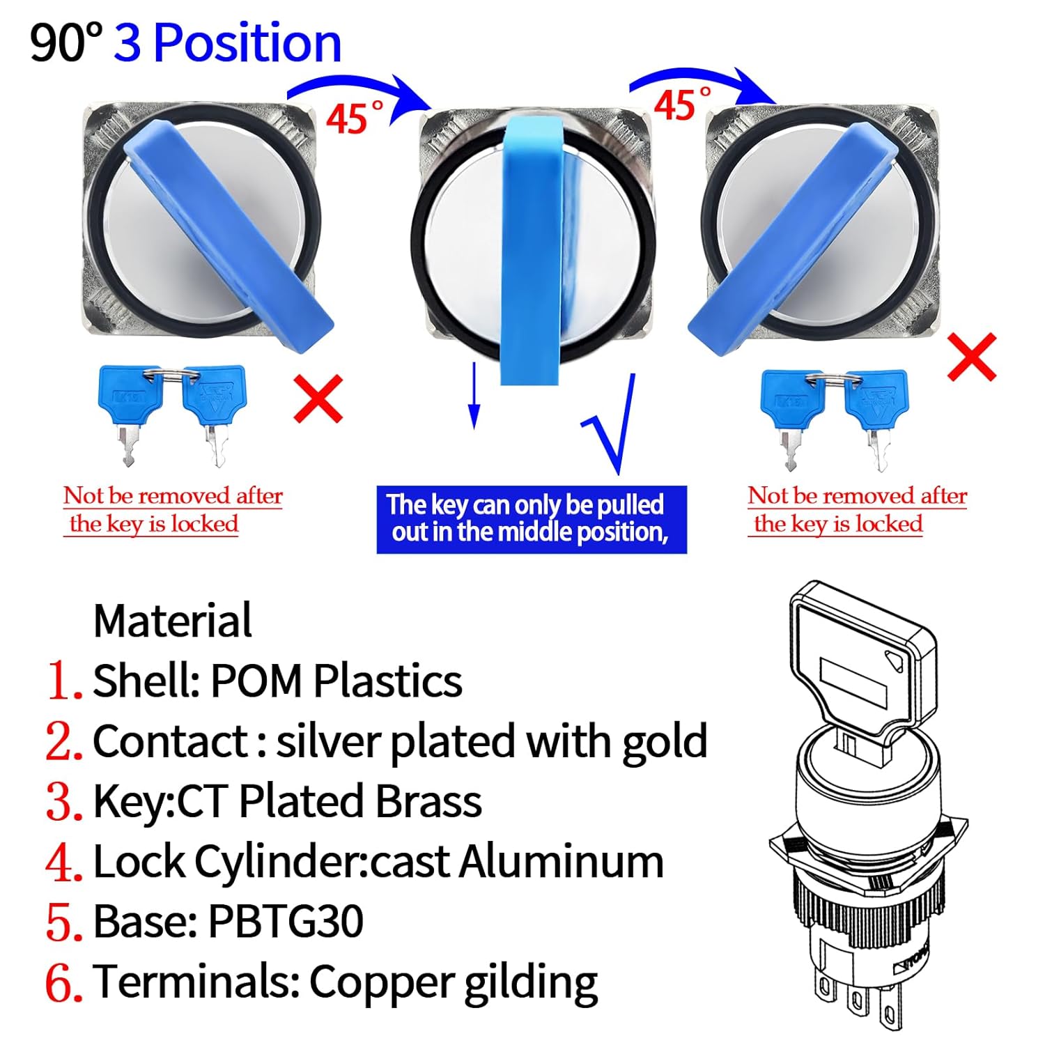 Package include: 2* Keylock Selector Switch 2* Wire Connector Sockets 4* keys What's the Wire Connector: With the wire connector, you don't need to solder the terminals, make installing very easy Saves the issue of soldering to the switch, and possibly melting it as well You can replace the switch anytime by just unplugging the switch from its socket What's Selector Switch Used for: Scope of application: punch, Automation equipment,Testing instrument and other circuit equipment.used widely to control the electronmagnetic Starter contactor,relay and other automaatic control electric circuits. What's Note: -The project you are going to be used for, don't let current go above 5 amps. Or the switch will get warm and to be burned out. What's Customer Support: If you have any questions, feel free to contact us by E-mail any time. We get professional customer service staff and technician to help you. Specifications: Head diameter: 18mm Mounting hole size: 0.63" (16mm) Switch combination: 2 Position,1NO 1NC SPDT ; 3 Position,2NO 2NC DPDT Switch rating: 5A/250VAC Head shape: Round Cap Protection level: IP54 Selector Positon: 2 Position /3 Position