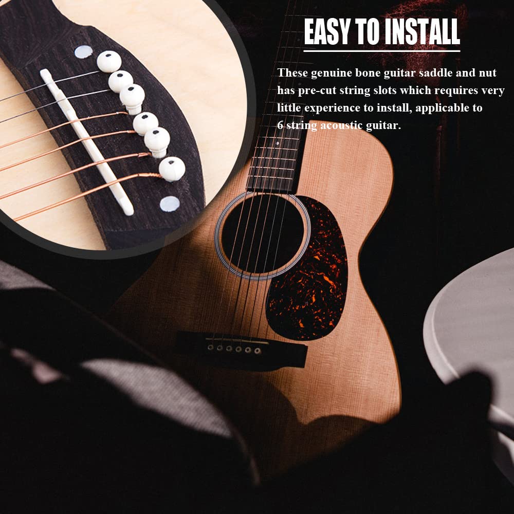 - ✔ EASY TO INSTALL - These genuine bone guitar saddle and nut has pre-cut string slots which requires very little experience to install, applicable to 6 string acoustic guitar.