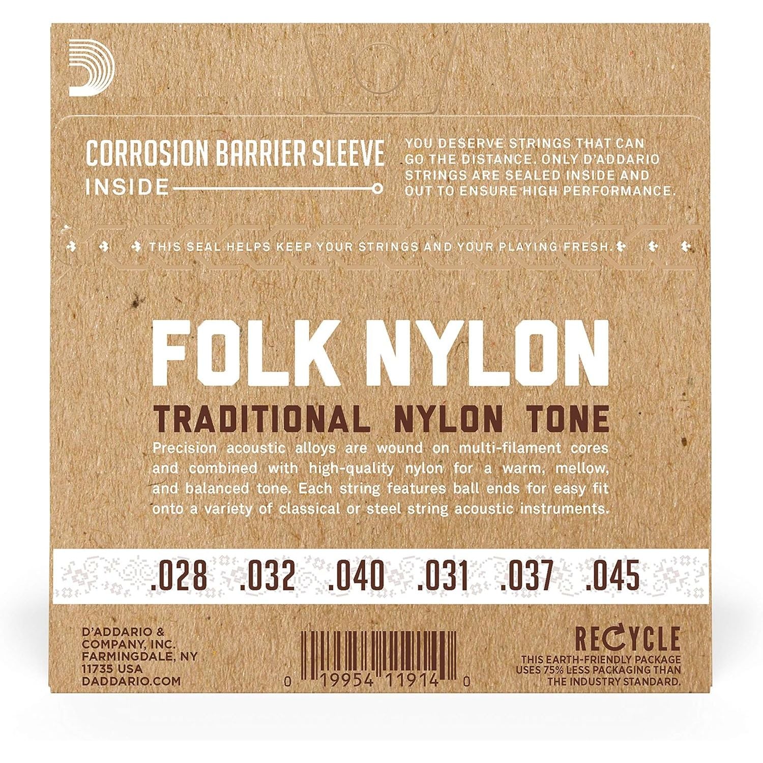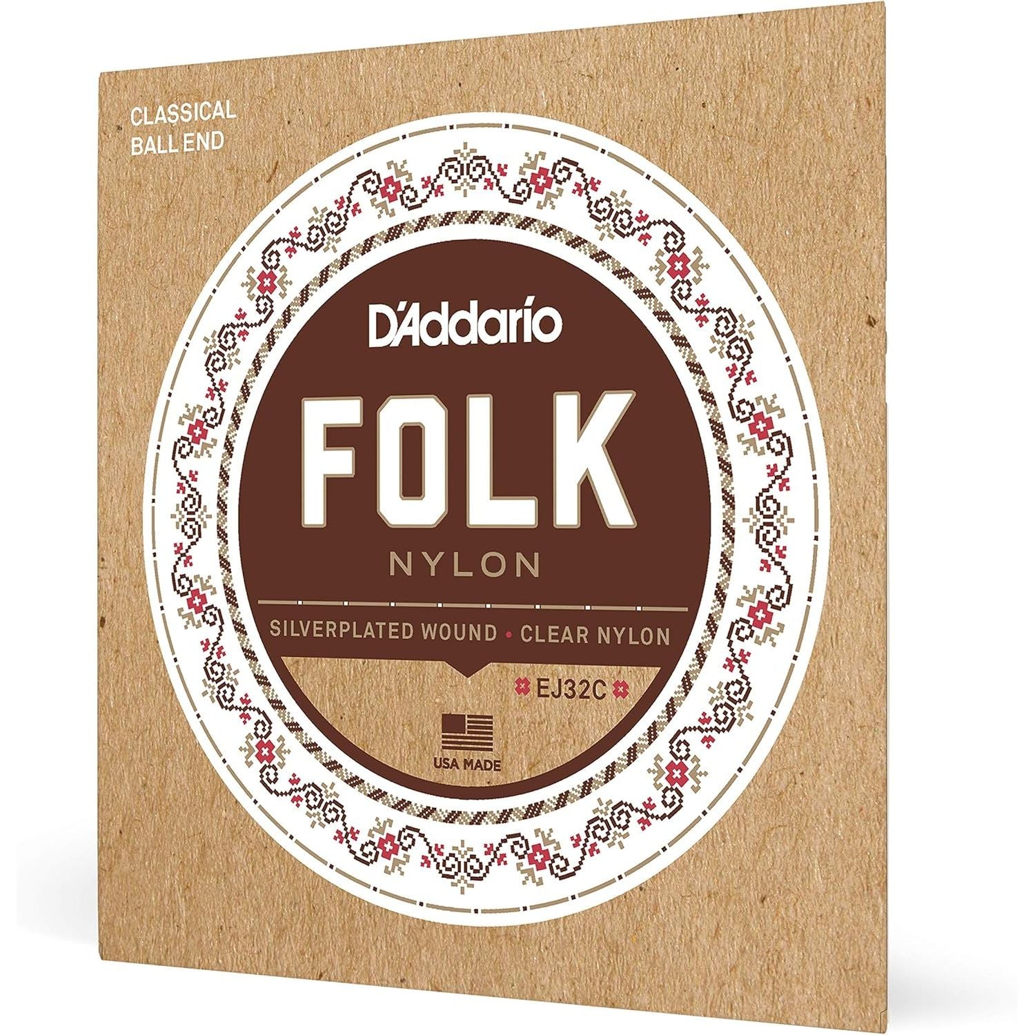 Product Description D’Addario Folk Nylon strings bring the alluring sound of nylon to all types of acoustic guitars. Folk Nylon sets feature ball ends, making them compatible with other, non-classical acoustic guitars. Combining silver-wound nylon core basses with black nylon trebles, Folk Nylon guitar strings bring warm, mellow, nylon tone to any acoustic. This Normal Tension set is our best-selling tension, preferred for the balance of rich tone, comfortable feel, and dynamic projection. From the Manufacturer EJ32 Folk Nylon strings feature silver wound basses, black nylon trebles, and D'Addario ball ends to accommodate a variety of guitars and string changing options. D'Addario Folk Nylon strings are constructed with high quality nylon and a ball end on each string to facilitate easy installation on classical or steel string acoustic guitars, if desired. D'Addario, the world's largest manufacturer of musical instrument strings, is known as The Players Choice with a reputation for unsurpassed quality and consistency. D'Addario's innovative, packaging reduces waste and provides protection from corrosion. All D'Addario strings are manufactured in the U.S.A. using proprietary, digitally controlled, state-of-the-art machinery for unmatched performance, set after set.