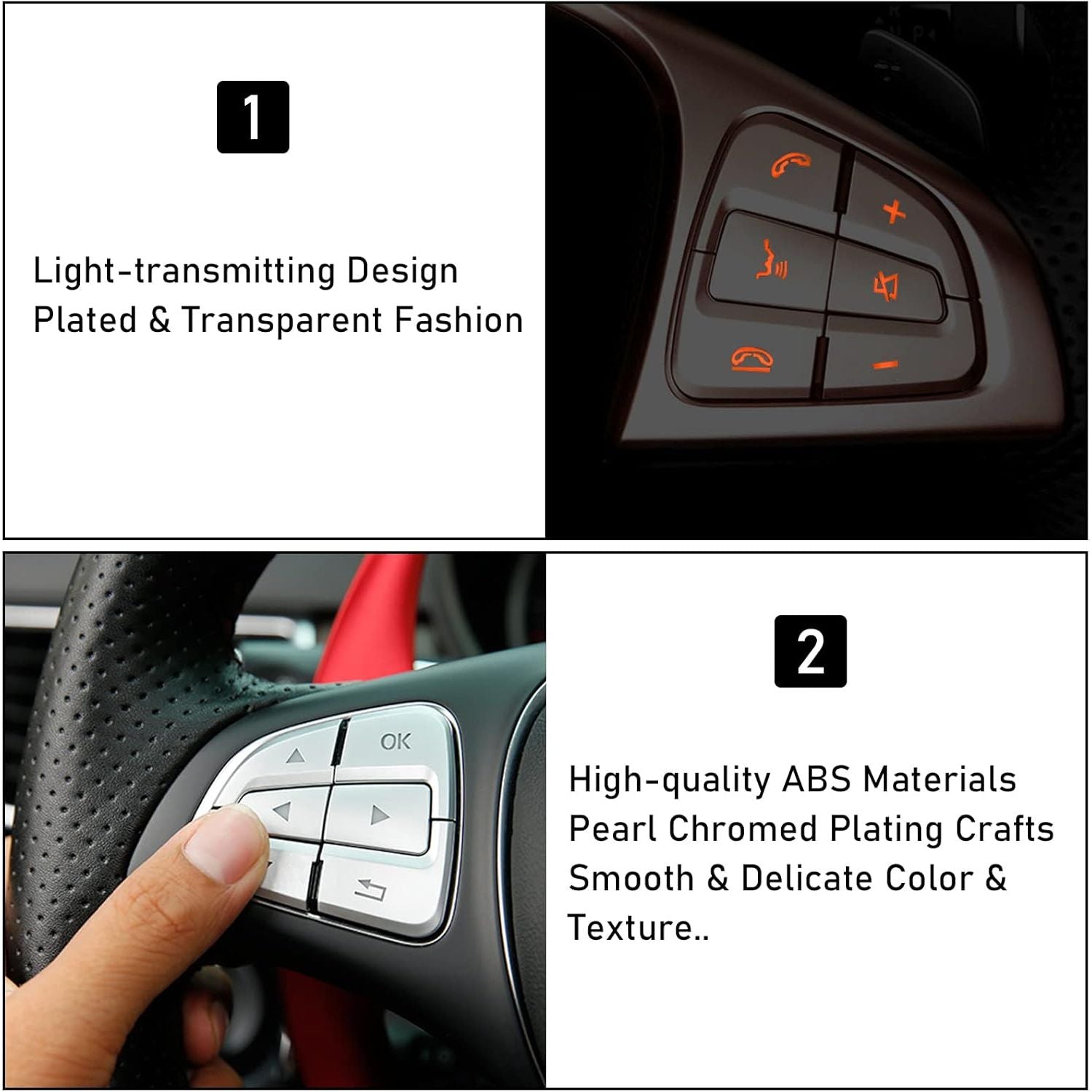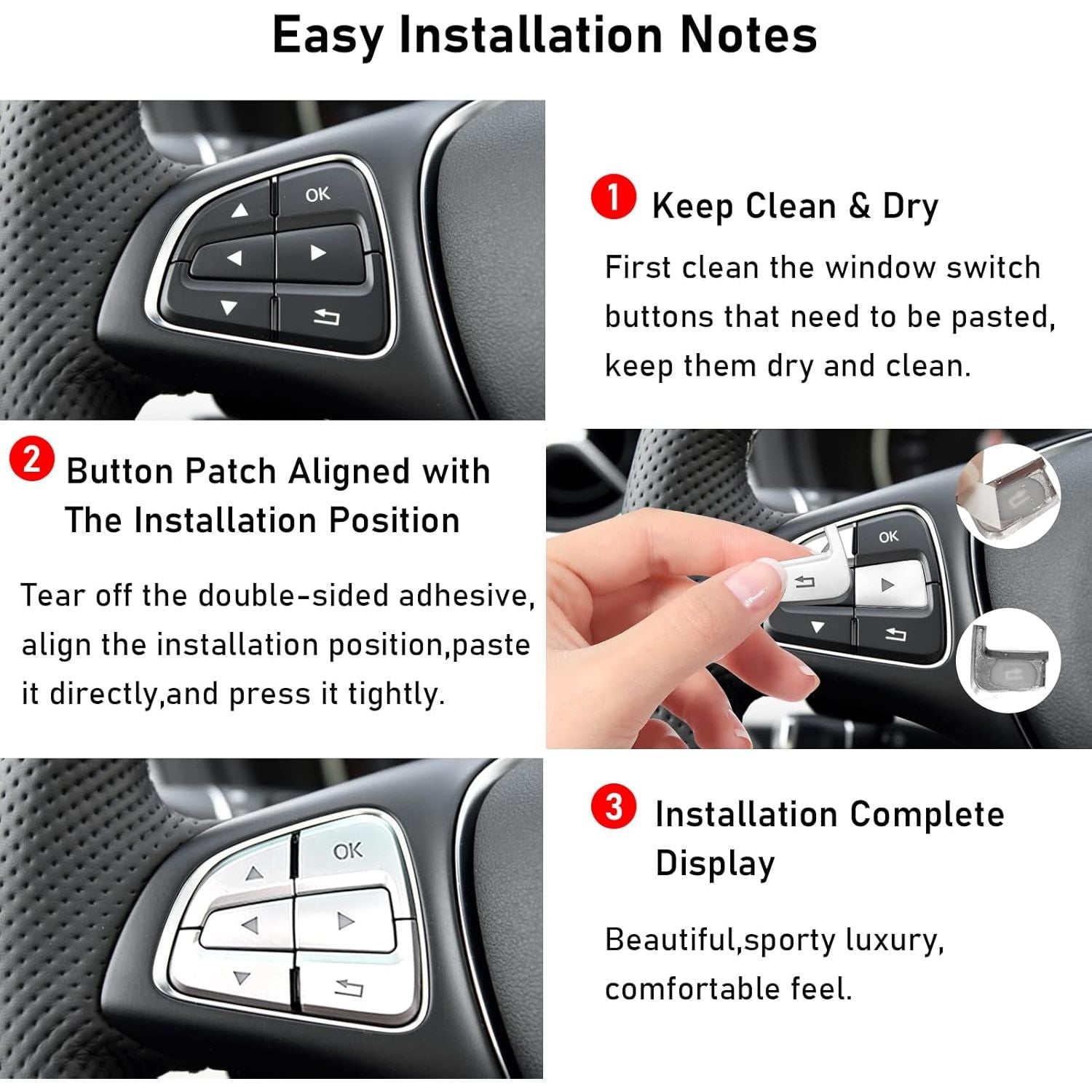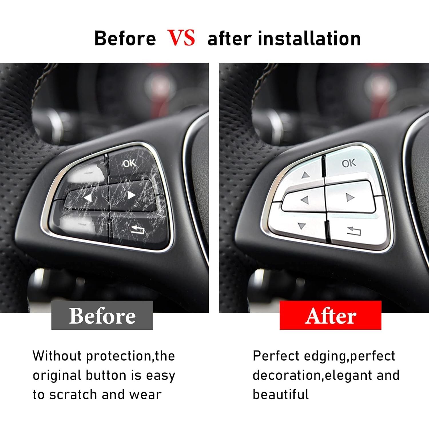 - 🚕【No-drill Installation】Compatible with SL Class W231 steering wheel button stickers are reliable in quality.Easy installation.First clean the surface to be bonded and keep it dry.Then tear off the tape behind this replacement steering wheel knob sticker.Align the positions and glue them.A small change give your car interior a Brand New Look.Highly recommended to heat it with hot air blower or other heating equipment for a few seconds to make it stickier.Leave it for a while after installation.