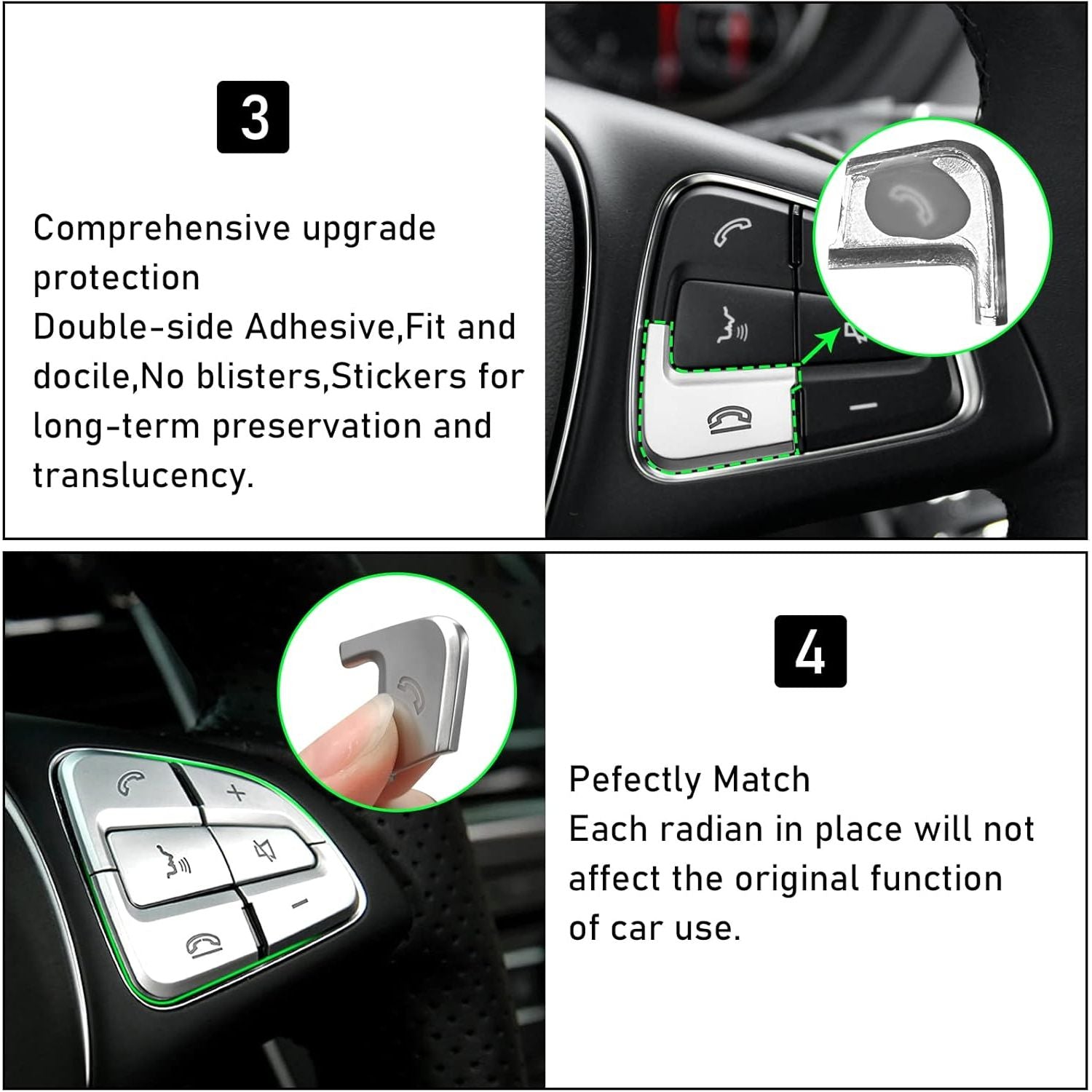 - 🚕【Package Include】12 PCS silver steering wheel button switch stickers and a sturdy box.Please note that these stickers act as a protective and decorative role and do not replace the original button.Be careful not to clean them within 24 hours after installation.