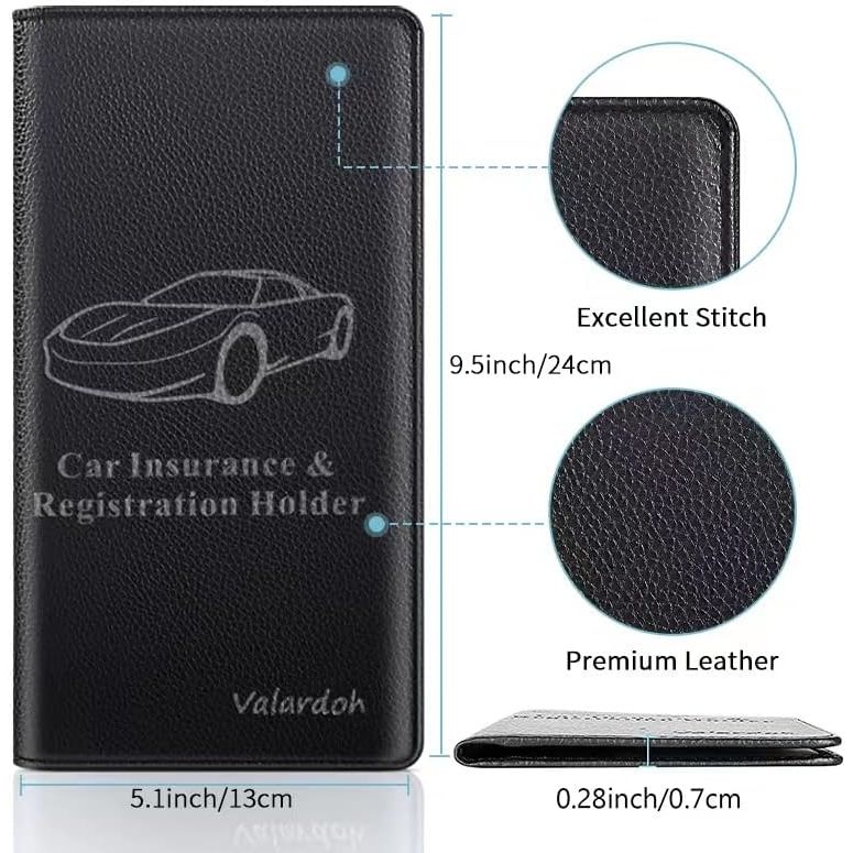 Scope of Delivery: 1 x Car Registration and Insurance Holder Features: Perfect size(9.5" x 5.1") to fit into your car console. 6 Pockets designed -- 2 on the left and 4 on the right. Magnetic closure holds each other and provide ease of use. This car document holder provides: Long lasting protection for your vehicle registration and insurance card, and other essential paperwork. The papers will not be scattered in the glove box anymore when owning this registration and insurance card holder.