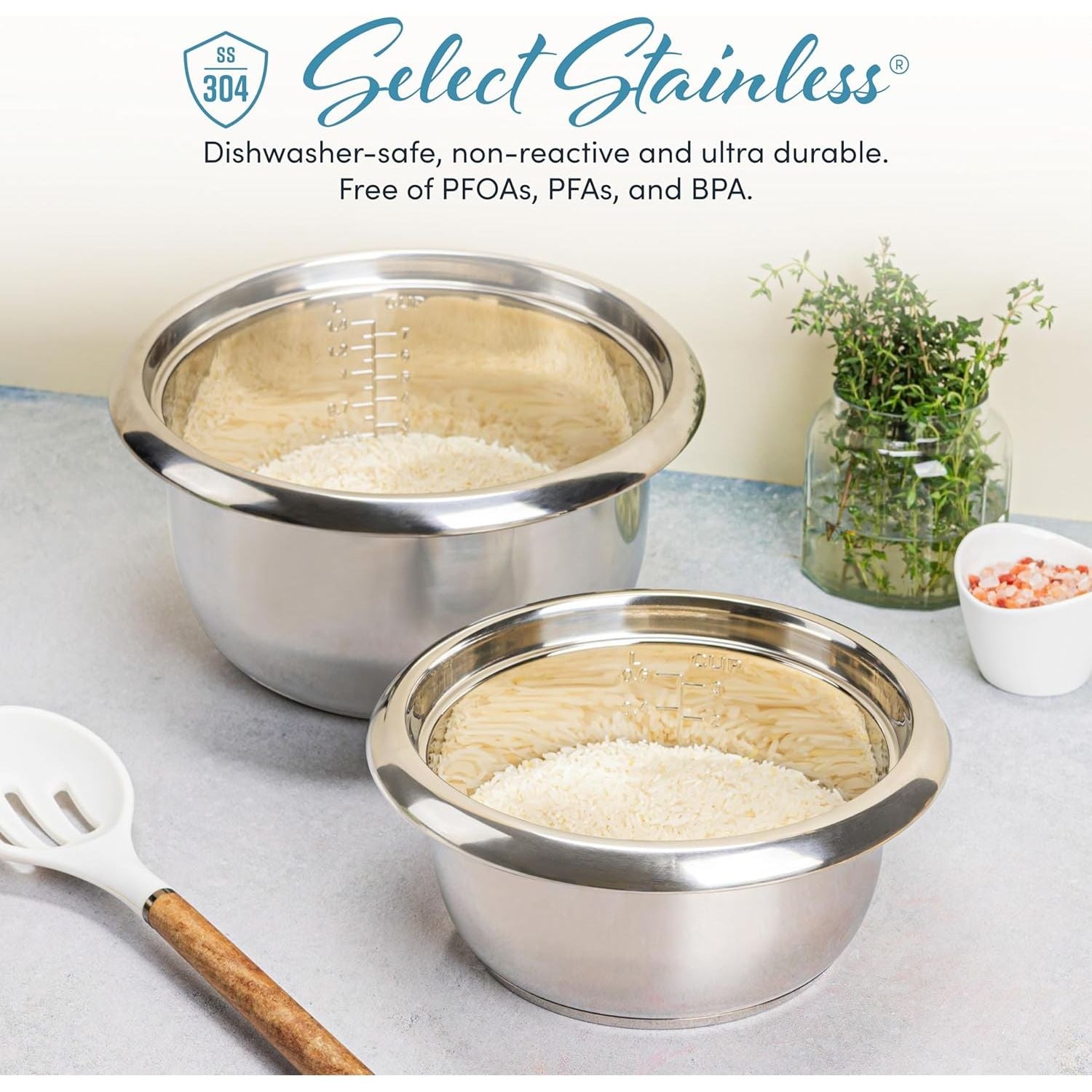 - COMPLETE SET: We include a bonus rice spatula and measuring cup, which are BPA-free. Plus, the spatula can be held in the handle for easy storage.