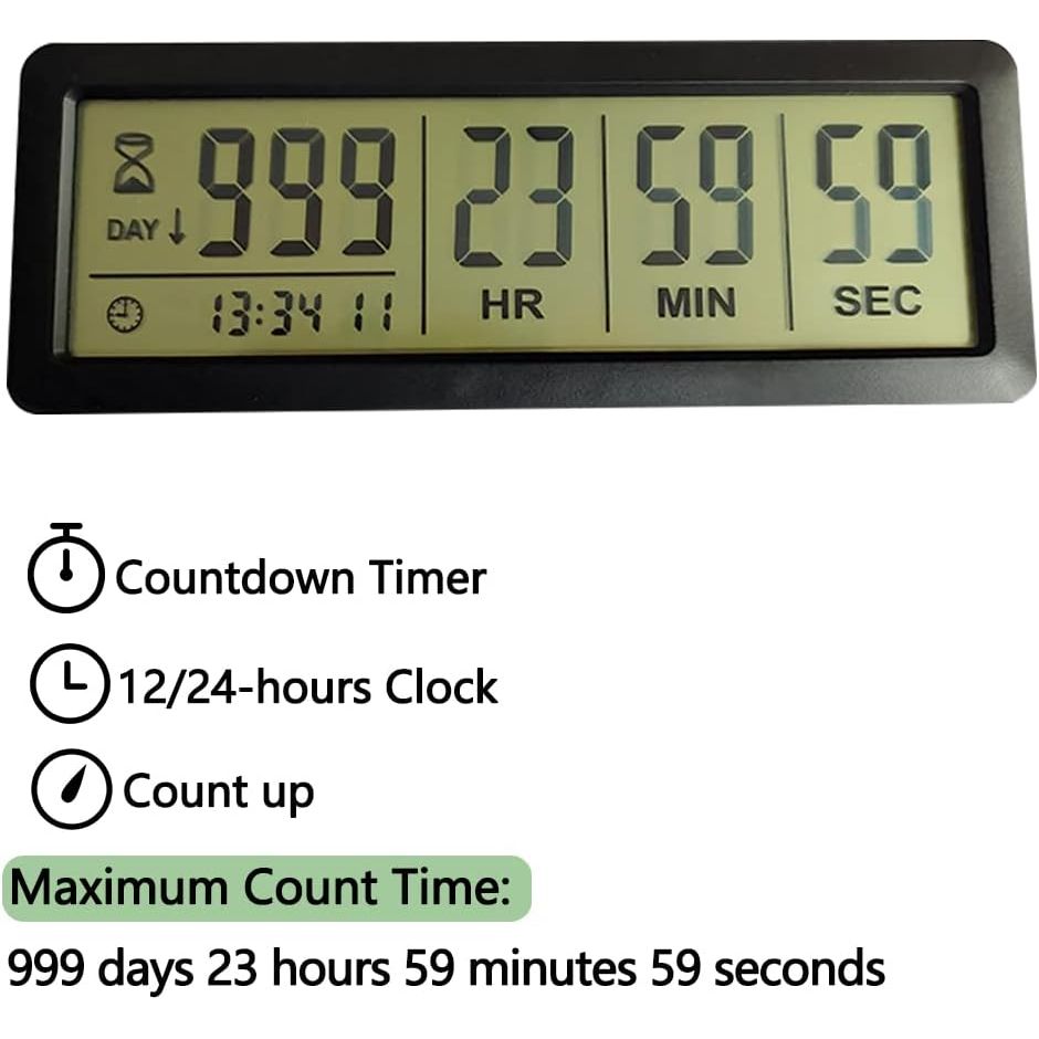 - ✔️LONG SETTING DAYS COUNTDOWN TIMER: 999 days, 23 hours, 59 minutes and 59 seconds.