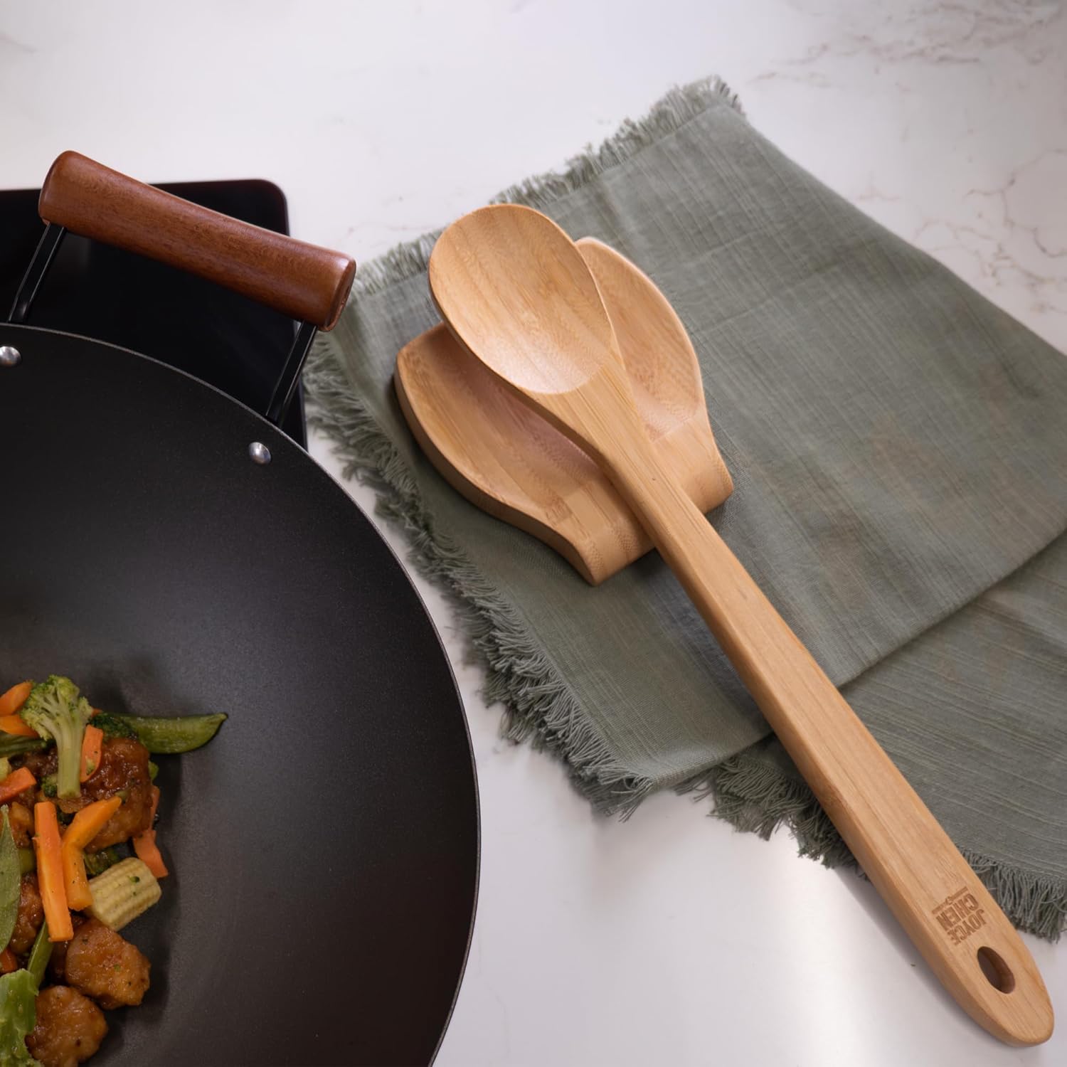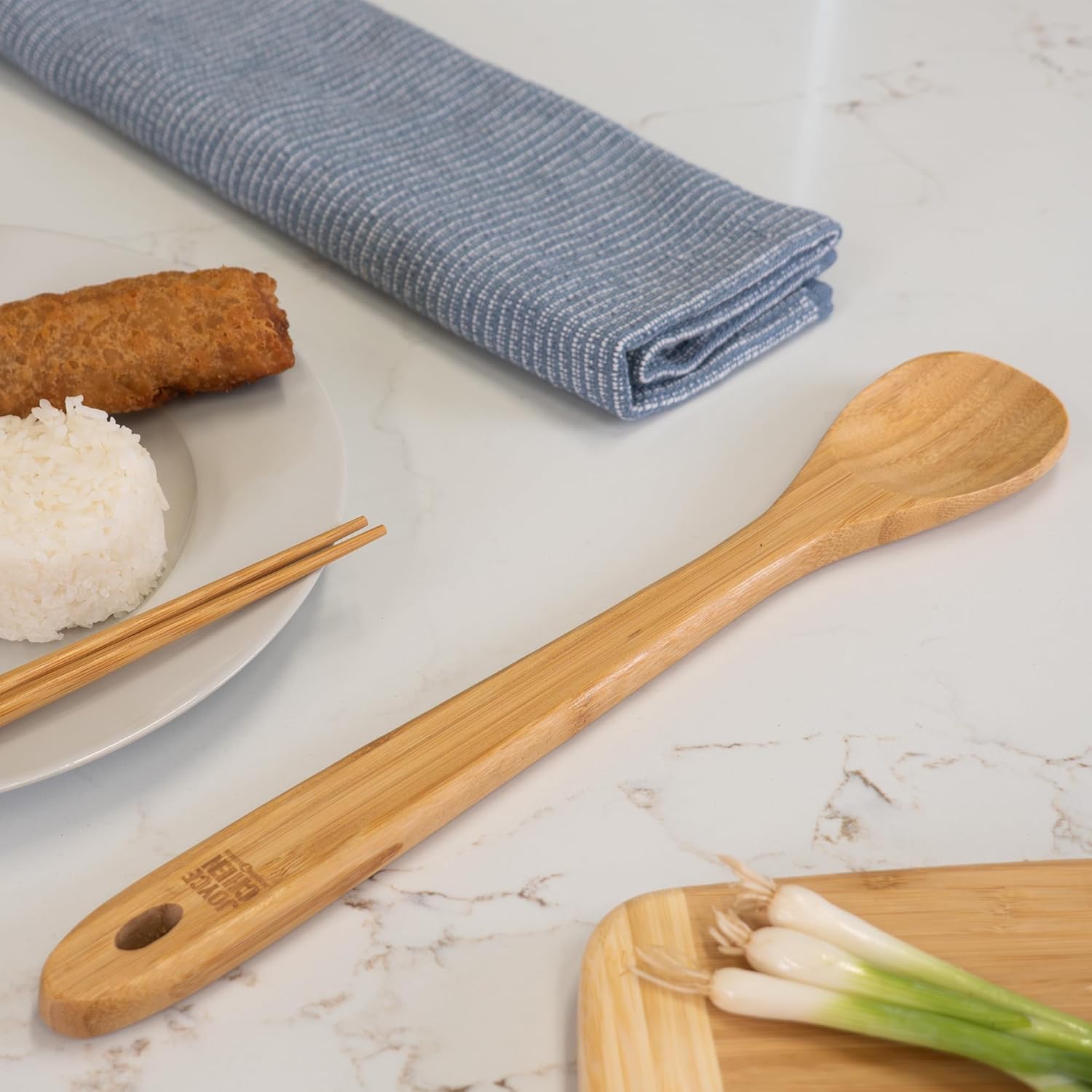 Joyce Chen 15-inch Burnished Bamboo Spoon is beautiful and practical. A handy tool that's gentle on cookware, this spoon is crafted from natural bamboo for an ideal combination of strength and moderate weight. Efficient in action, the spoon won't scratch nonstick cookware or scrape seasoned carbon steel. The 15-inch length keeps hands comfortably far from heat without sacrificing control and the material is moisture-resistant. Safe in the dishwasher. The spoon has been burnished to create a rich, smooth finish. Bamboo which is heat resistant so it stands up to high temperatures, especially from a wok. It won't soften like other wood utensils and is resistant to stains, heat and steam damage.