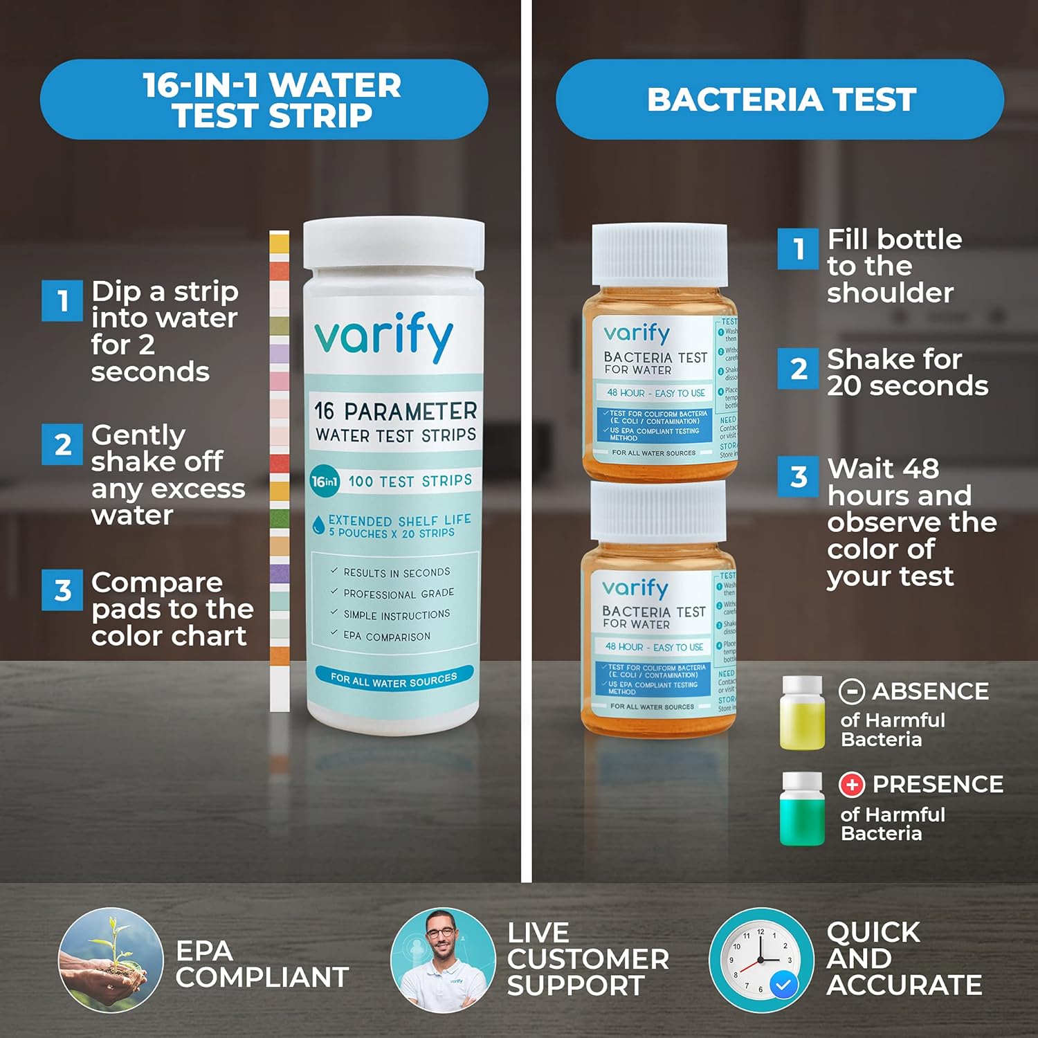 - Varify 17in1 Complete Drinking Water Test Kit - 100 Strips + 2 Bacteria Tester Kits - Well, Tap, Home, City Water Testing Strip for Lead, Alkaline, Chlorine, Hardness, Iron, Fluoride, Copper & More