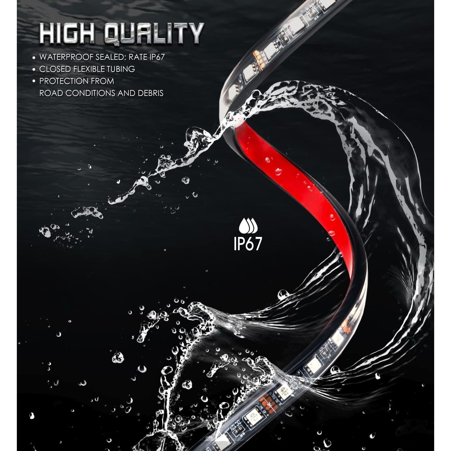 - 【IP 68 Waterproof & Strong adhesive Whole light kit】 The 5050 LED Strips are protected by the Flexible Rubber Tubing, the controller and all connectors are also made of waterproof material, well protected from Road Conditions and Debris and Rain day.