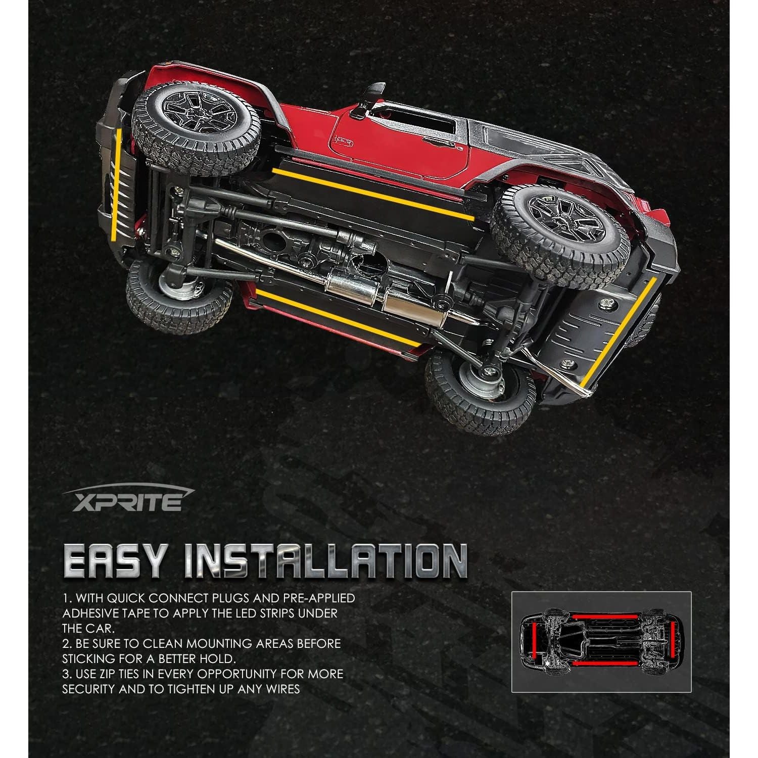 - Xprite Car Underglow Neon Accent Strip Lights, 4 Pcs RGB 252 LEDs Underglow Kit with Sound Active Function Music Mode & Wireless Remote, Exterior Car Lights Underbody Lighting for Truck SUV Van