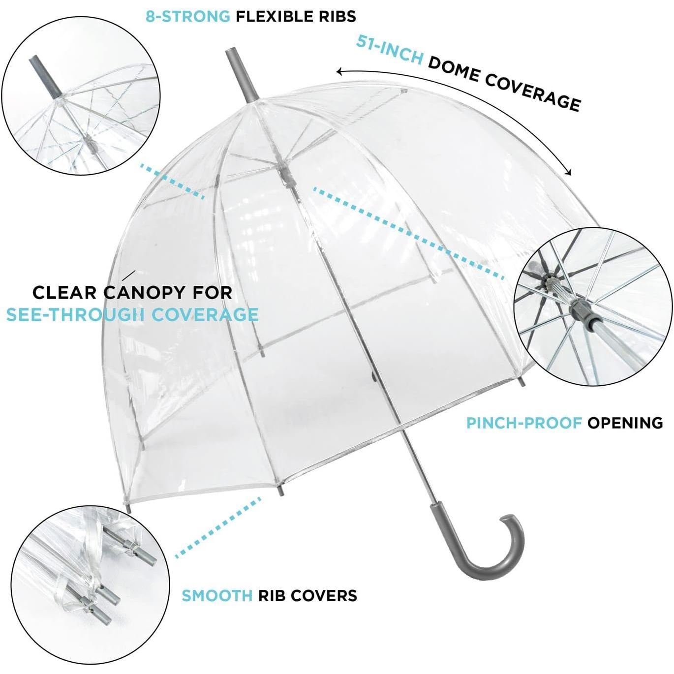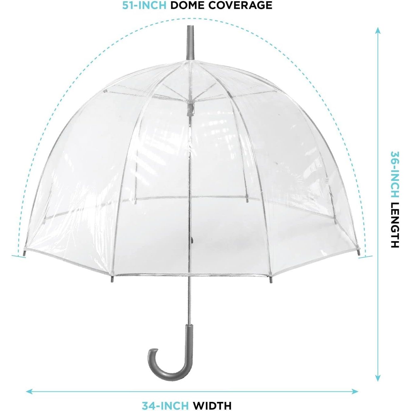 - DURABLE CONSTRUCTION: Our umbrellas are made to last; this clear dome umbrella features a steel shaft with a classic curved handle design, so your umbrella is easy to carry, rain or shine