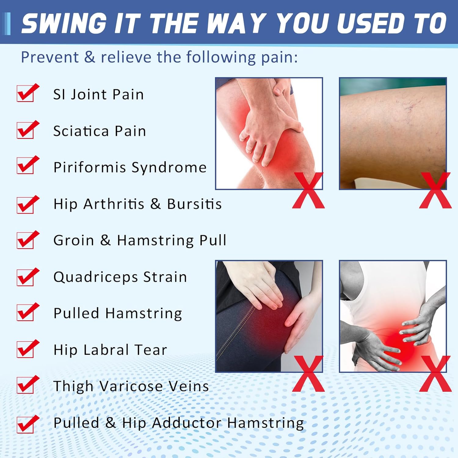 - Applications: Perfect for Recovery and Rehabilitation of Hip Flexor Injury or Bursitis, Groin Area, Upper Thigh, Hamstring, Quads, SI Joint Pain, Tendonitis, Sprains, Inflammation, Stiffening Arthritis Pain, Lower Back and Sciatica Pain Relief, Hip Replacement Surgery Support. For Everyday Use, At Work, Home and House, Gym, Sports Filed, etc,...