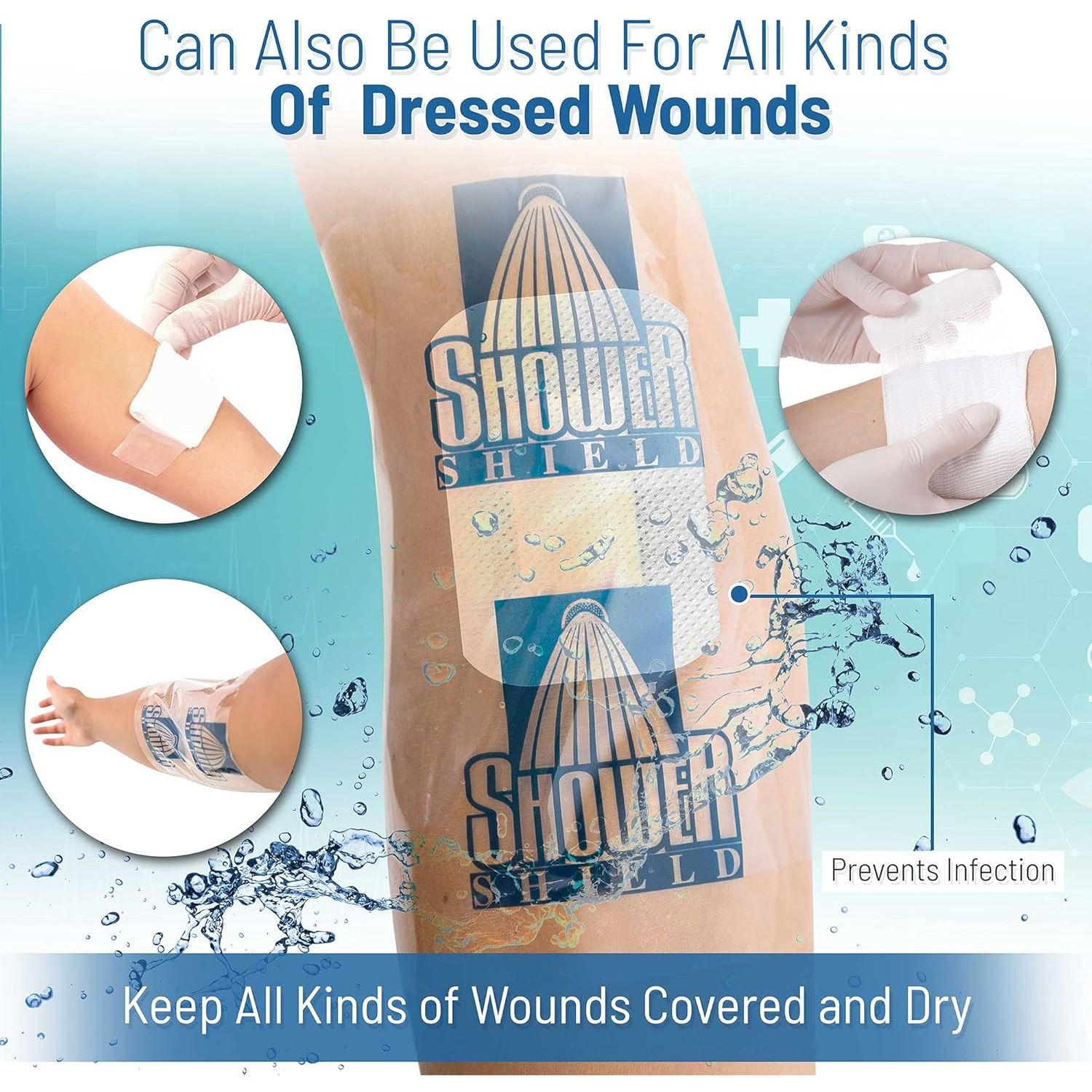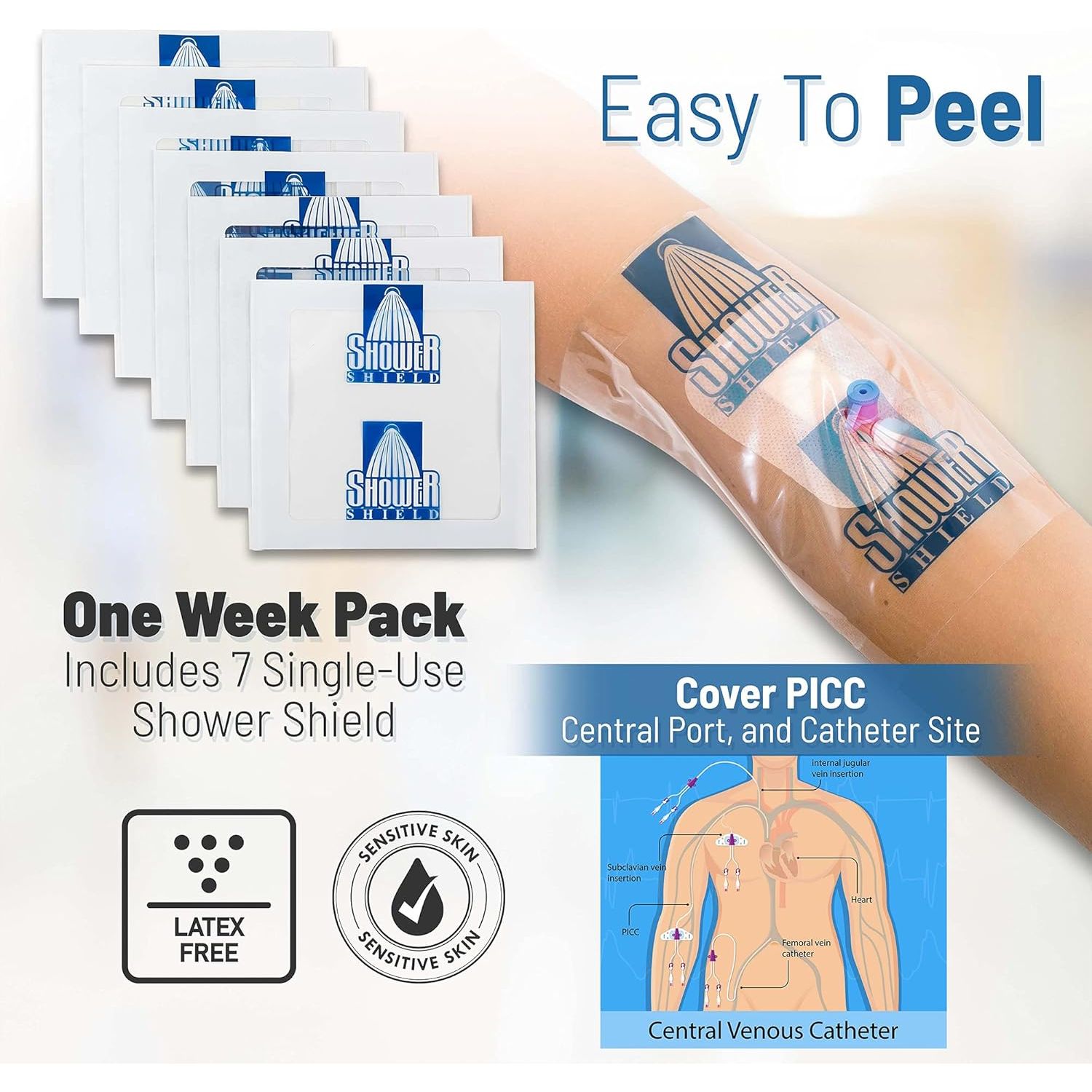 Keep you catheter site, pick line, central ports and dressed wounds covered and dry with this 7 inch by 7 inch Shower Shield water barrier. Prevent infection and reduce dressing changes with our Shower Shield cover, saving you time and money Shower Shield is a single use product, once you apply to skin the seal is not able to be resealed. If adjustment of placement is needed, a new Shower Shield will need to be used to ensure a secure seal..