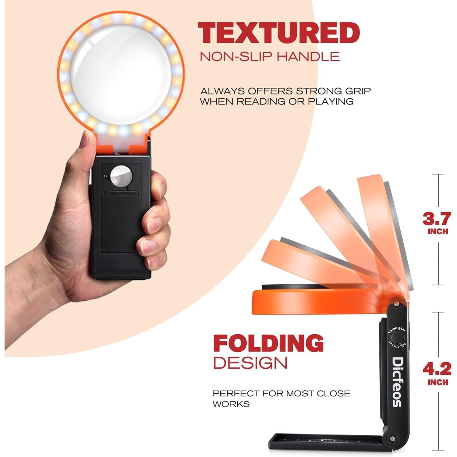 Folding Design - Unlike normal 30X magnifying glass, the folding design allows our magnifying glass can stand on the table as desk lamp or desk magnifying glass. It can be a portable magnifying glass when reading, or it can be a stand magnifying glass when doing close works