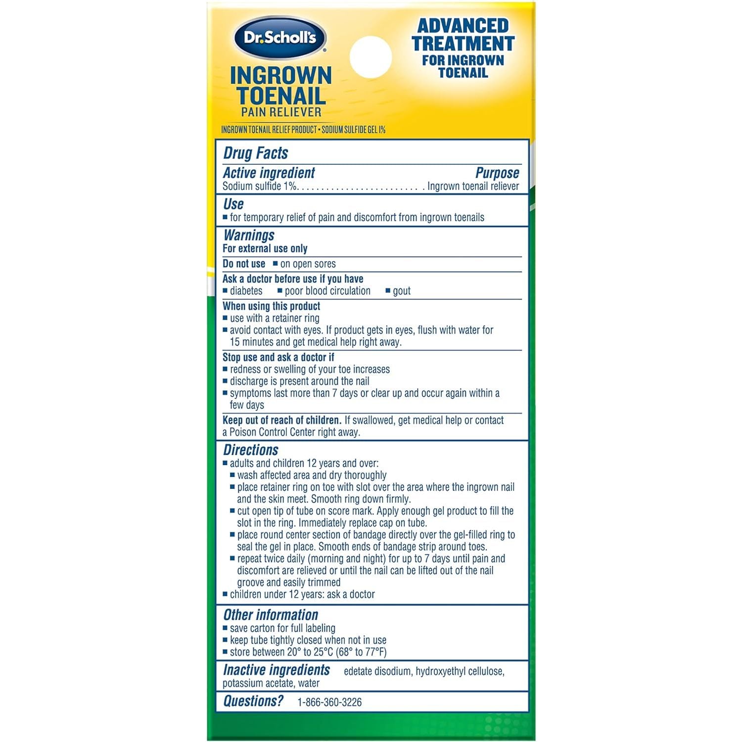 • Ingrown toenails are called onychocryptosis. This is a common condition in which the edge of the toenail grows into the skin of the toe, or the skin of the side of the toe grows over the toenail. While any toe may be affected, it is most common in the big toe. Wearing tight shoes, keeping toenails trimmed too short or rounding toenails may increase your chance of developing ingrown toenails. Dr. Scholl's Ingrown Toenail Pain Reliever relieve ingrown toenail pain at home. Medicated gel quickly penetrates to soften nail, foam ring and bandage cushion and protect affected area. Covered by the Bayer HealthCare LLC – Consumer Health 60-Day Satisfaction Guarantee. See below for details