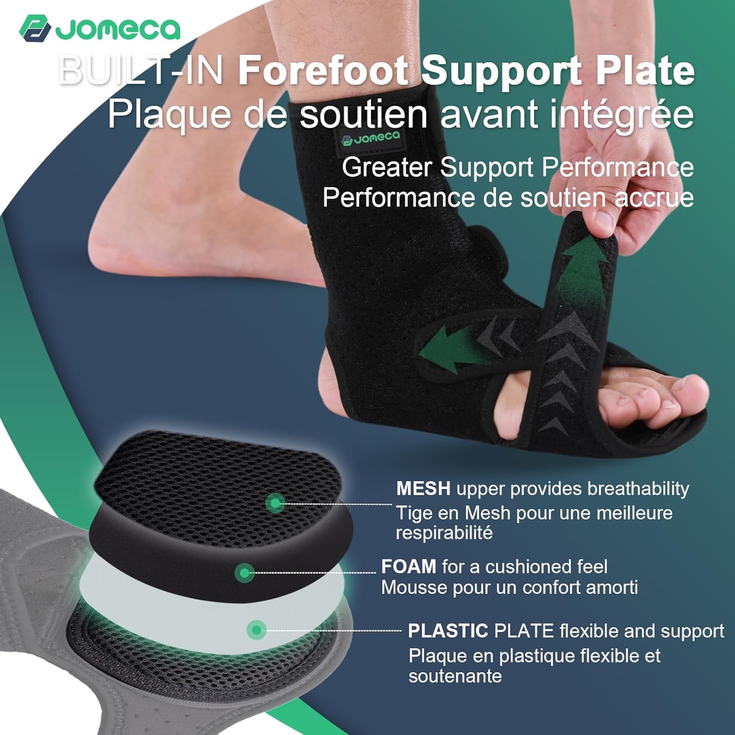 - Comprehensive Upgrade- JOMECA foot drop brace features built-in forefoot support plate works together with cross straps to correct inversion or eversion. AFO foot drop brace comes with arch bracket offers compression, adjust foot varus and valgus, effectively improve lower limb balance. open-heel and toe design foot drop brace for walking increase flexibility, freeing up space of heel and toes for more coziness.