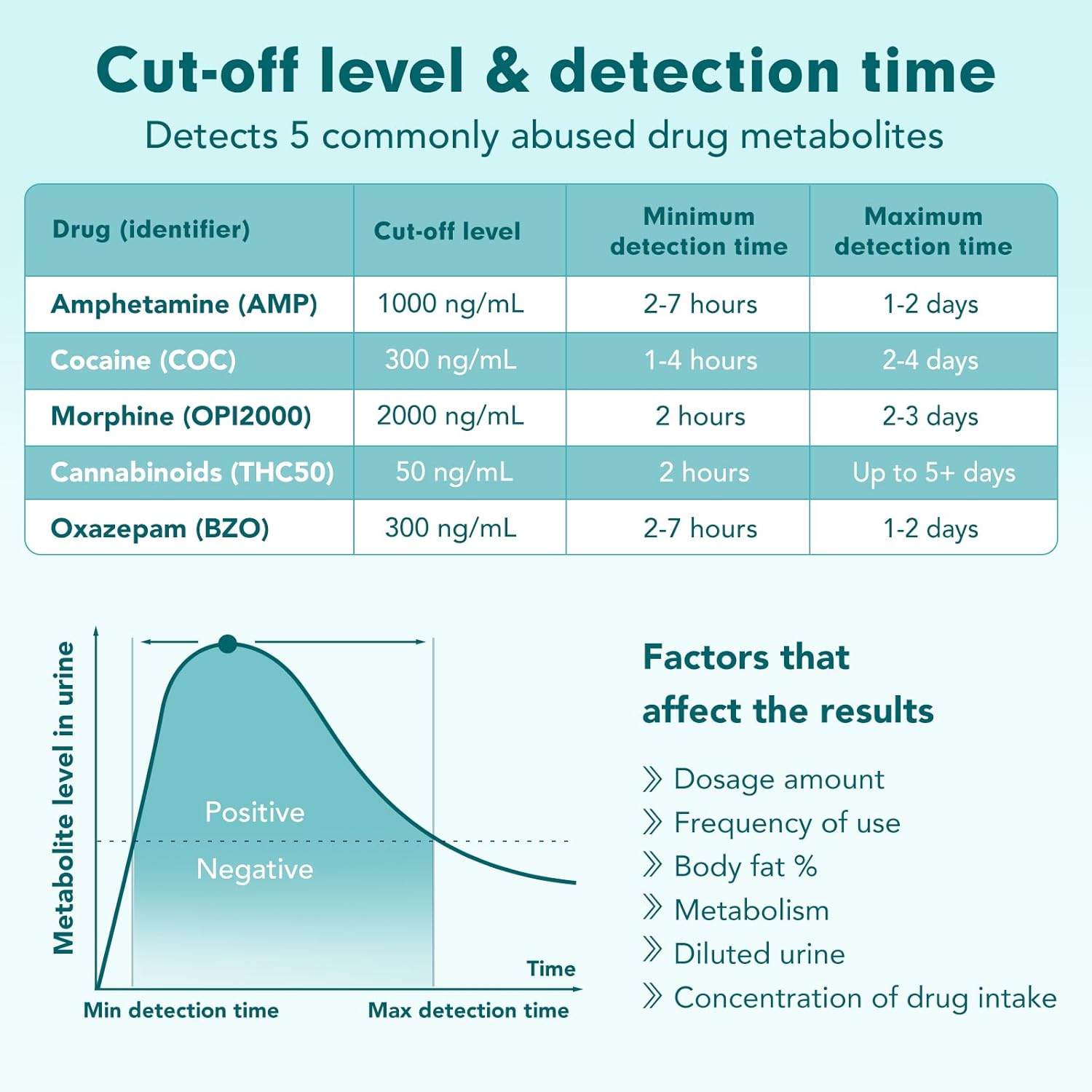 - ACCURATE AND RELIABLE: Reliable drug test detecting five widely-used substances,Amphetamine (AMP)-1000 ng/mL, Oxazepam(BZO)-300 ng/mL, Cocaine (COC)-300 ng/mL, Morphine (OPI 2000)-2000 ng/mL, Cannabinoids (THC)-50 ng/mL.