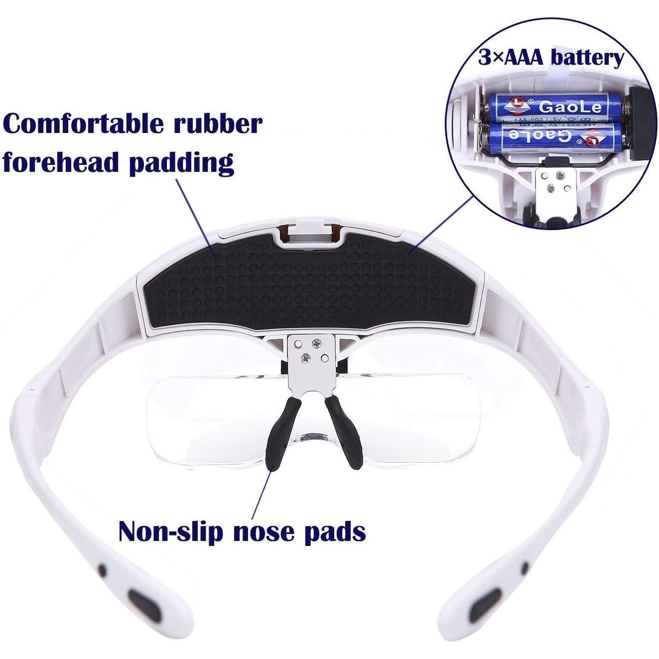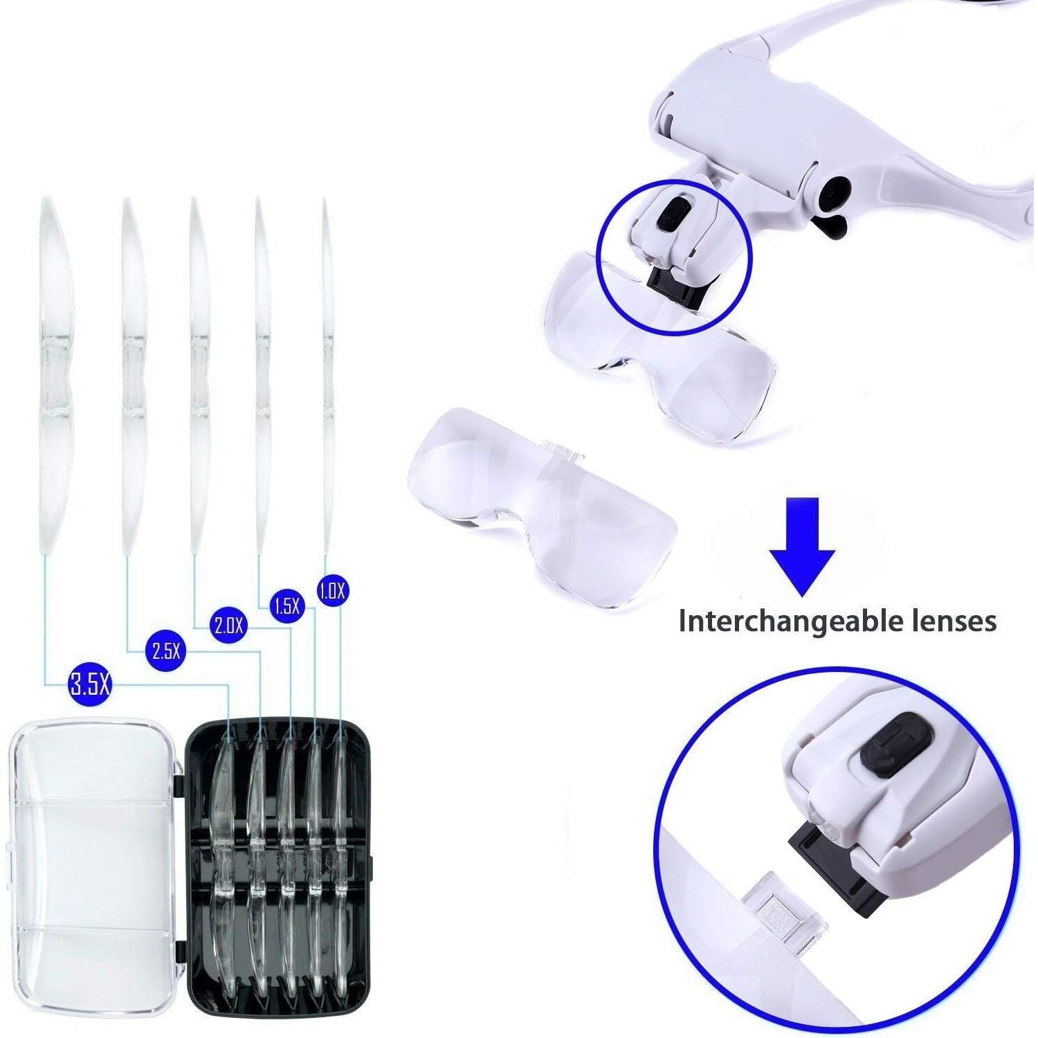- Headband Magnifier Glasses LED Magnifying Loupe Head Mount Magnifier Hands—Free Bracket and Headband are Interchangeable 5 Replaceable Lenses1.0X,1.5X,2.0X,2.5X,3.5X (Upgraded Version)